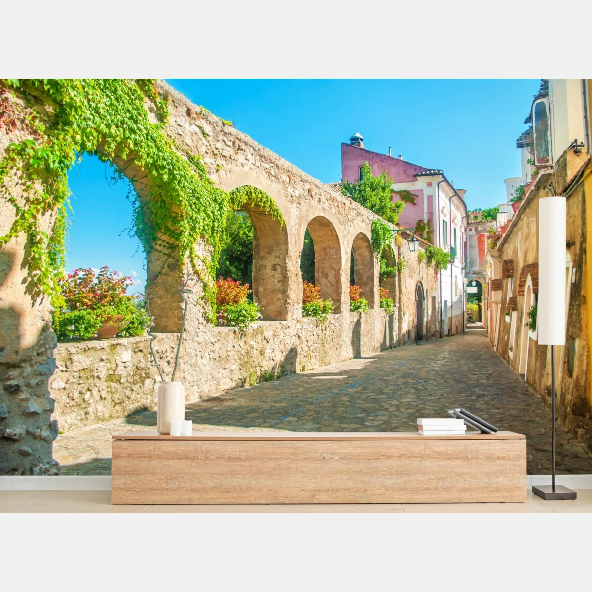 - letni, kwiaty, włochy, słoneczny, bluszcz, wybrzeże amalfi, brukowana ulica, ravello, kamienny mur, łuki