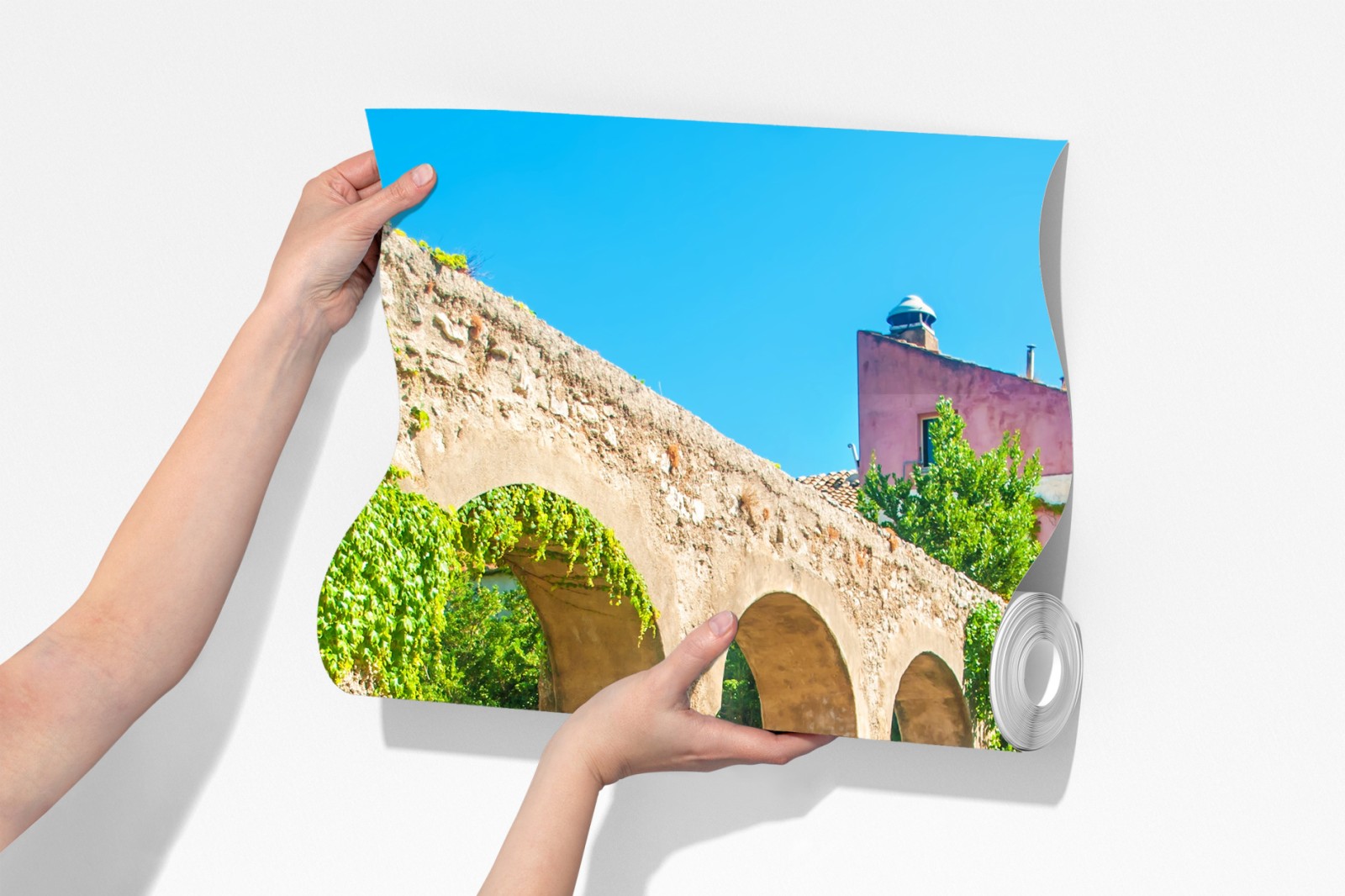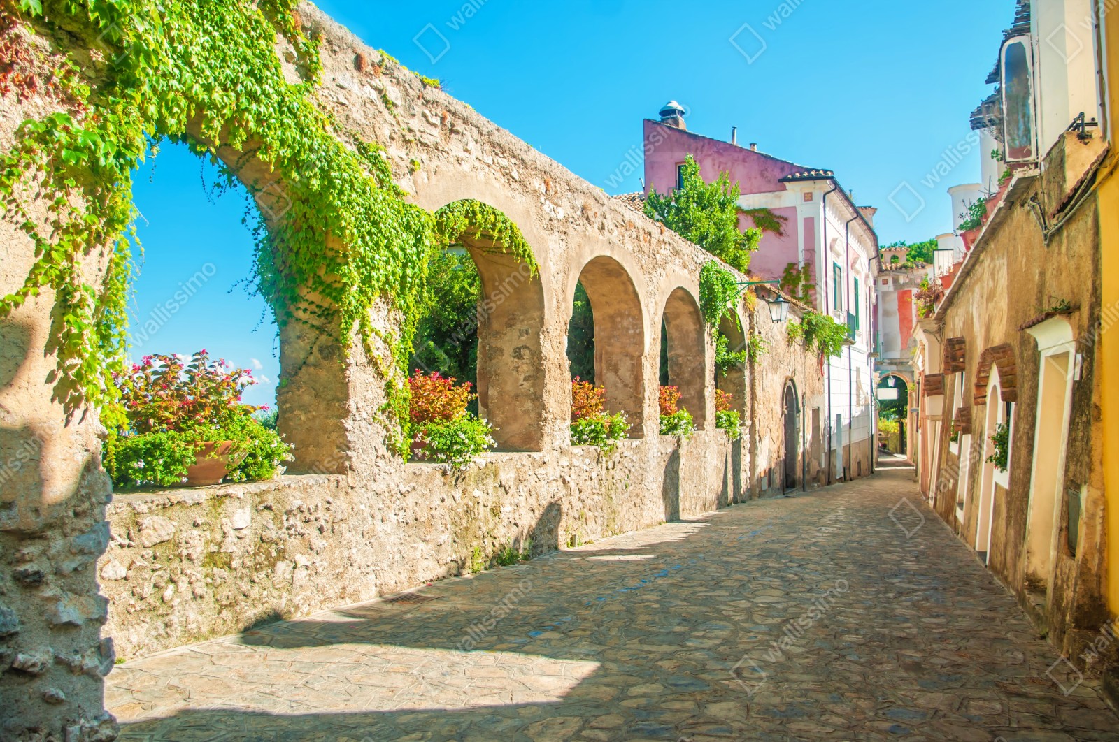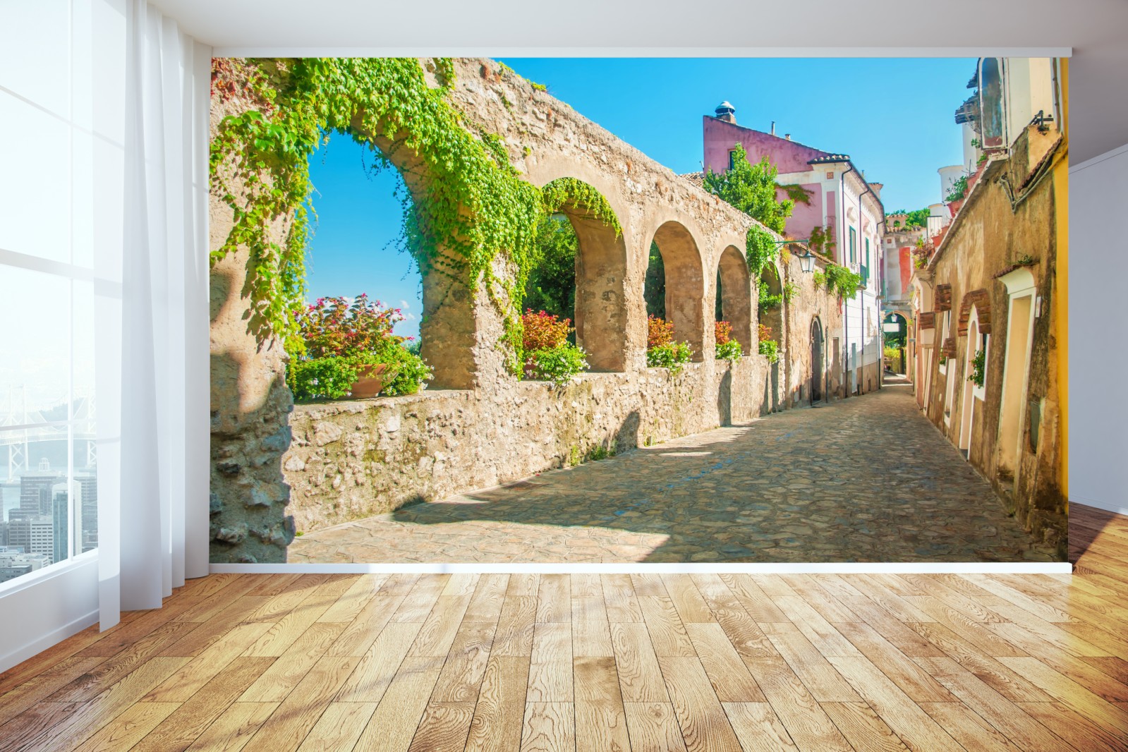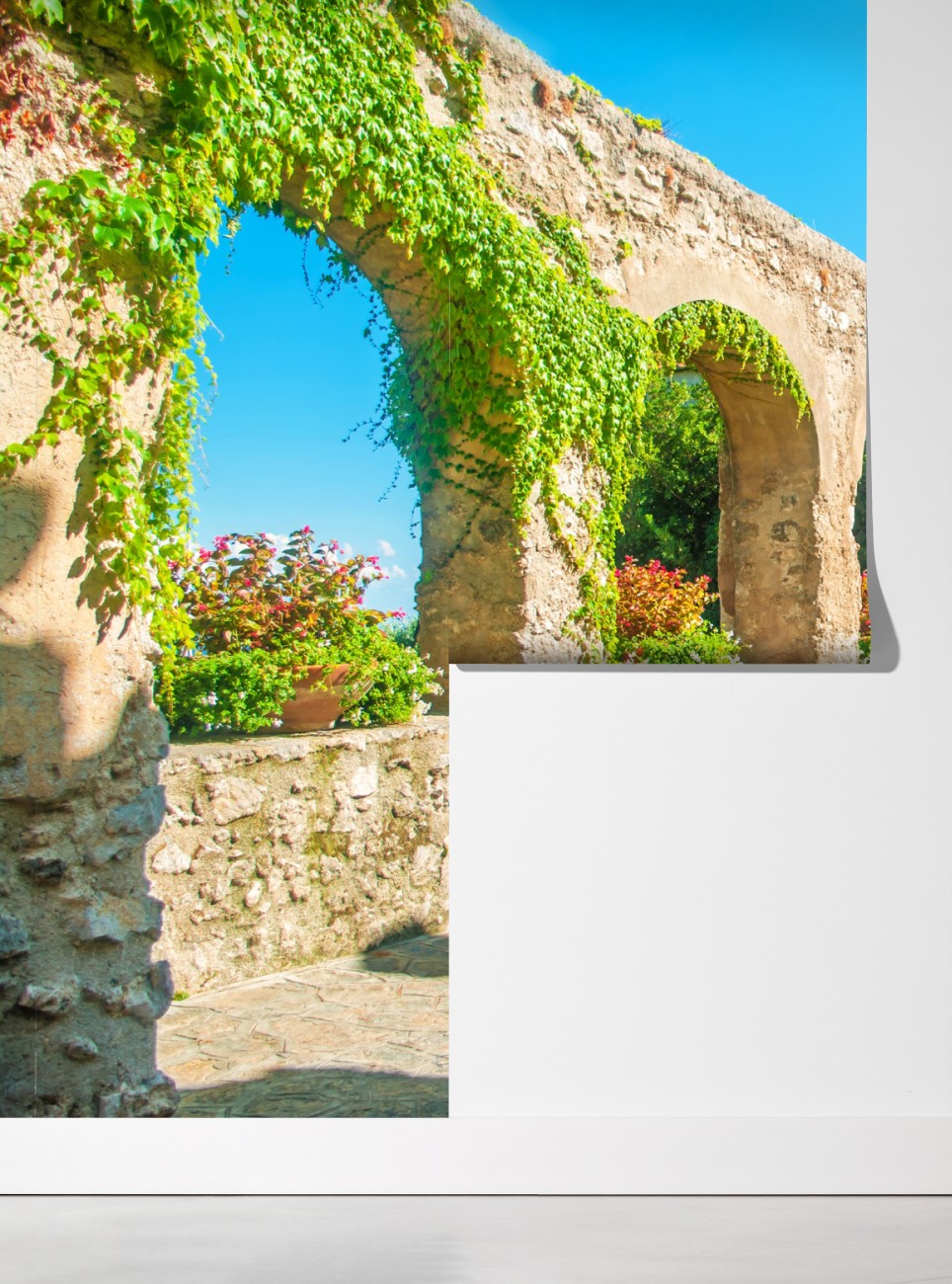 Wprowadź nadmorski urok Wybrzeża Amalfi do wnętrza dzięki tej słonecznej scenerii z Ravello, z kamiennymi łukami, bluszczem i kolorowymi kwiatami.