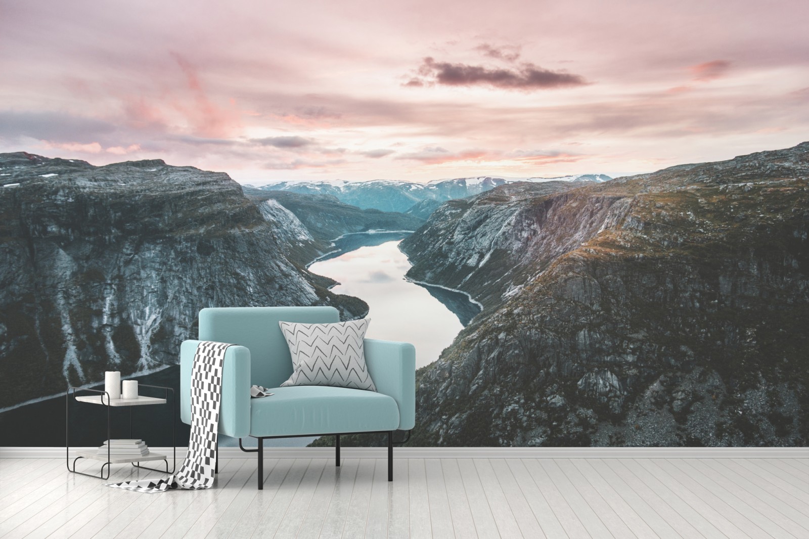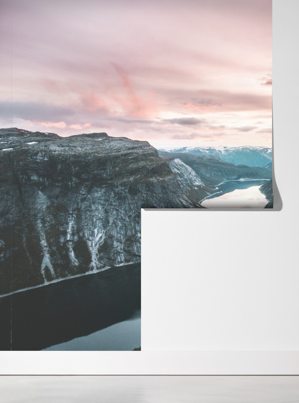 Wprowadź do wnętrza uspokajający krajobraz fiordu z pastelowym niebem i dramatycznymi klifami.