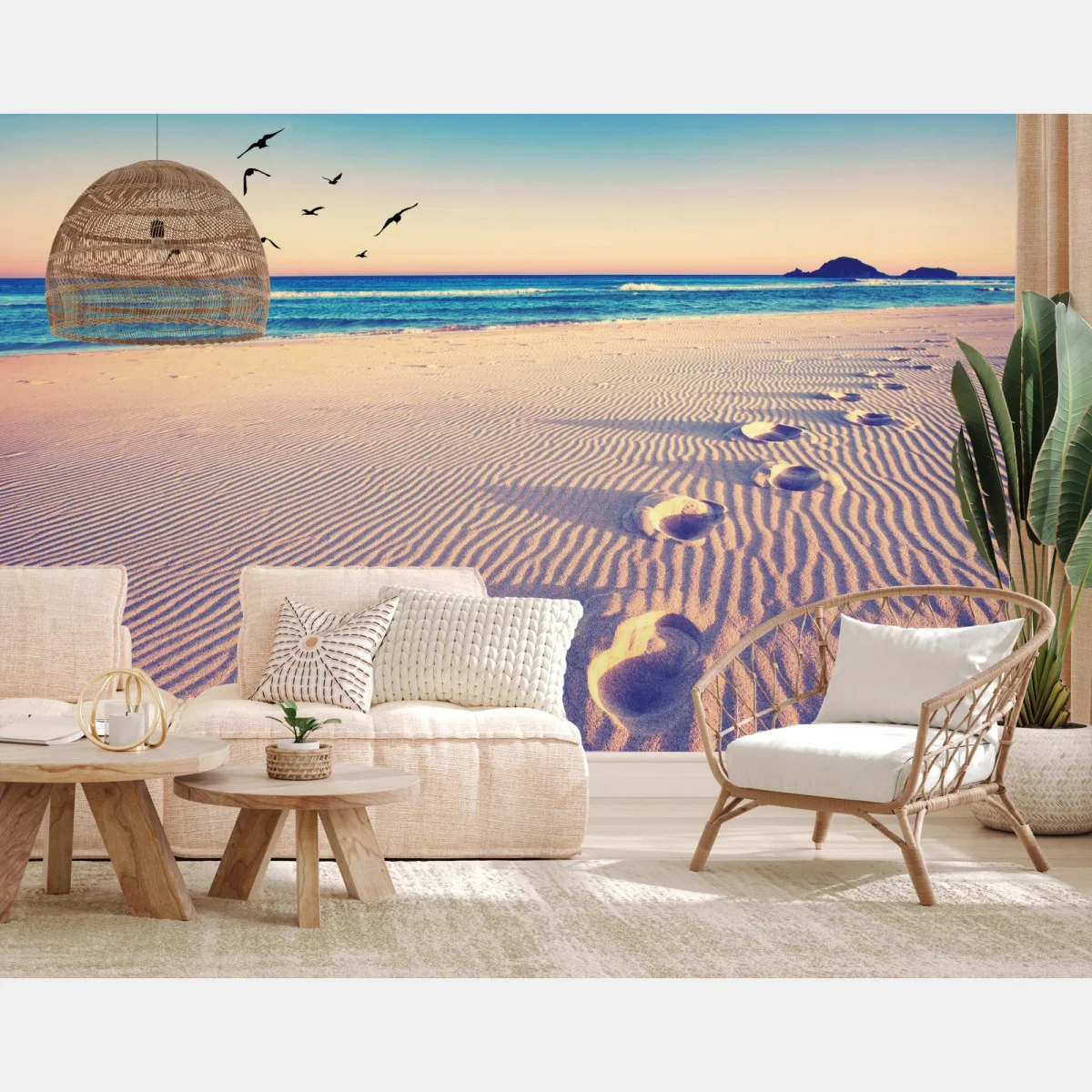 - ocean, lato, wybrzeże, wyspa, zachód słońca, plaża, piasek, fale, mewy, odciski stóp