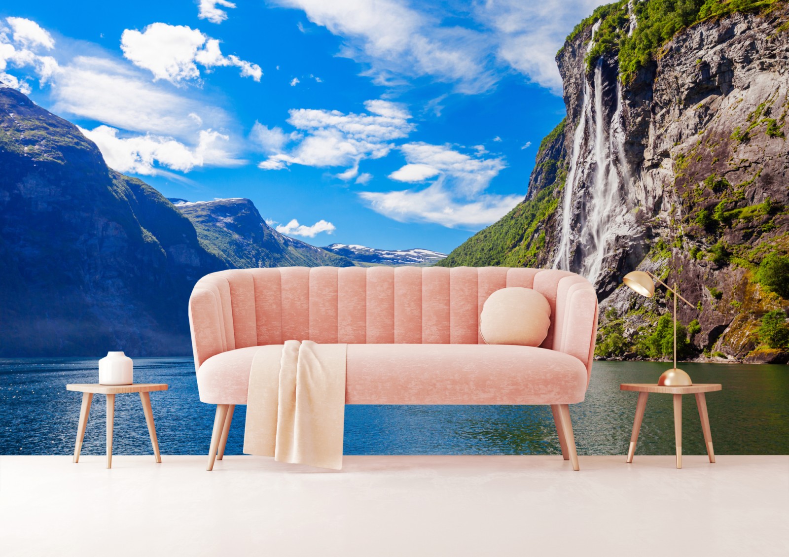 Dodaj do wnętrza zapierający dech w piersiach widok wodospadu Siedem Sióstr w Geirangerfjord, z krystalicznie niebieską wodą i bujną zielenią.