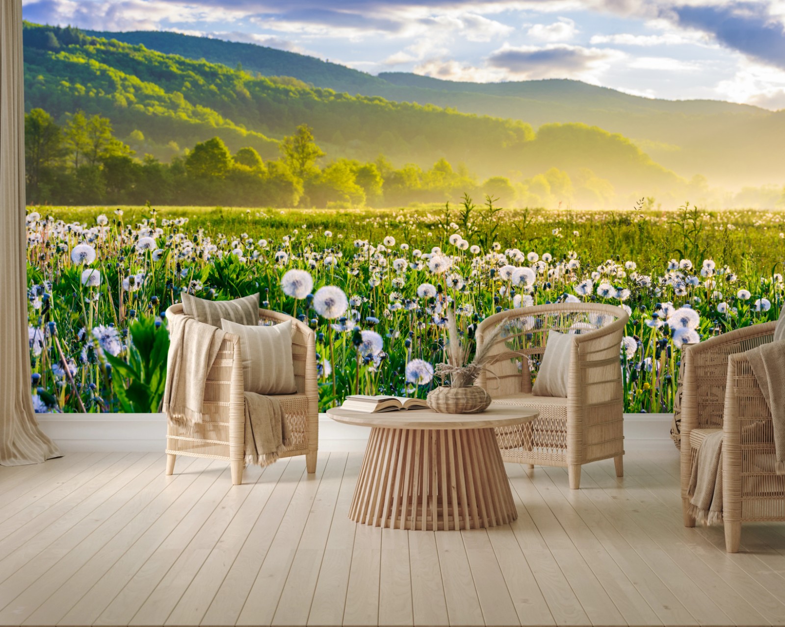 Fototapeta Mglista łąka mleczy o wschodzie słońca