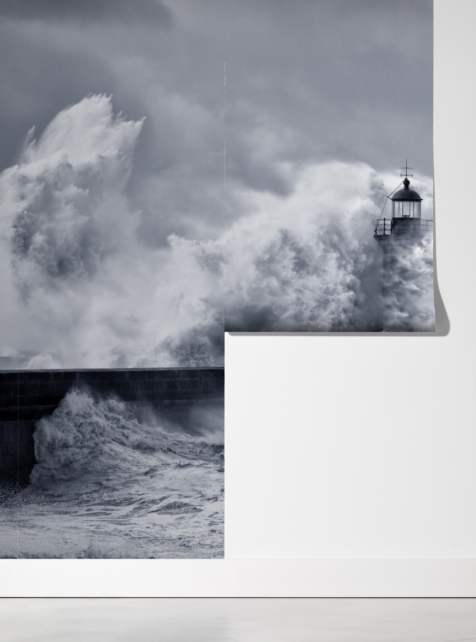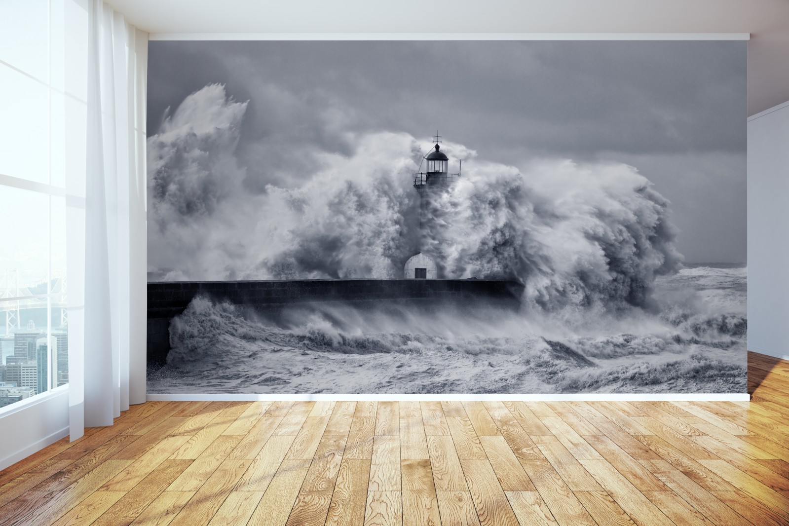 Poczuj surową siłę oceanu dzięki temu dramatycznemu, niebiesko-zanurzonemu zdjęciu latarni morskiej obleganej przez ogromne fale.