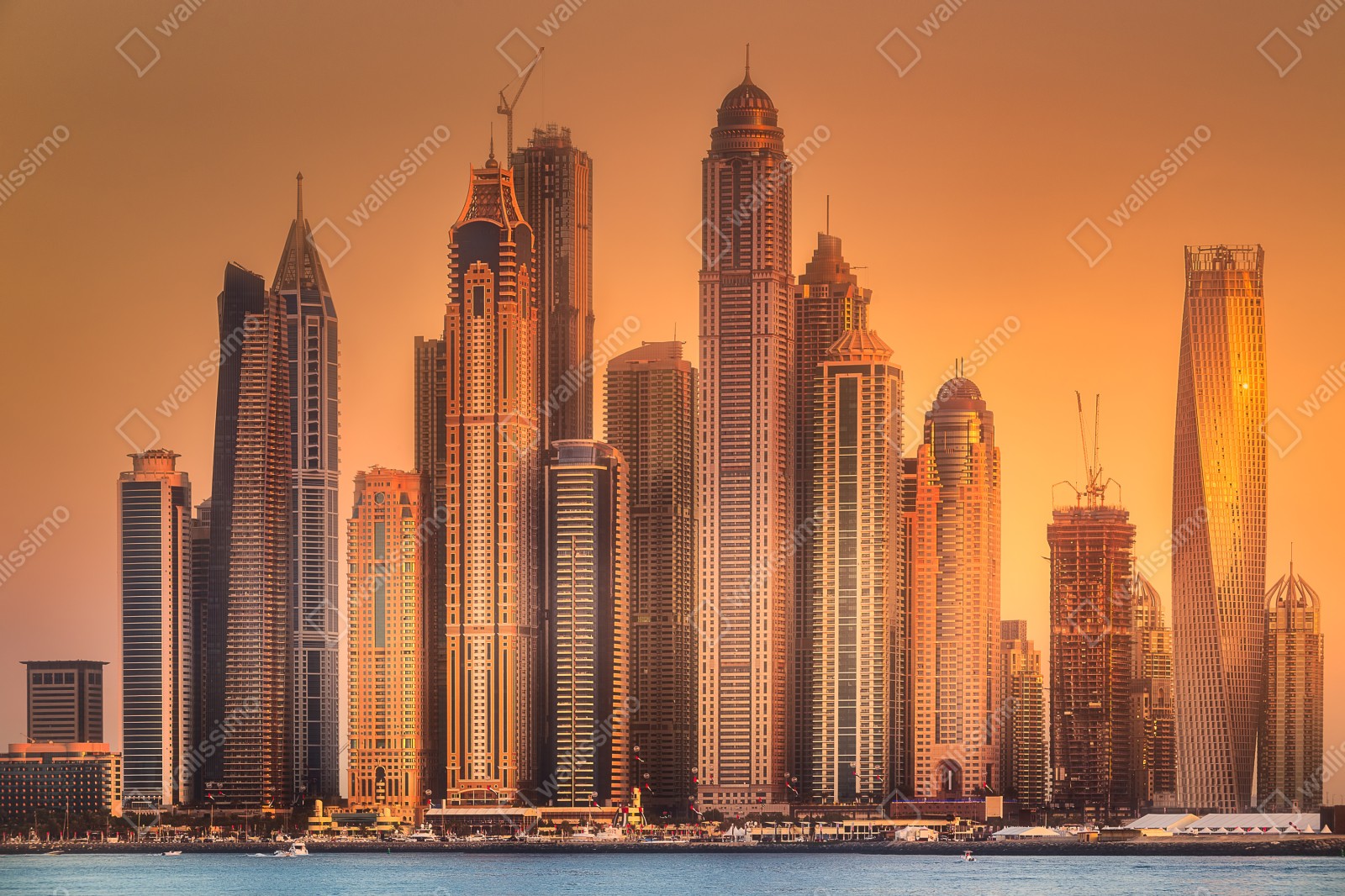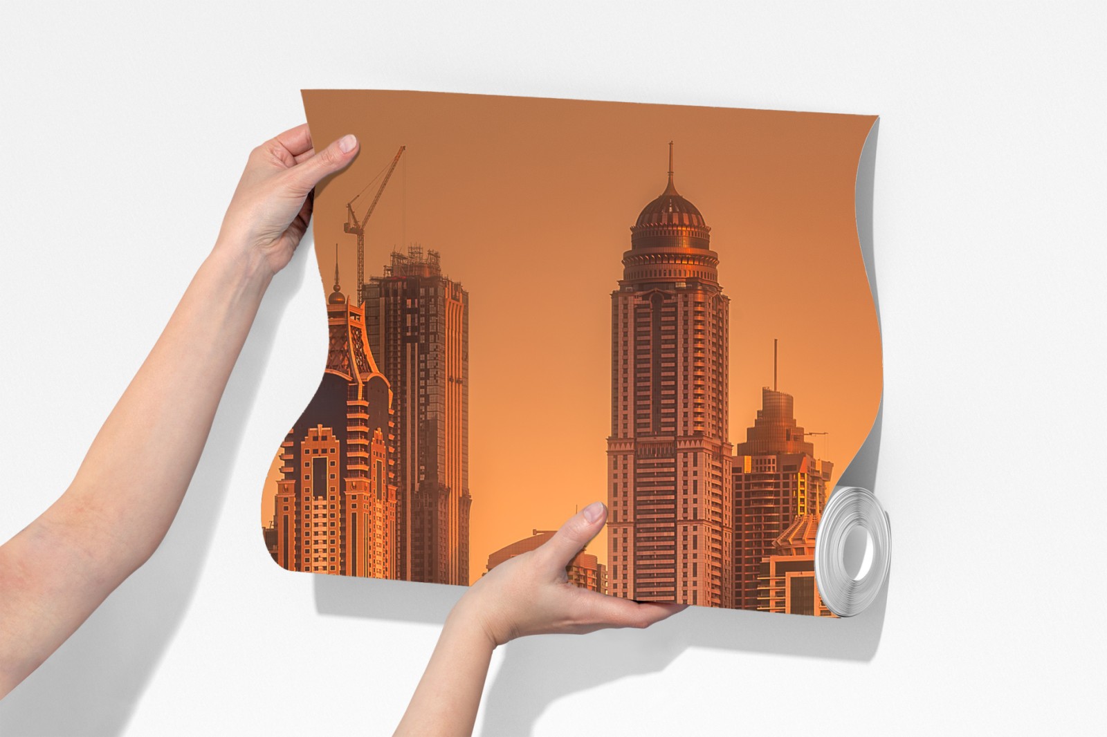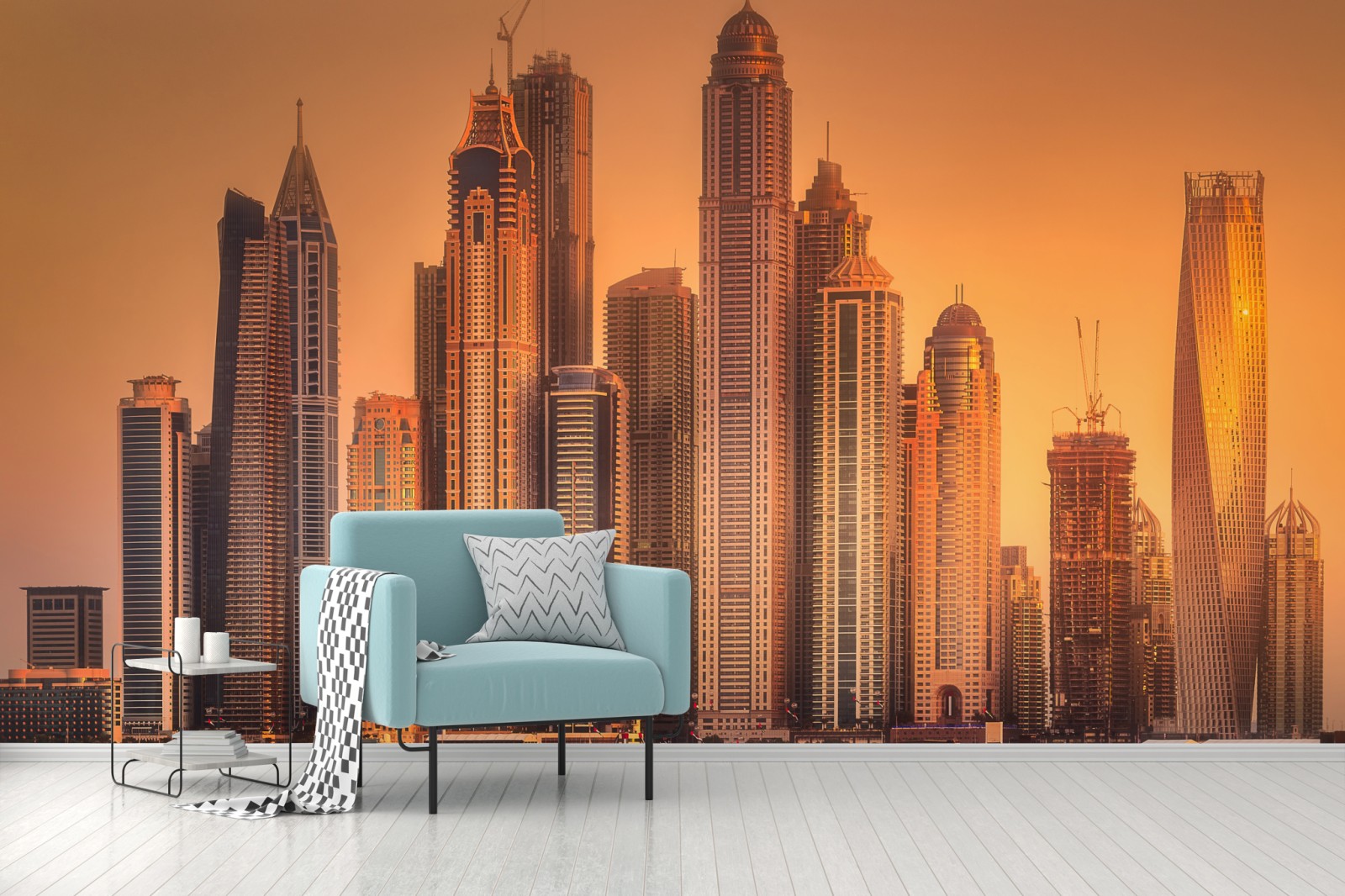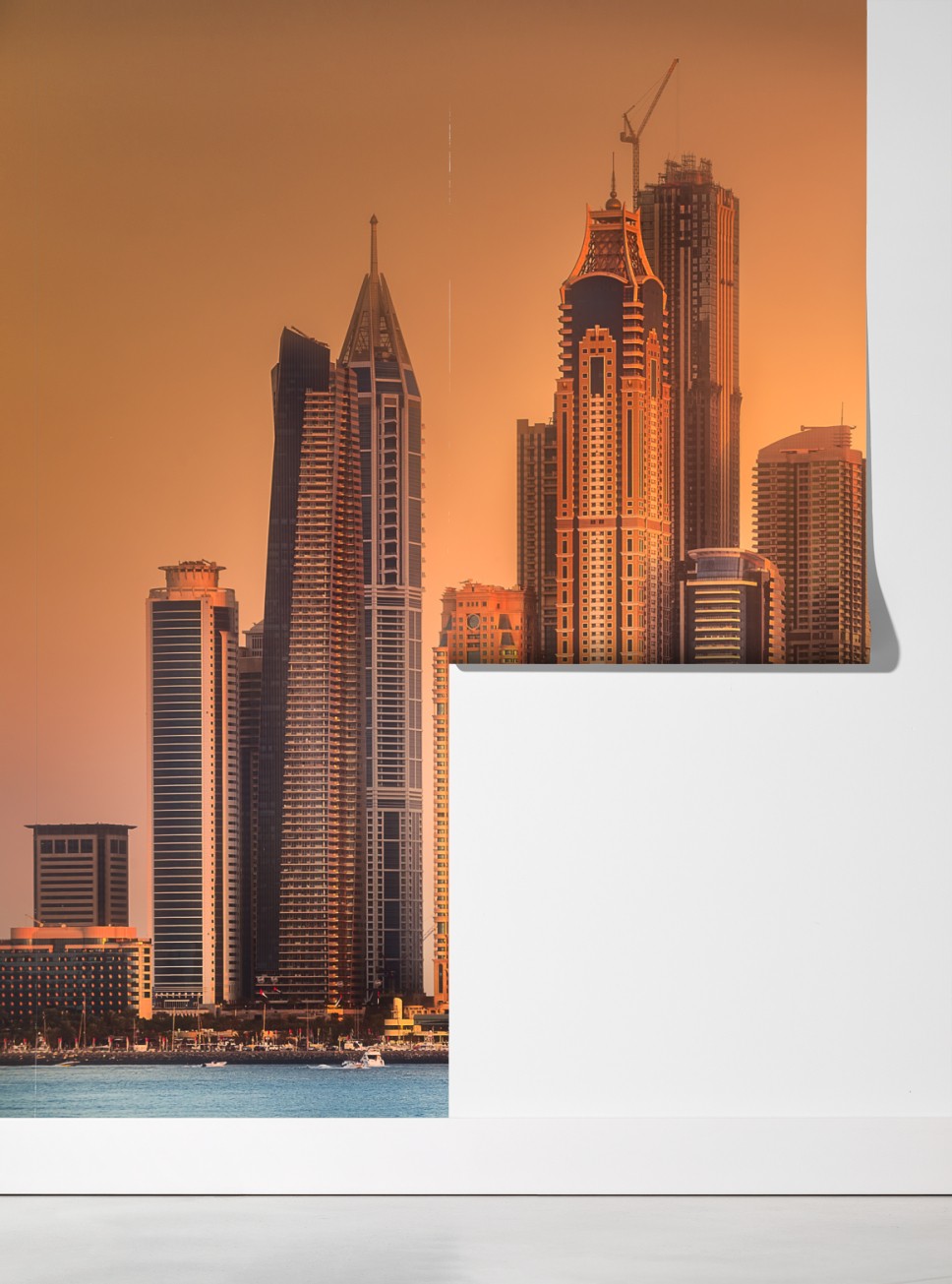 Dodaj wnętrzu nowoczesny charakter dzięki panoramicznemu widokowi Dubaju w złotym świetle, który ociepla przestrzeń i podkreśla miejską elegancję.