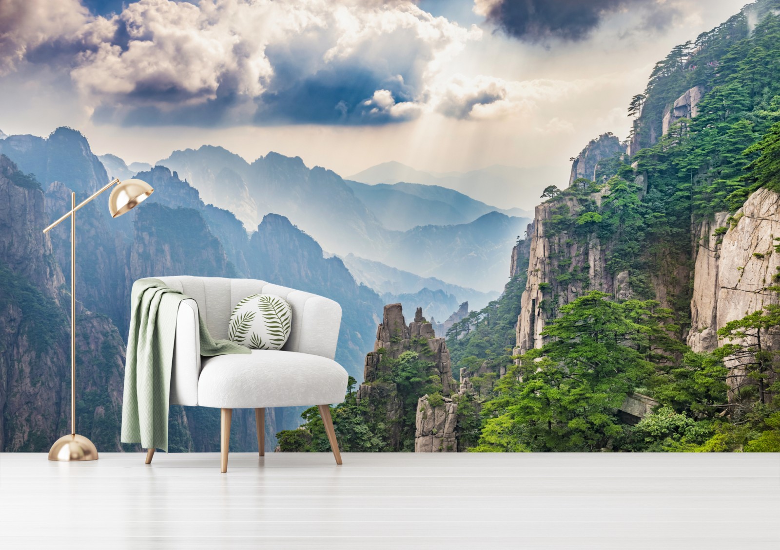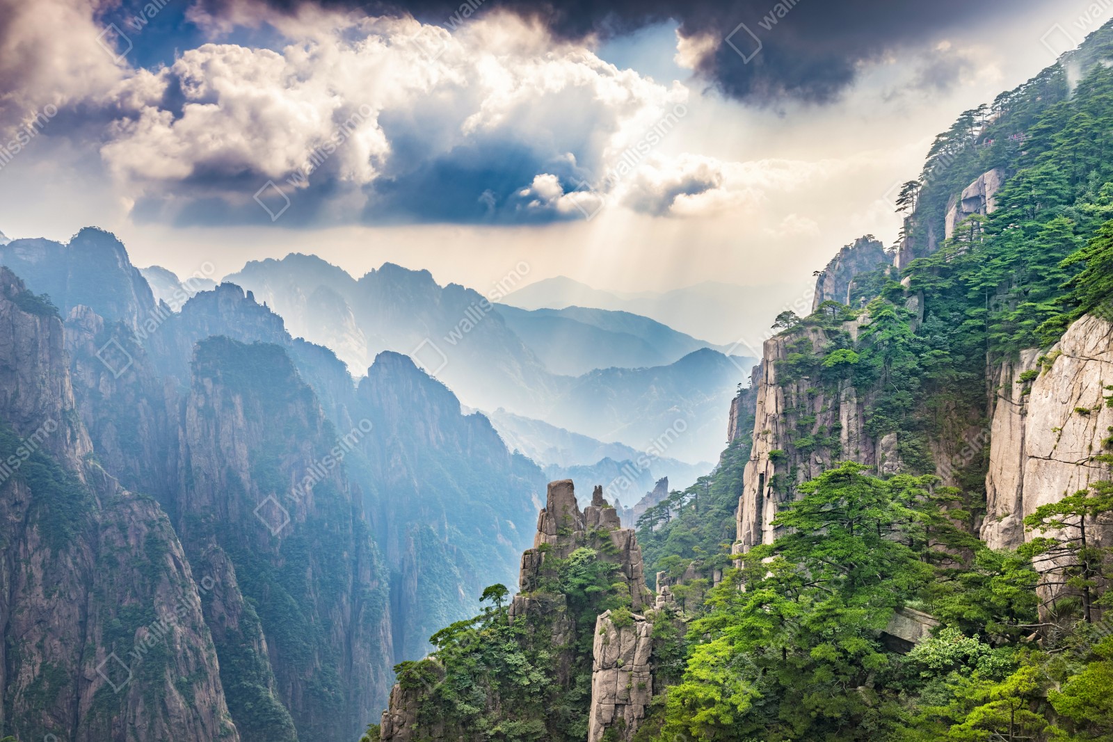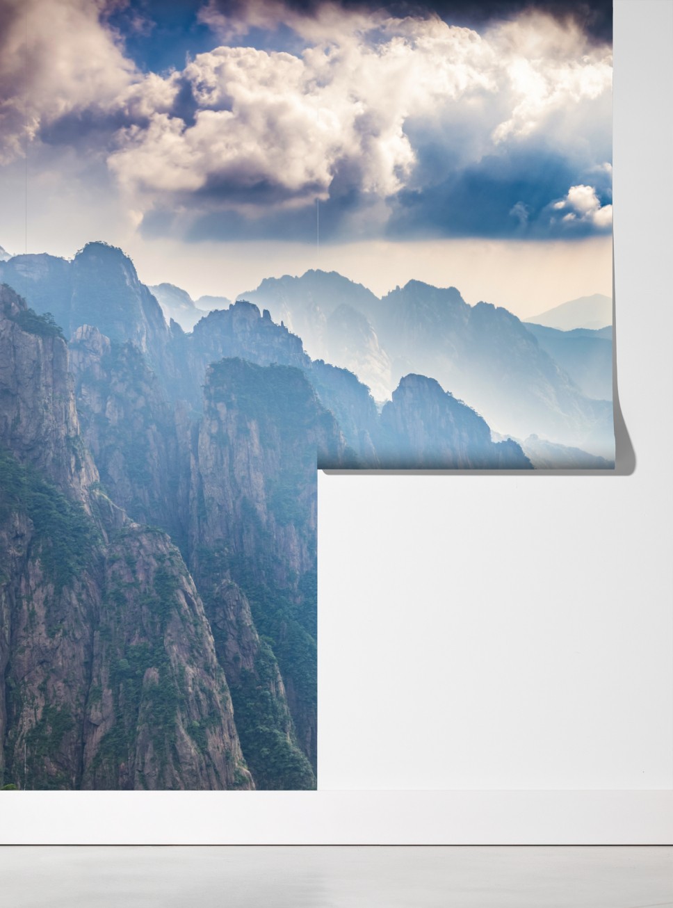 Poczuj spokój górskiej scenerii z dramatycznymi klifami, bujnymi lasami i promieniami słońca przebijającymi się przez chmury.
