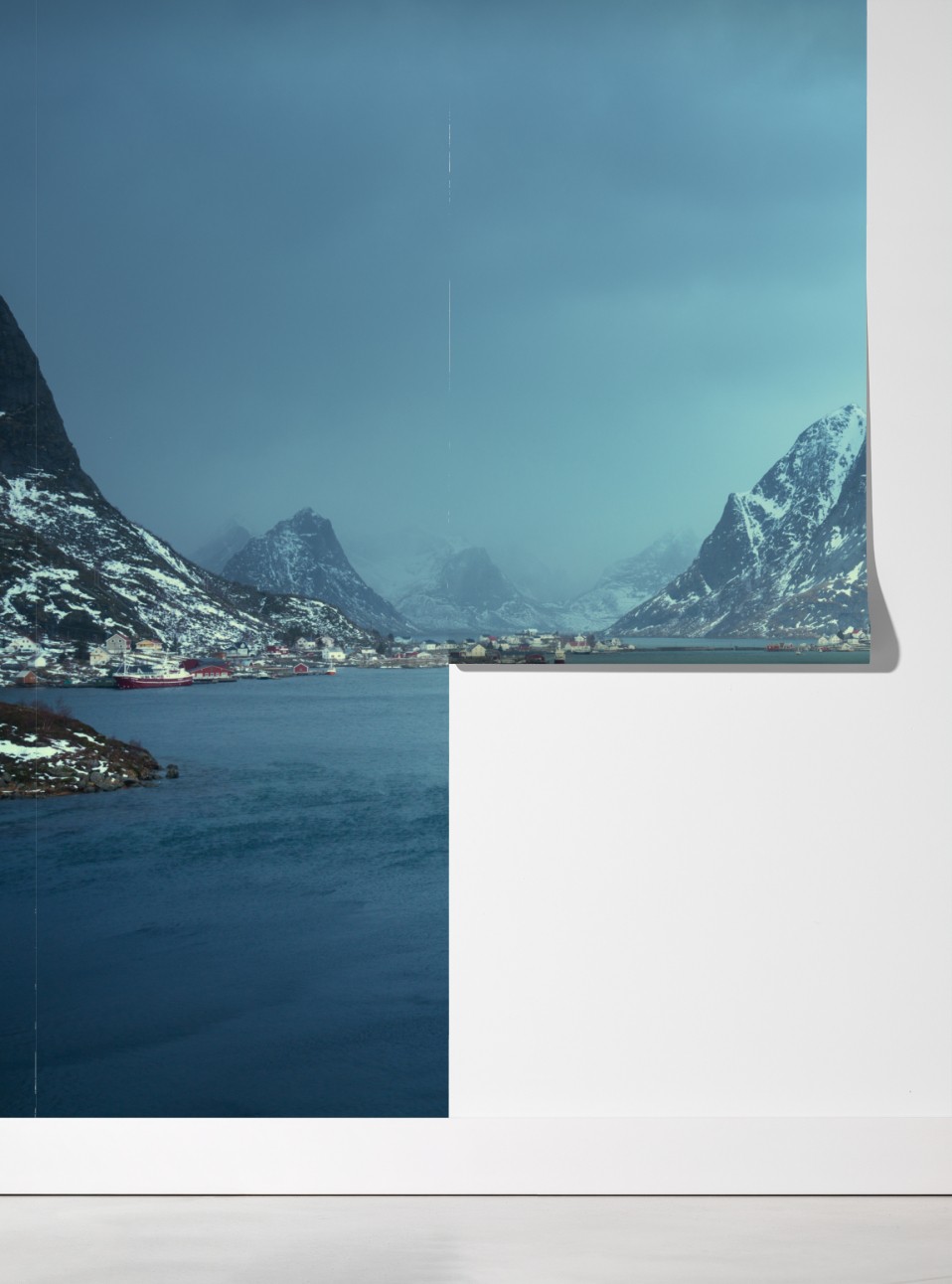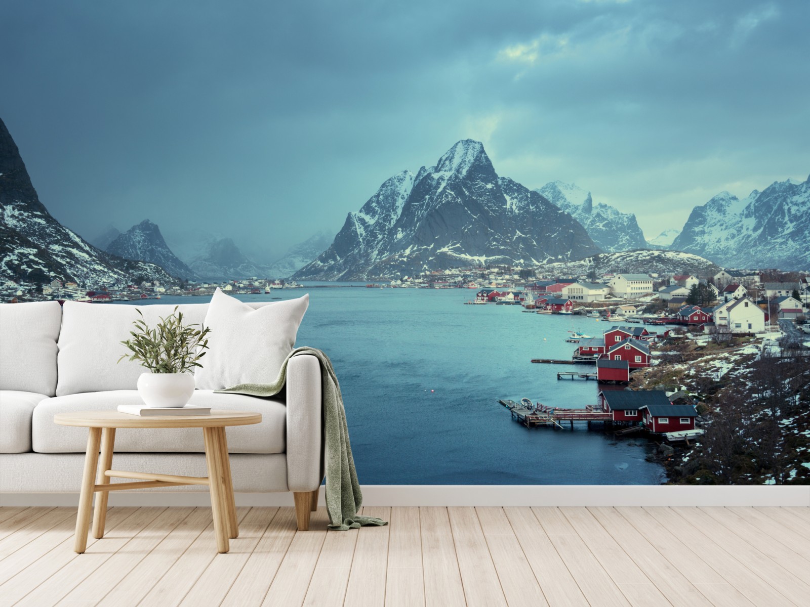 Przenieś spokojną scenerię Reine z ośnieżonymi górami i czerwonymi domkami do swojego wnętrza.