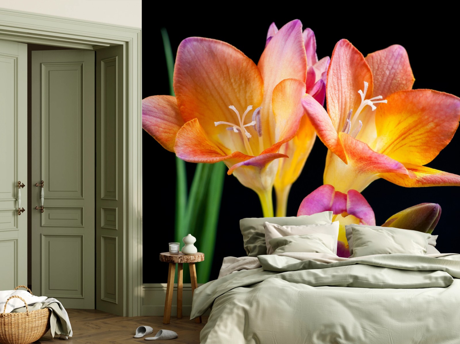 Fototapeta Żywe pomarańczowe frezje na czarnym tle