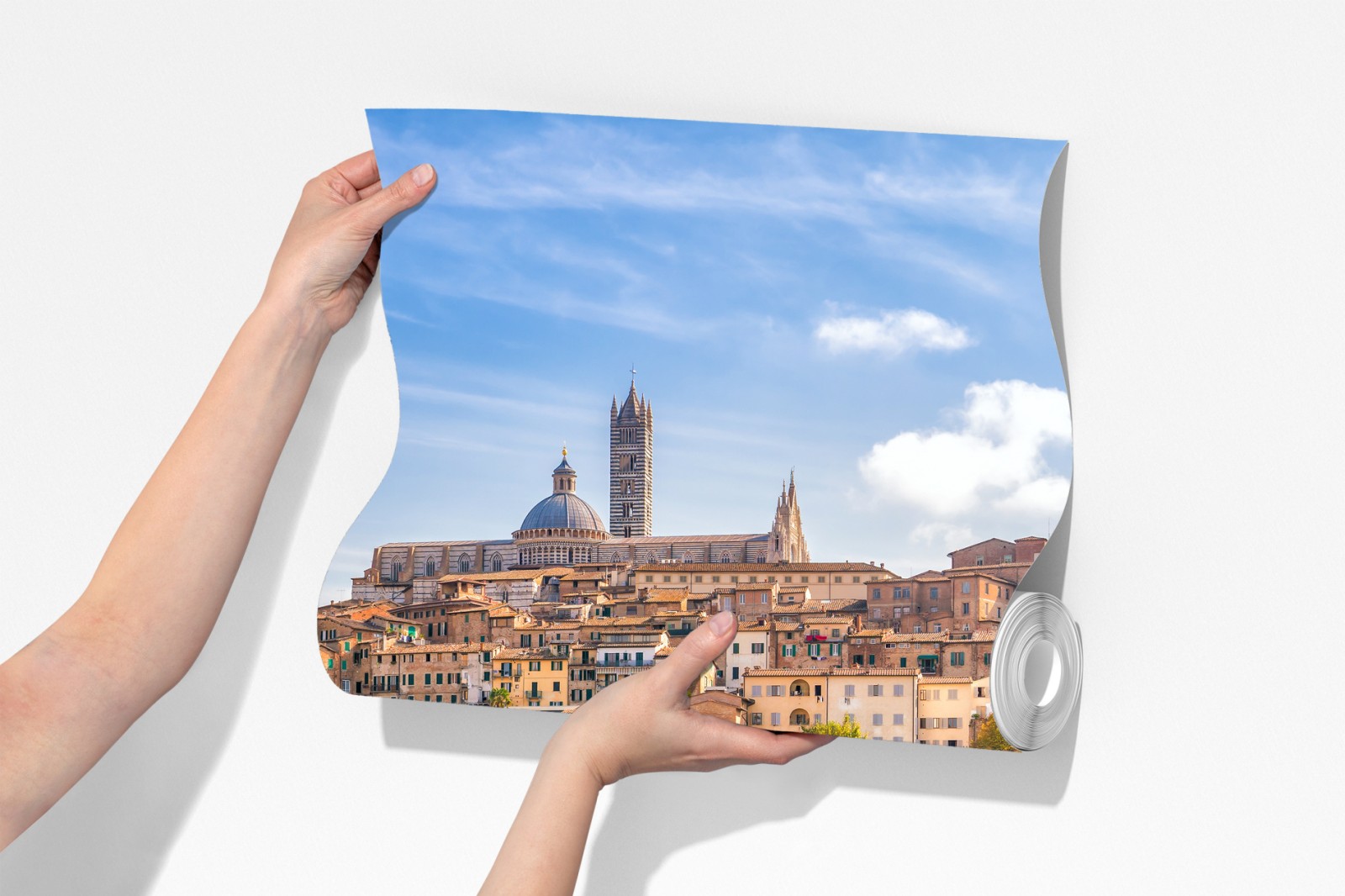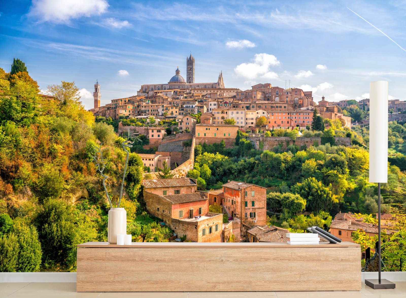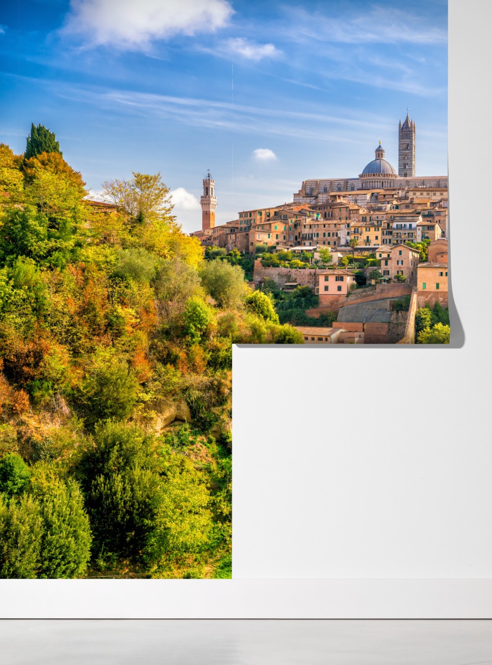 Poczuj ponadczasowy urok Sieny dzięki tej żywej panoramicznej scenerii zabytkowego centrum i zielonych toskańskich wzgórz.
