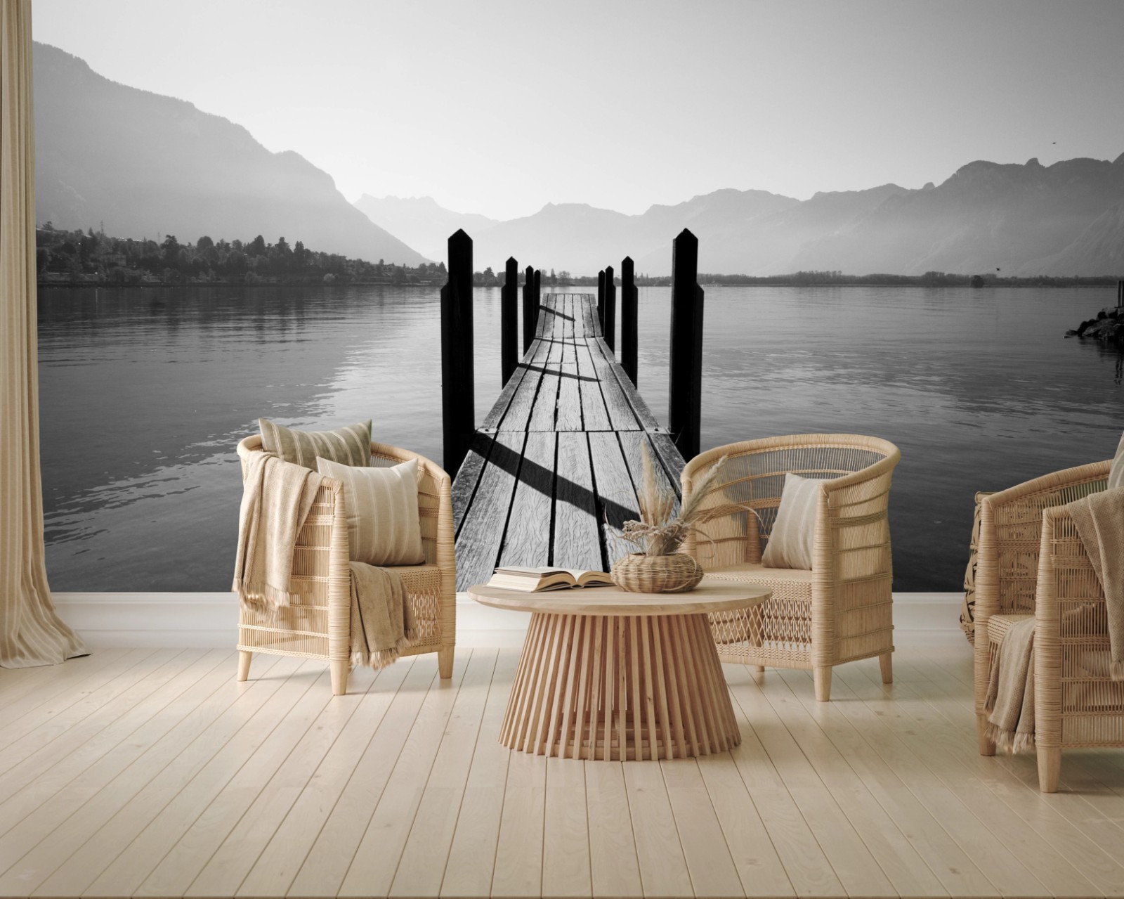 Fototapeta Spokojny pomost nad jeziorem w czerni i bieli