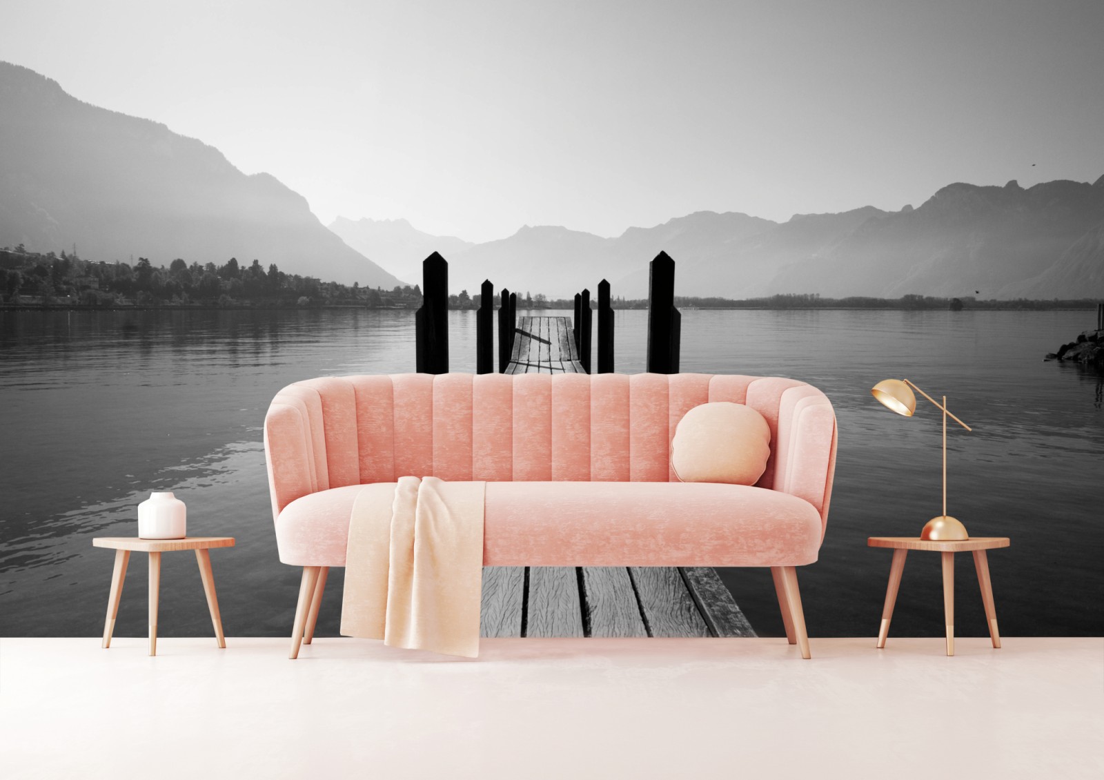 Odkryj spokojny monochromatyczny widok jeziora i gór który wprowadza harmonię i minimalistyczny charakter do wnętrza.