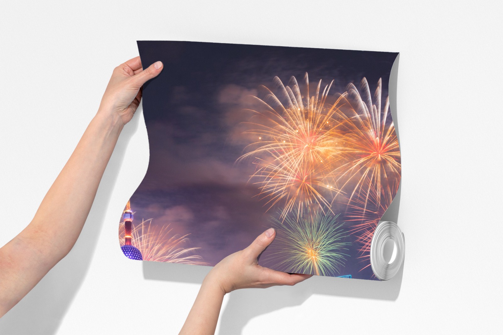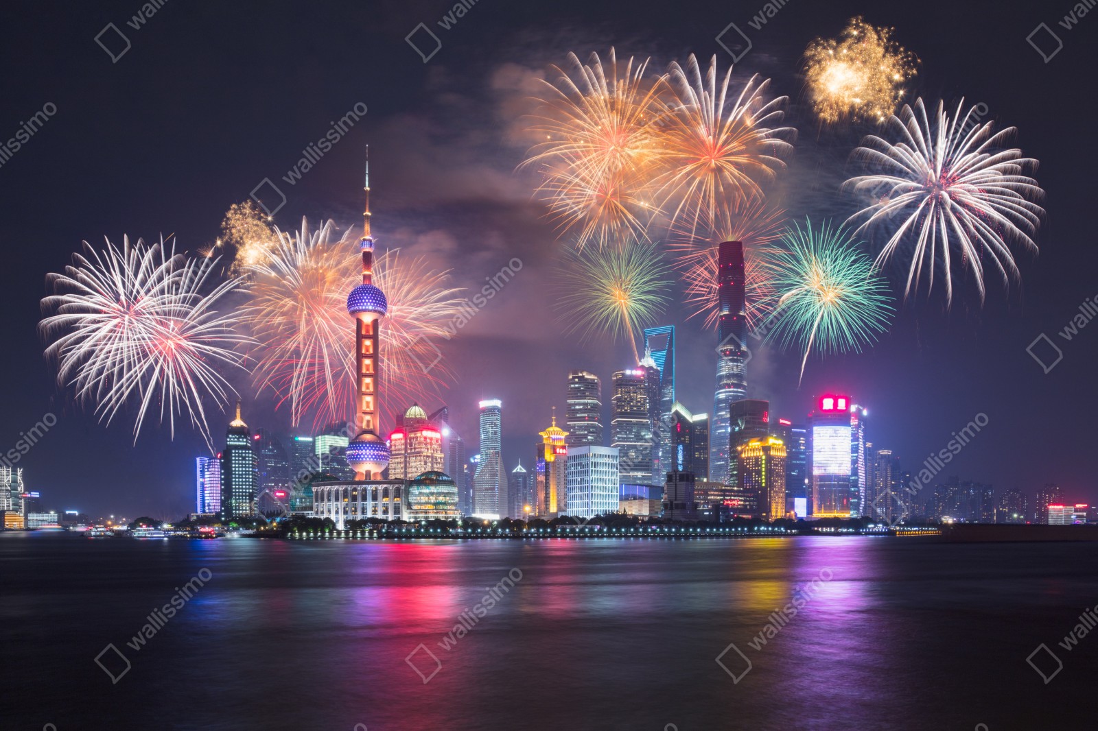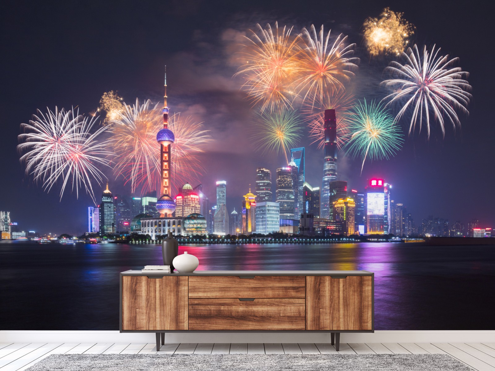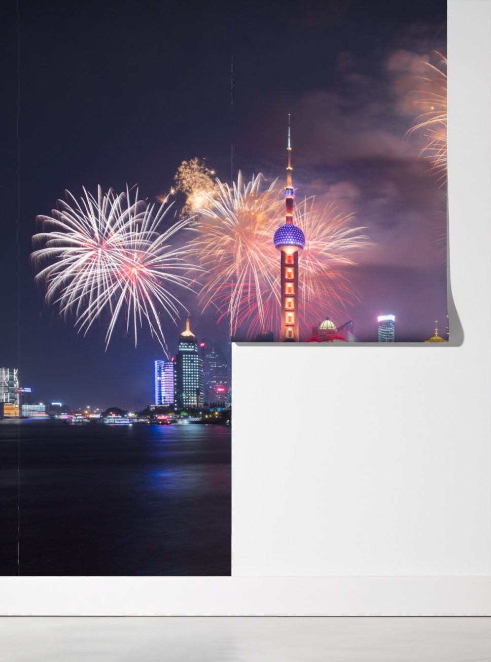 Dodaj dynamiczny akcent do wnętrza dzięki tej zapierającej dech w piersiach panoramie Szanghaju nocą z fajerwerkami nad rzeką Huangpu.