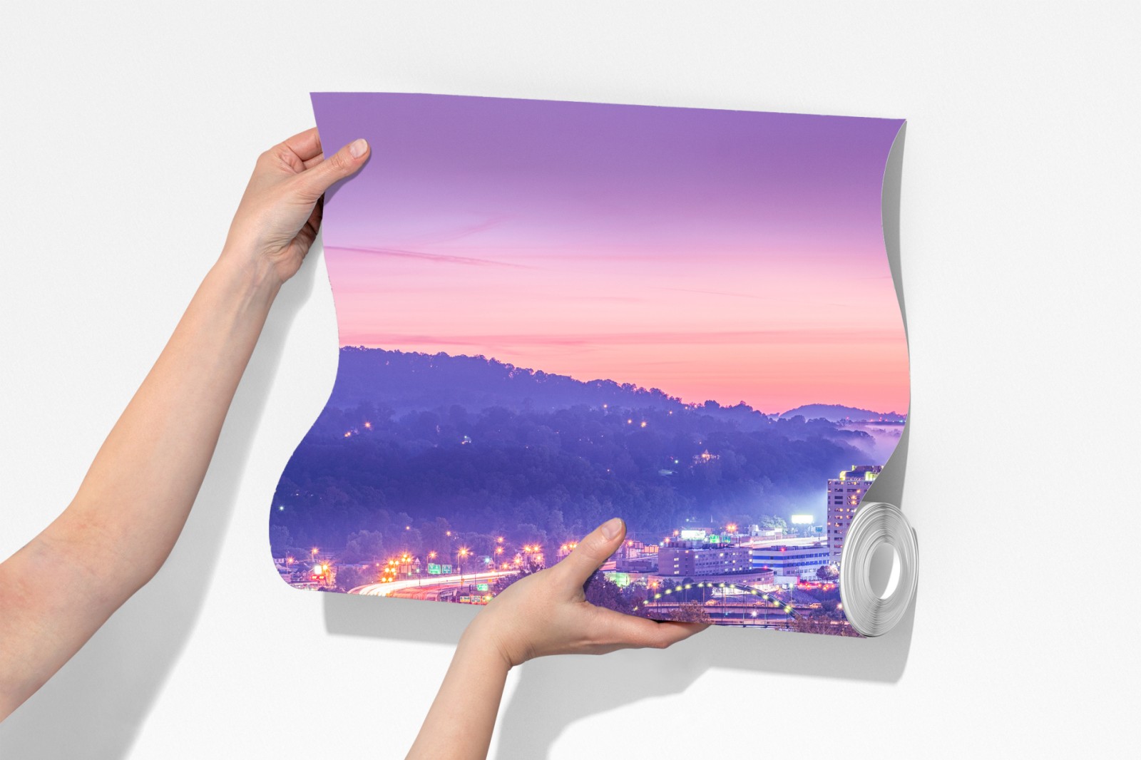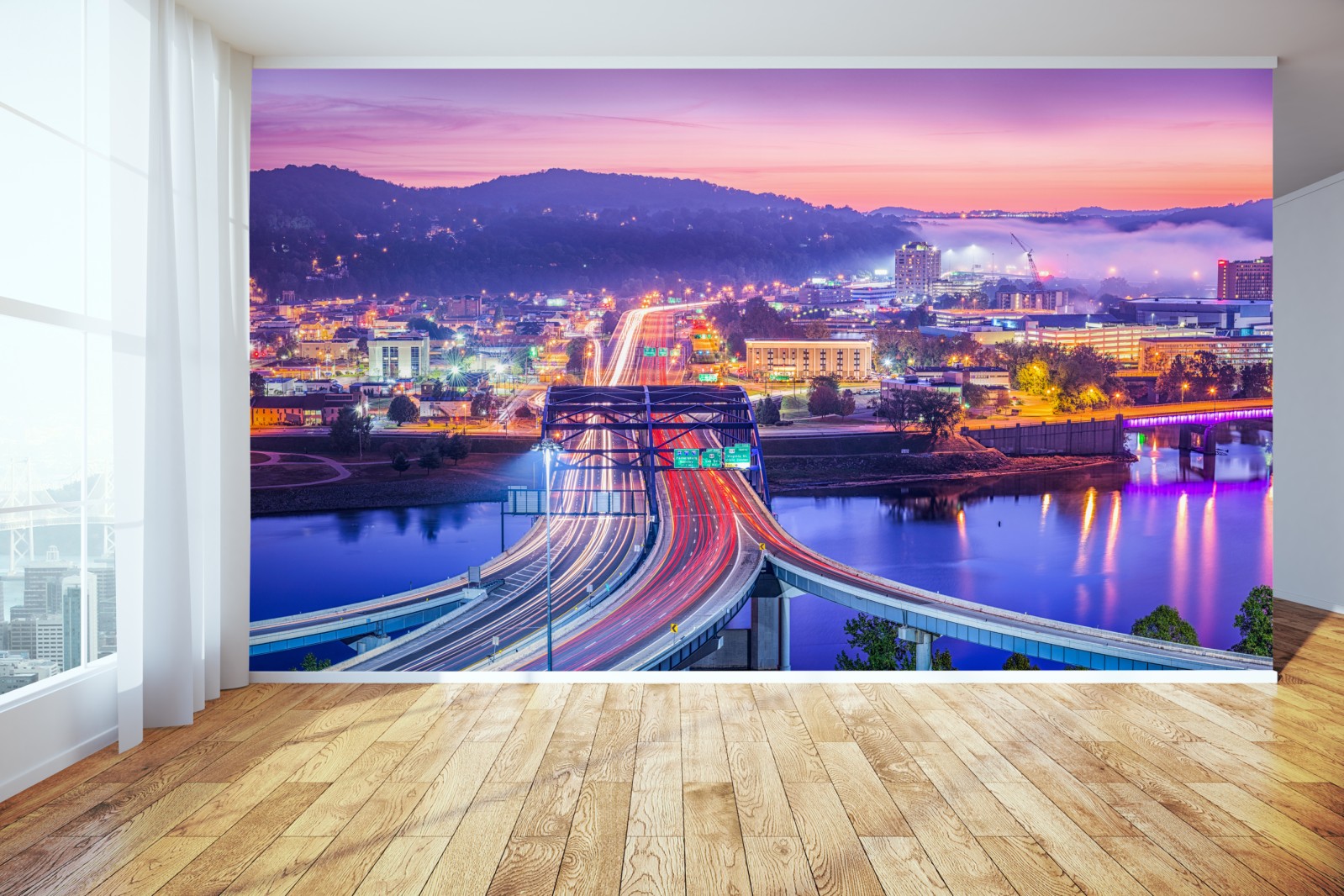 Odkryj spokojne piękno Charleston o świcie na tym żywym wydruku miejskim z mostem, światłami i pastelowym niebem.