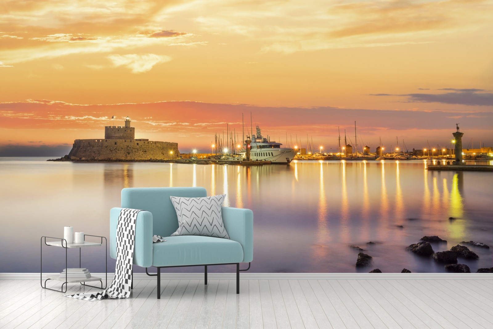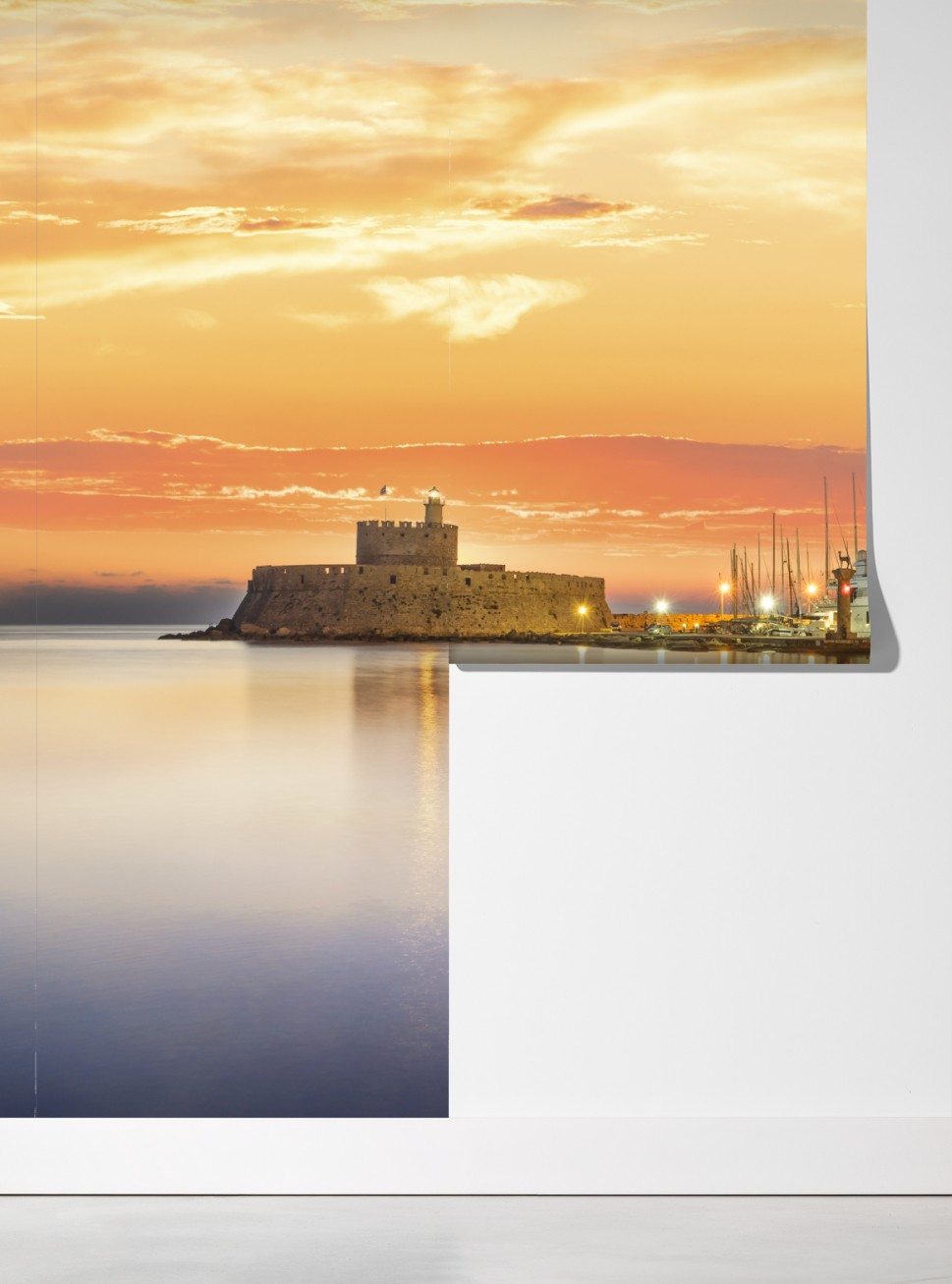 Poczuj złotą ciszę portu Mandraki z twierdzą Agios Nikolaos odbijającą się w spokojnej wodzie o zachodzie słońca.