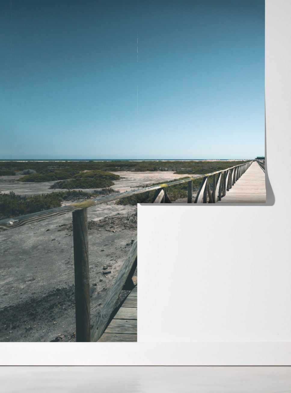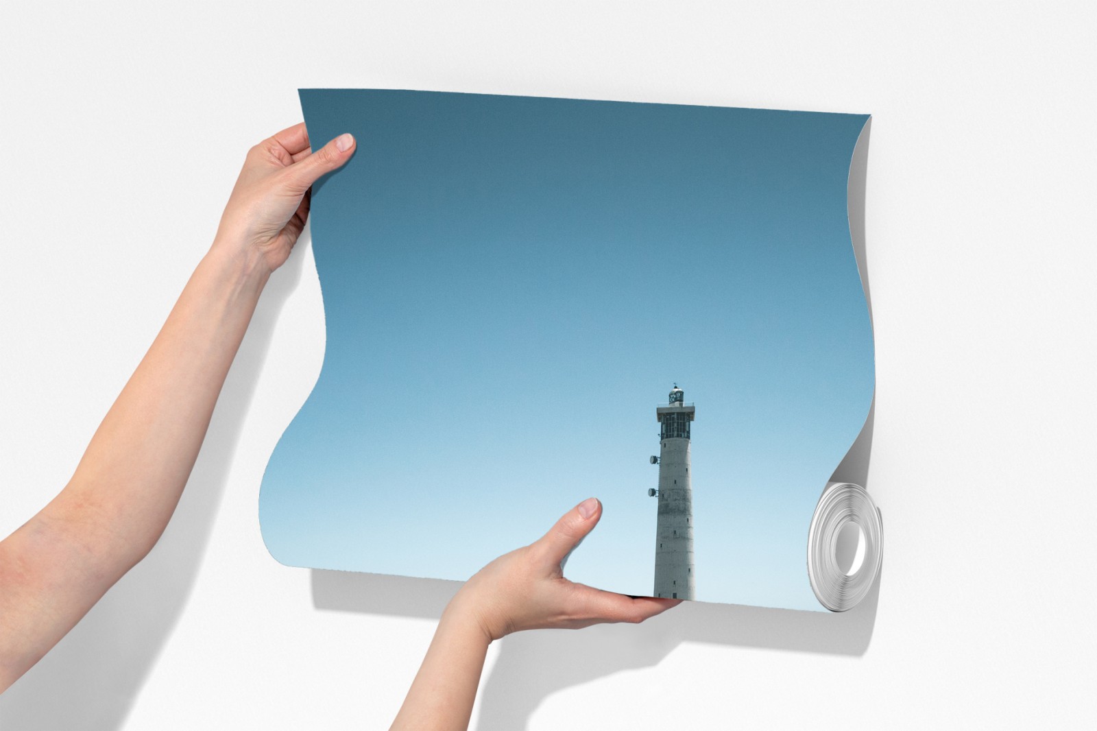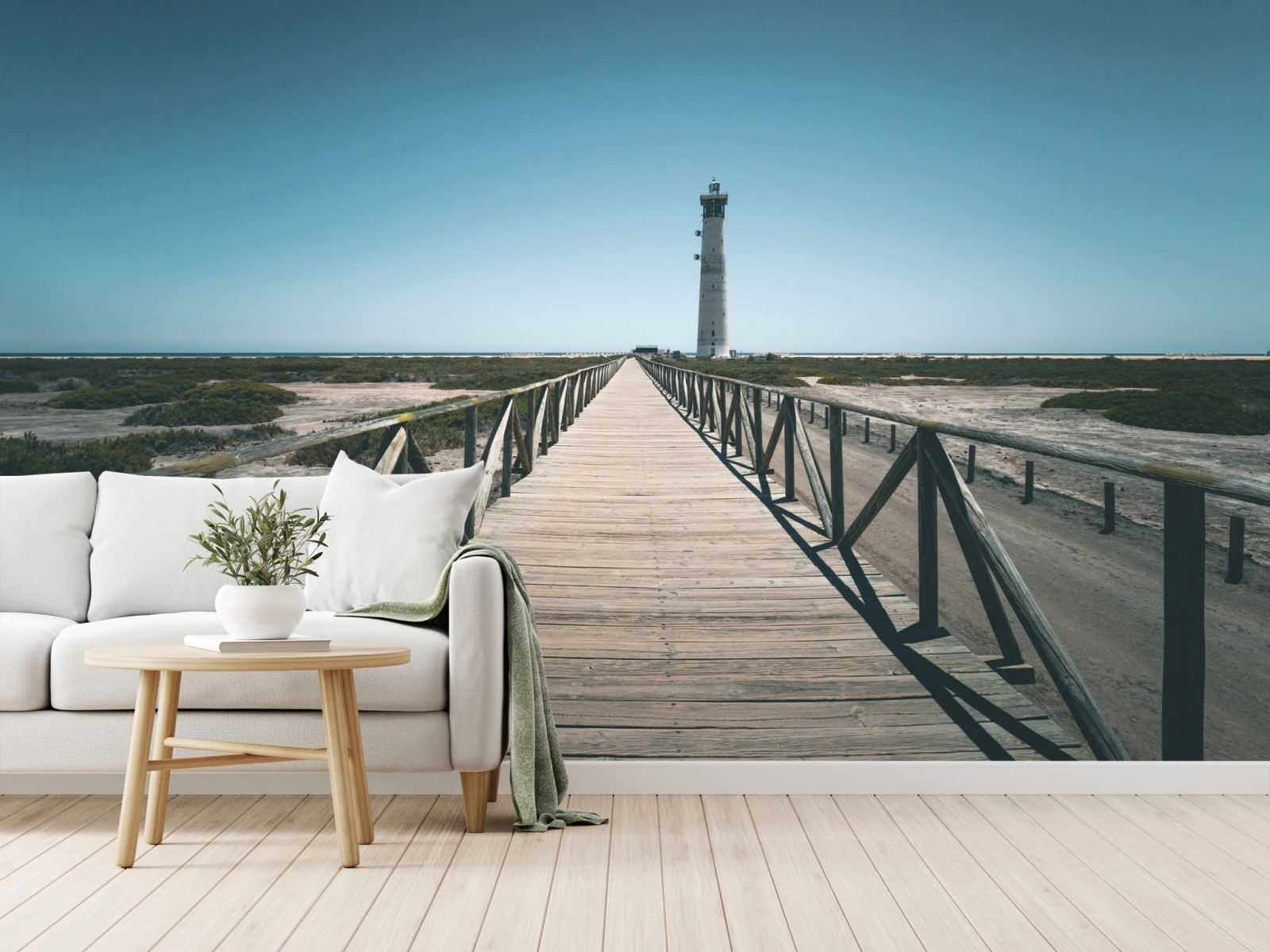 Wprowadź spokojną, nadmorską atmosferę do wnętrza dzięki tej minimalistycznej scenie z latarnią morską i pomostem.