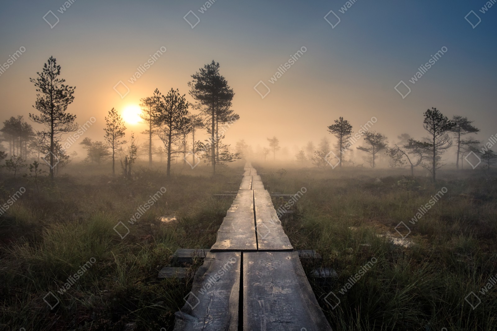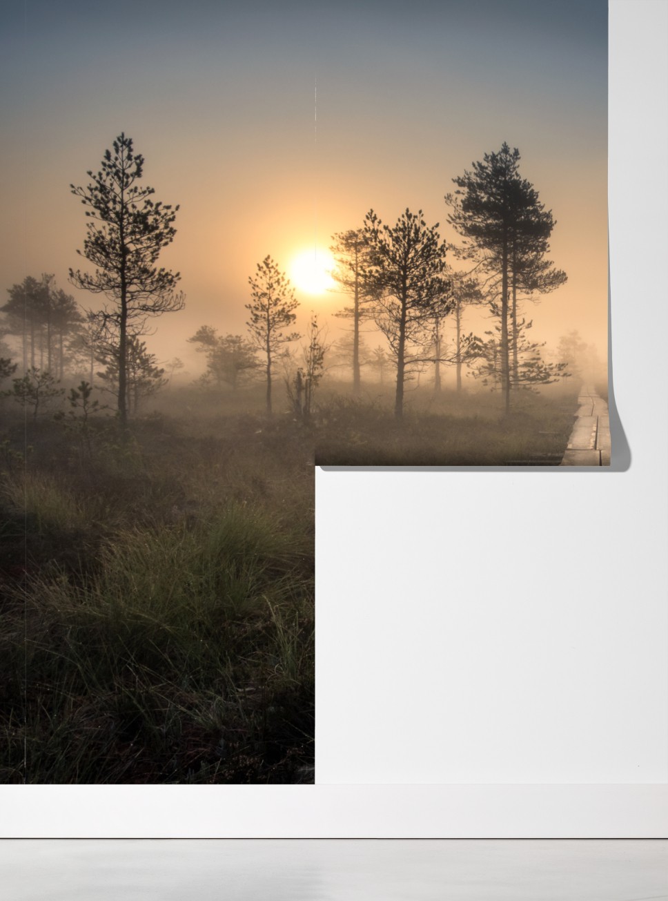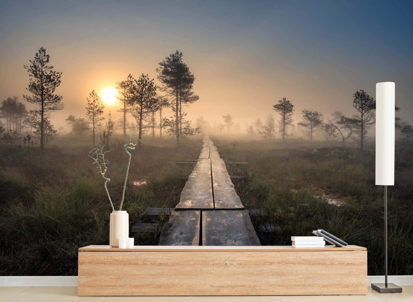 Wprowadź uspokajające piękno natury do wnętrza dzięki tej mglistej scenie z wschodem słońca i drewnianą kładką przez bagno.