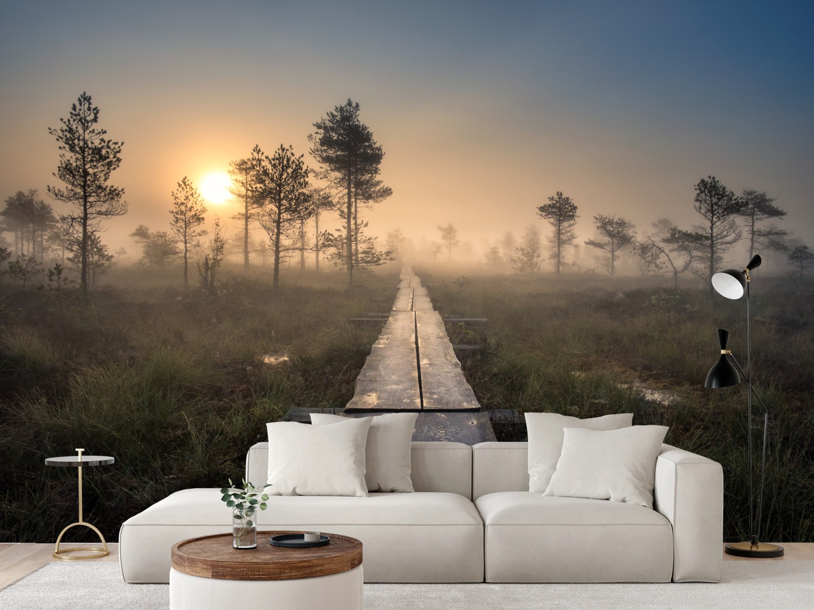 Fototapeta Mglisty wschód słońca nad drewnianą kładką