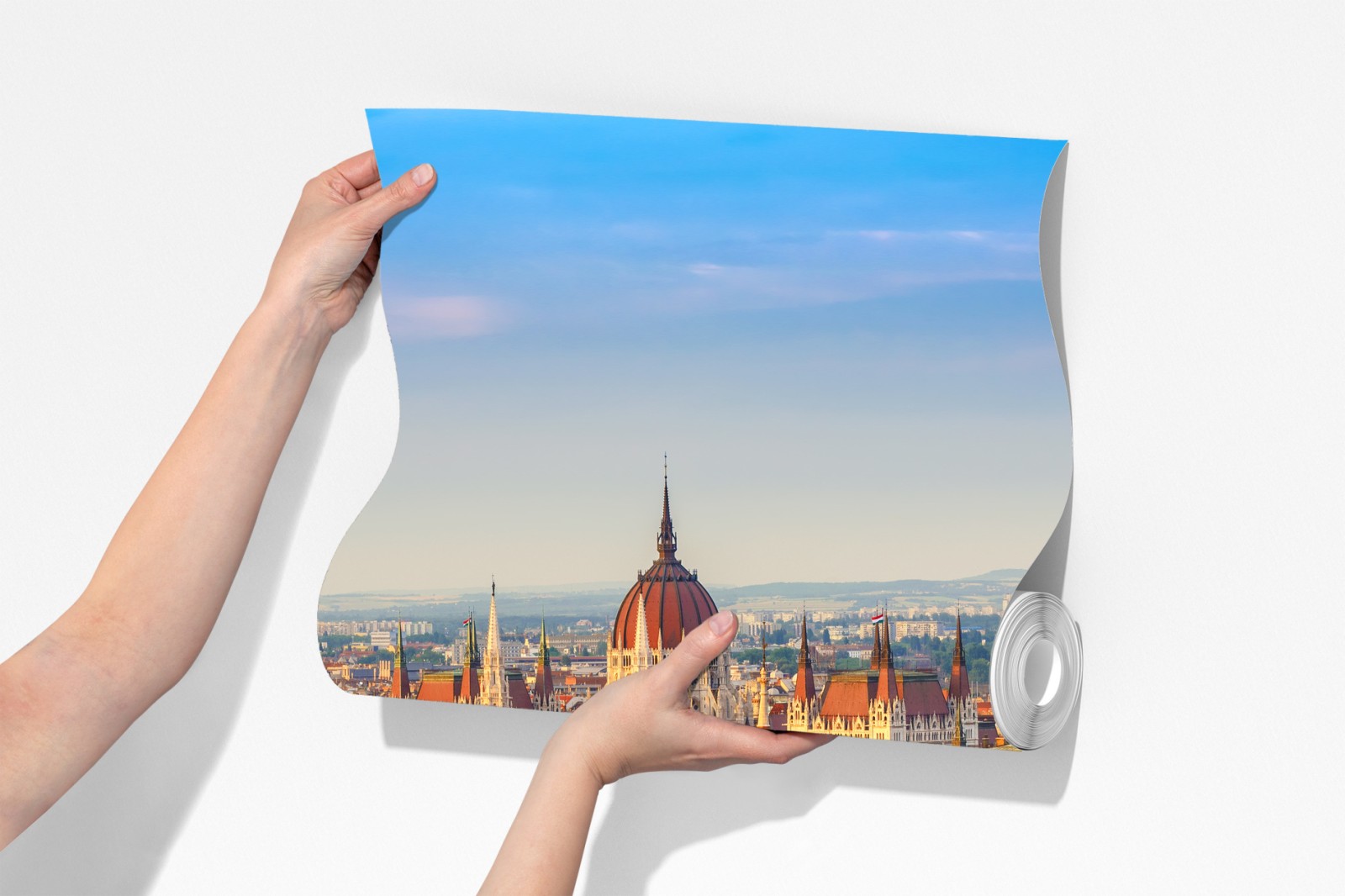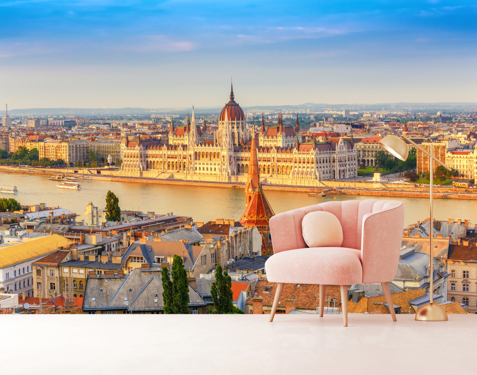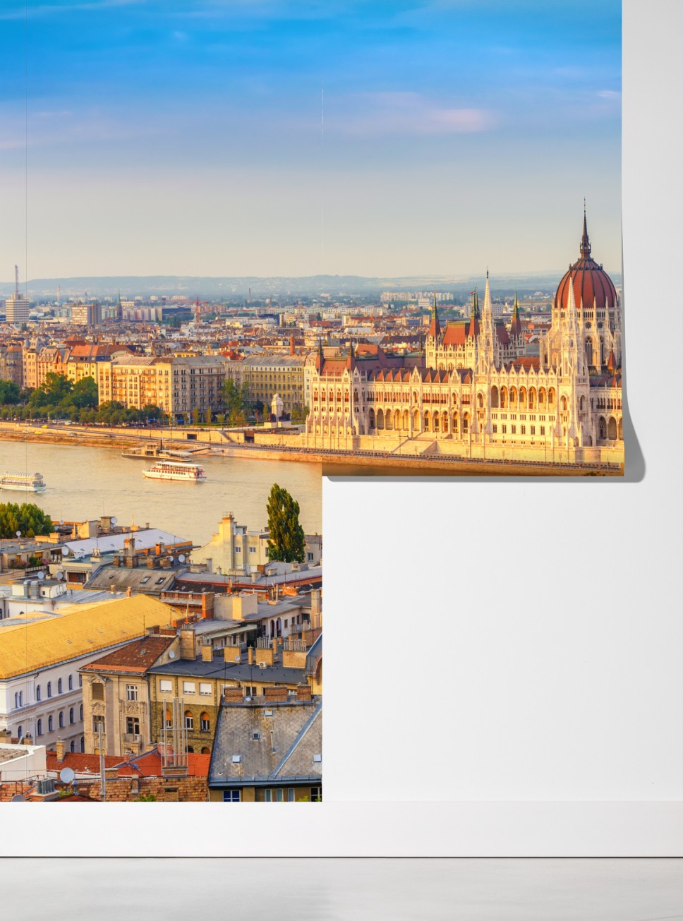 Wprowadź do wnętrza charakterystyczną panoramę Budapesztu z parlamentem nad Dunajem, idealną do dekoracji salonu lub biura.