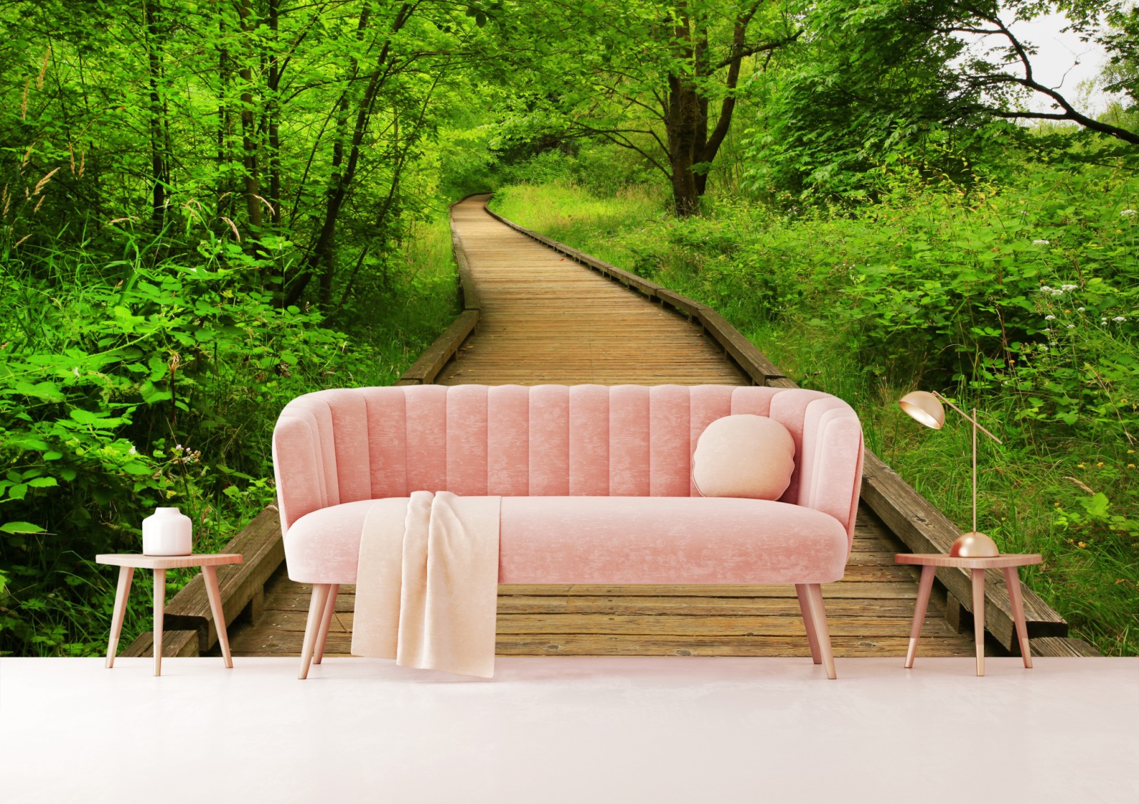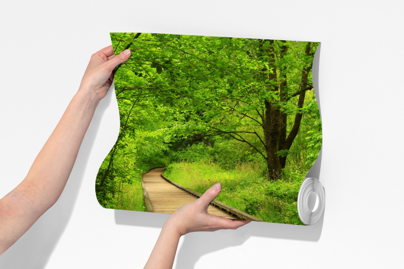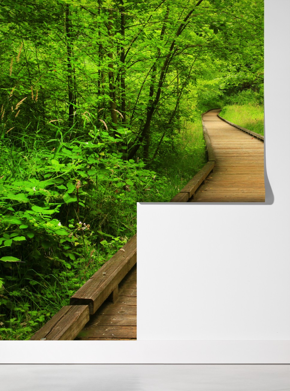 Wprowadź do wnętrza spokojną atmosferę lasu dzięki temu żywemu zdjęciu drewnianej ścieżki, idealnemu do relaksu i kontaktu z naturą.