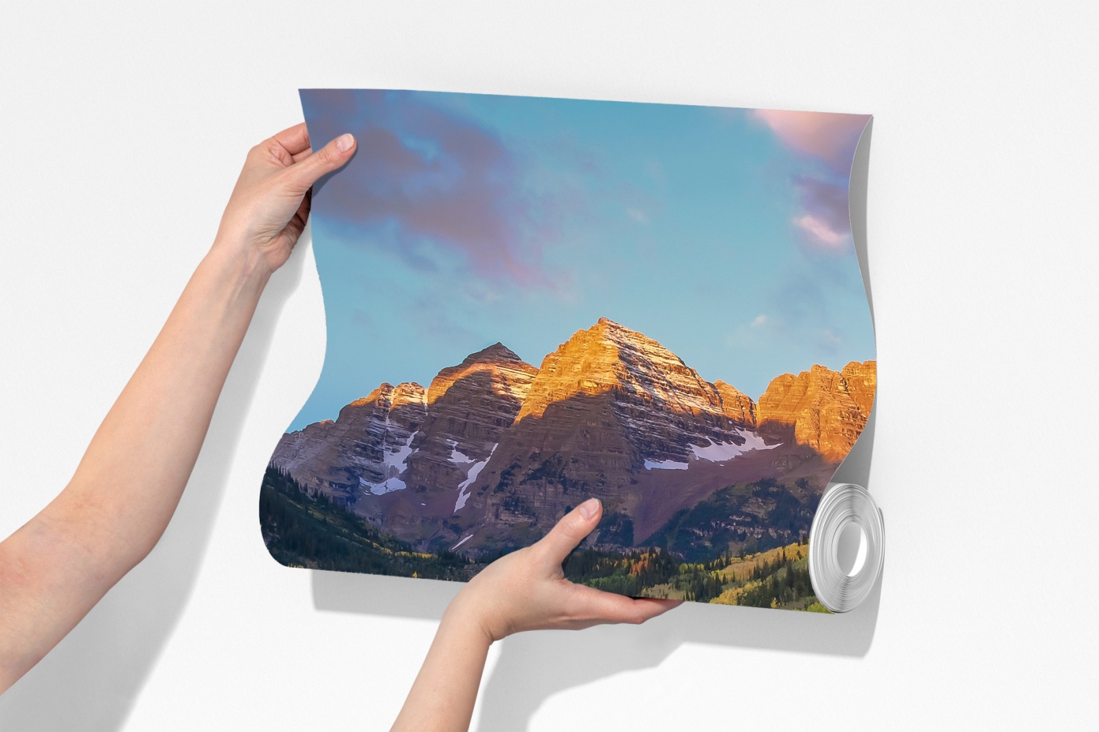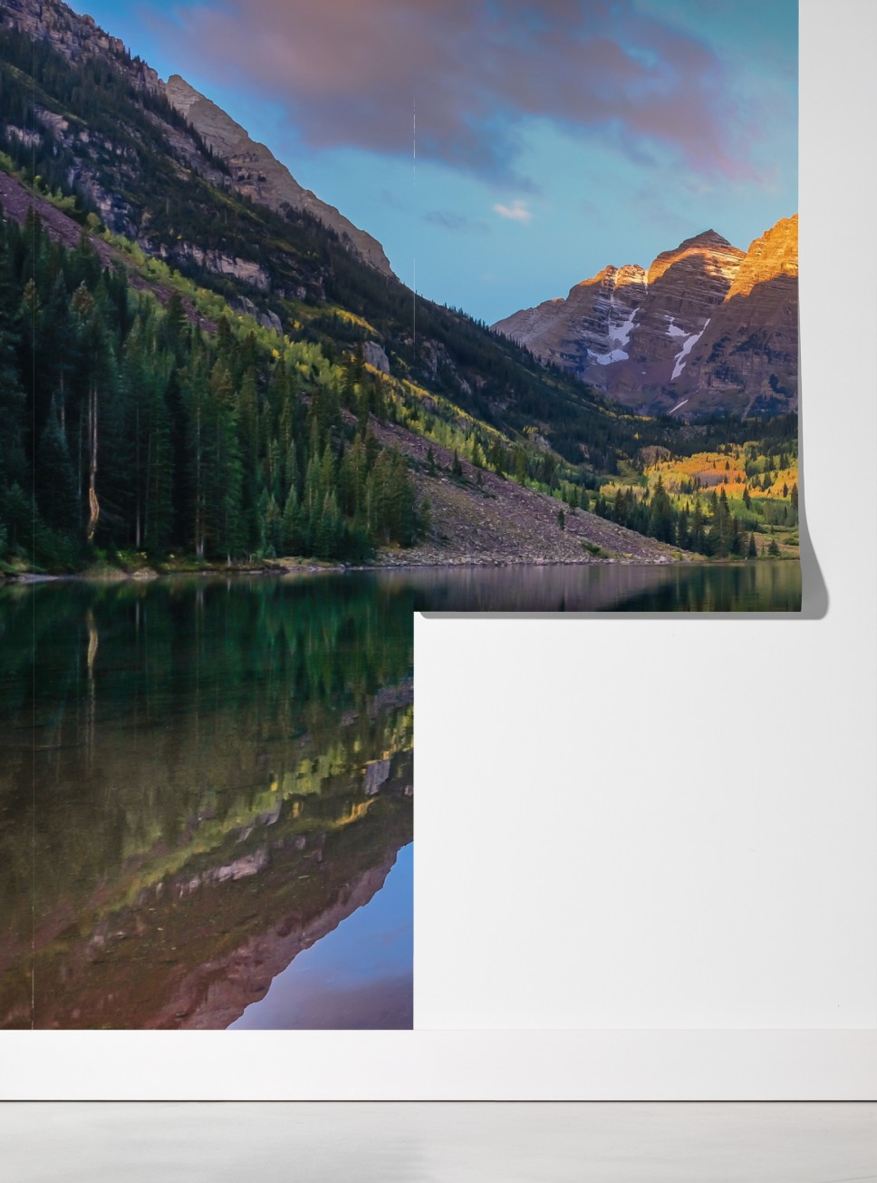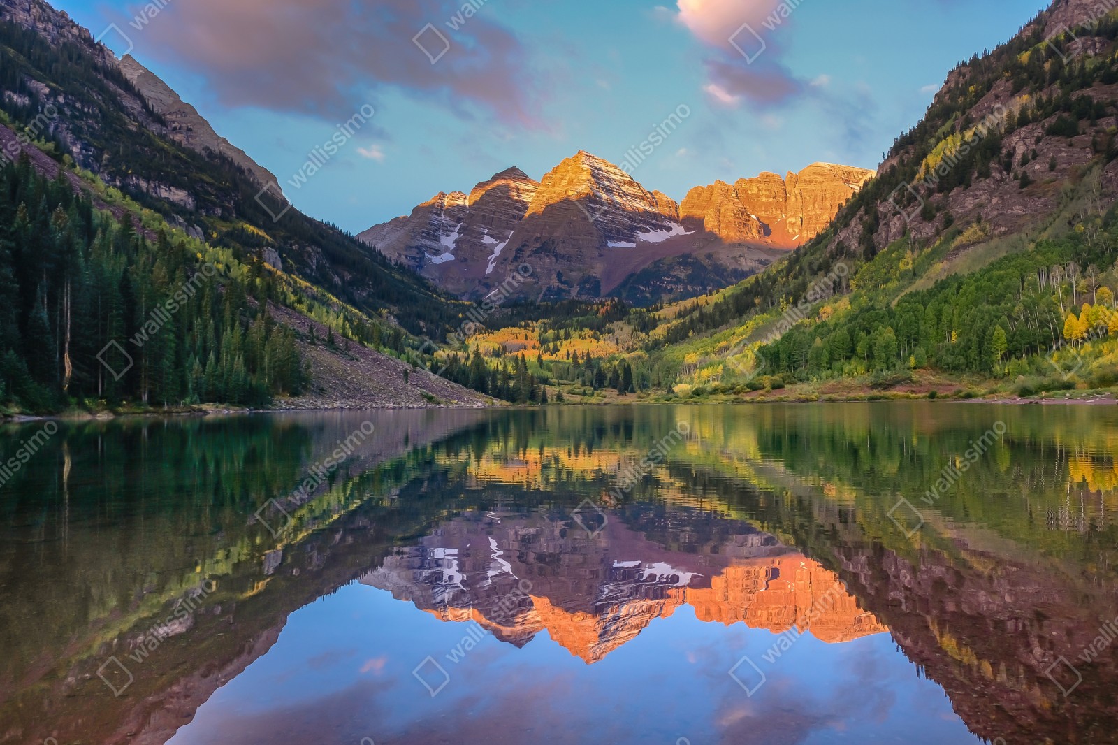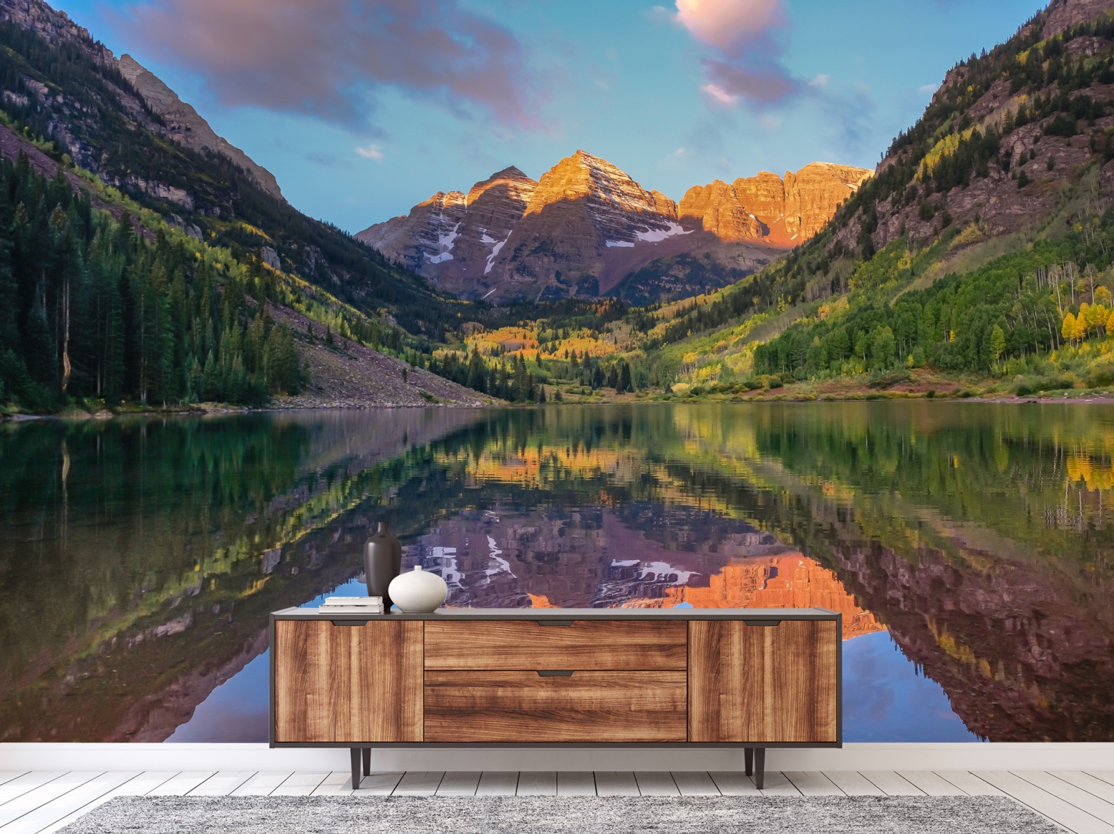 Odkryj spokojny urok Maroon Bells o wschodzie słońca z intensywnym odbiciem i ciepłym światłem alpejskim, idealne do wprowadzenia natury do wnętrza.