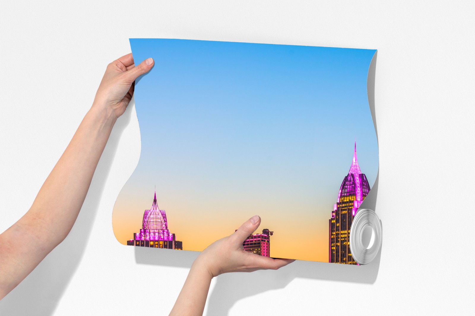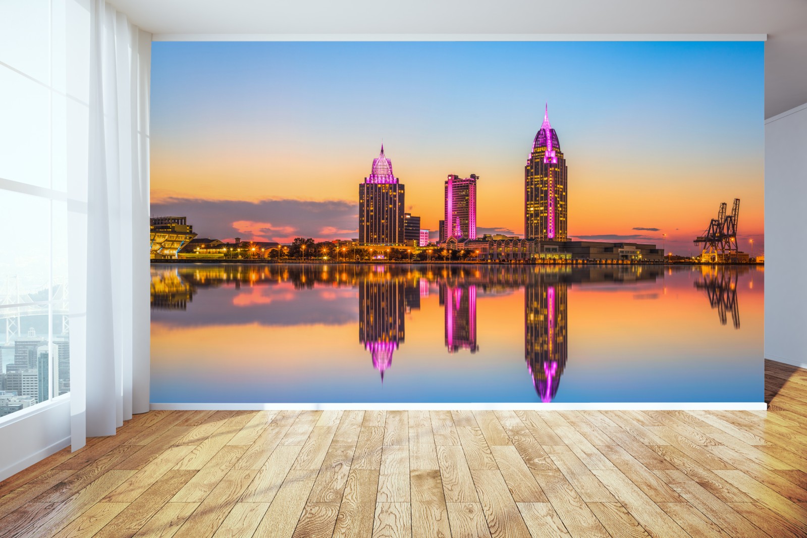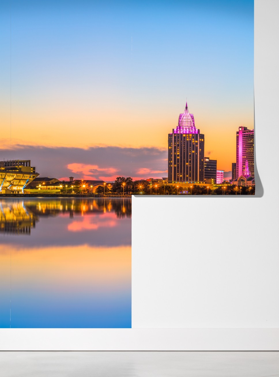 Wprowadź żywe światło przybrzeżnej panoramy Mobile do swojego wnętrza dzięki temu zachwycającemu miejskiemu pejzażowi o zachodzie słońca.