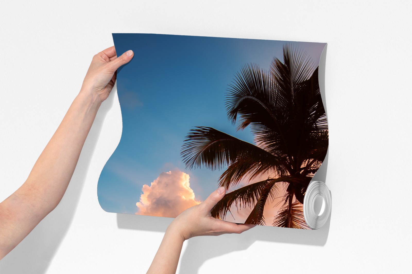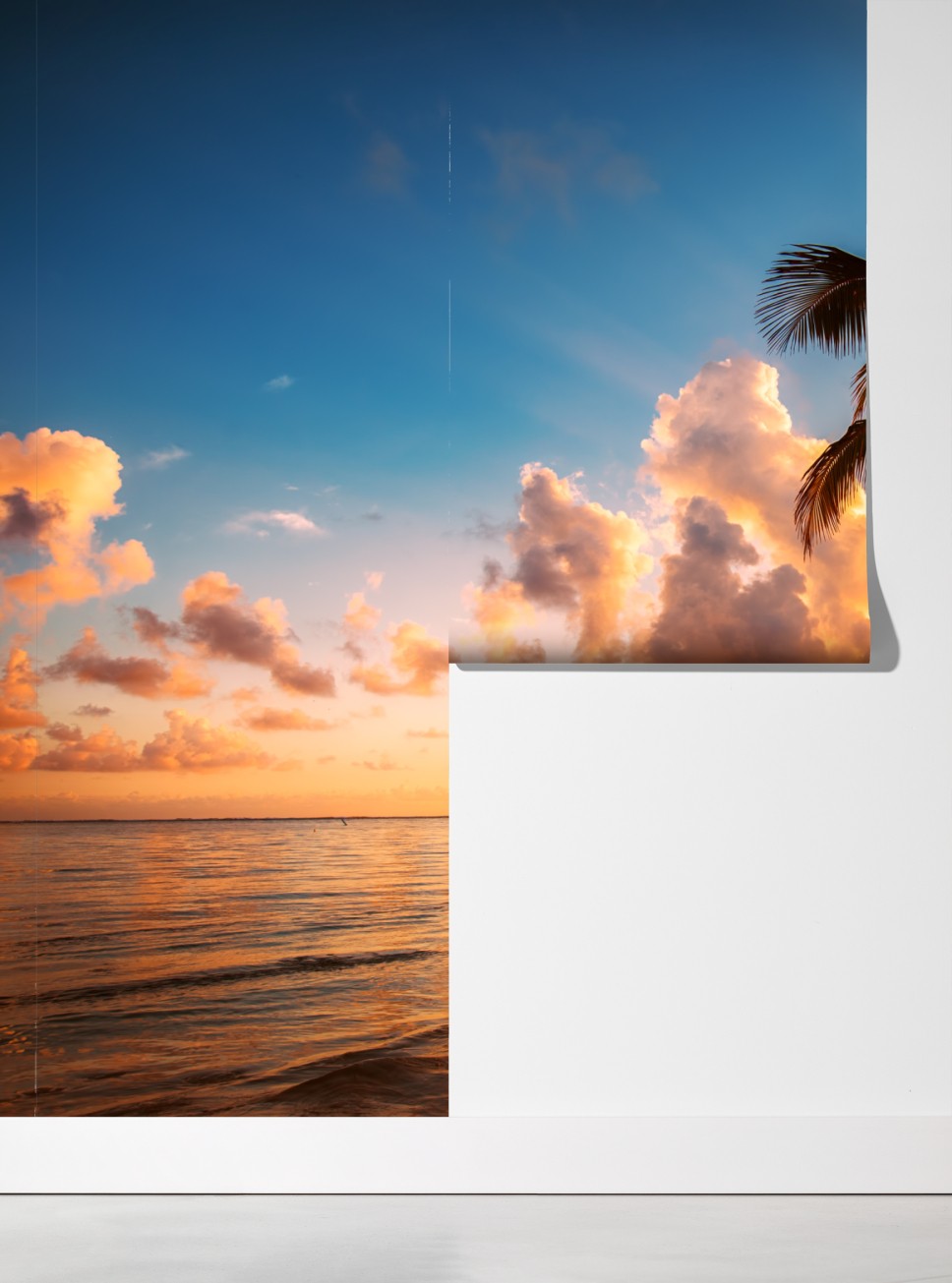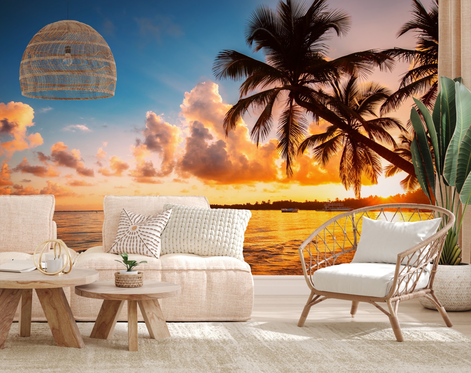 Wprowadź tropikalny klimat do wnętrza dzięki temu żywemu zachodowi słońca z sylwetkami palm na spokojnej plaży w Dominikanie.