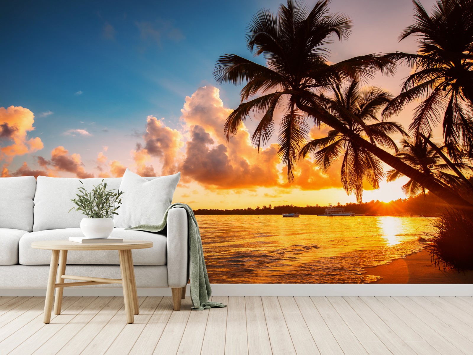 Fototapeta Tropikalny zachód słońca z sylwetkami palm, Dominikana