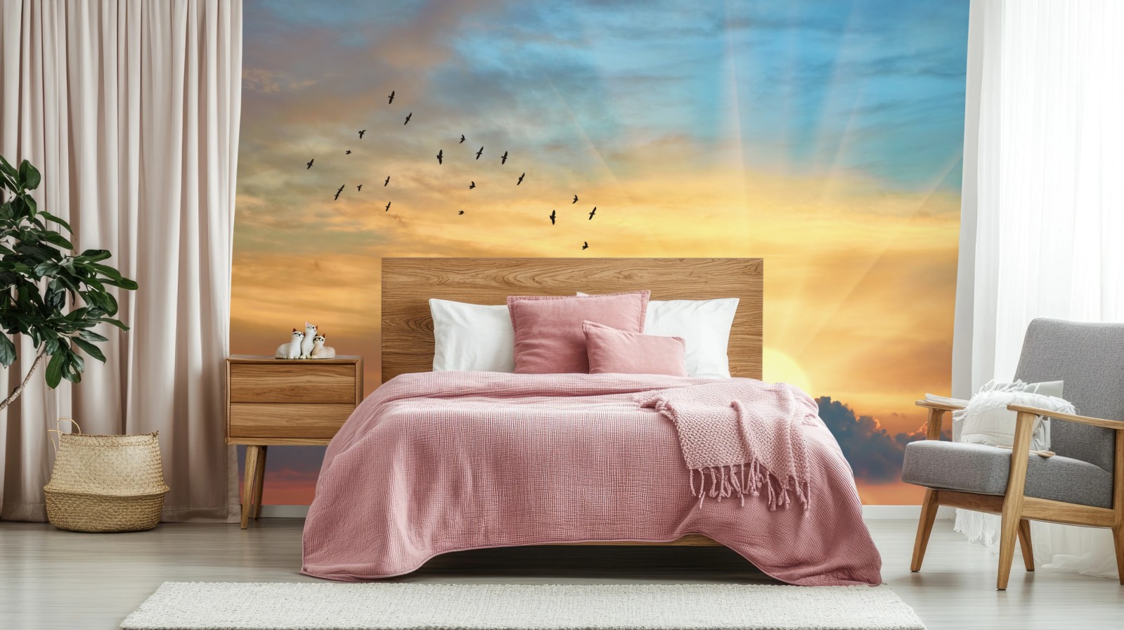 - krajobraz, natura, wschód słońca, spokój, niebo, ptaki, chmury, horyzont, promienie słońca, poranek