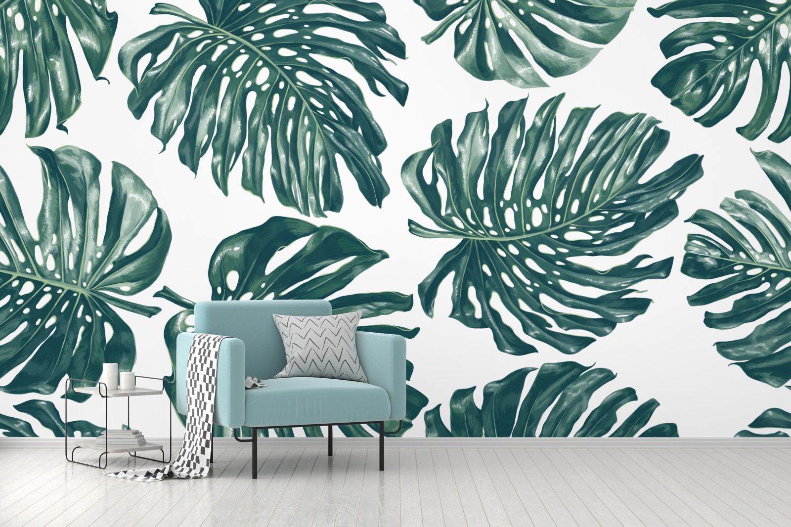 - monstera, botaniczny, zielone liście, tropikalne liście, akwarela, rośliny, wzór bez szwów, tropikalny wystrój, liść palmy, mural ścienny