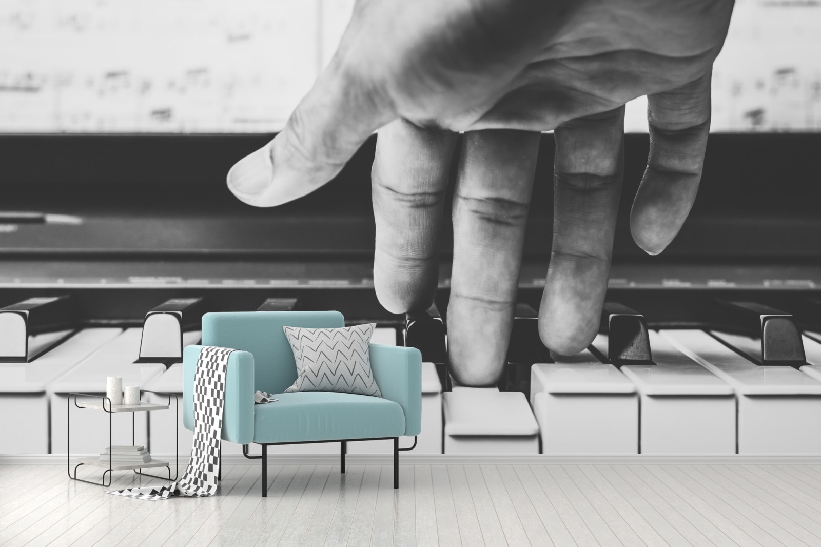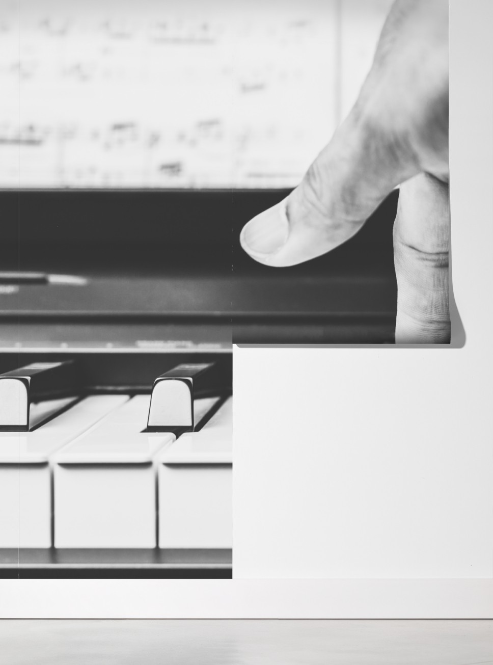 Wprowadź elegancki muzyczny klimat do wnętrza dzięki monochromatycznemu ujęciu ręki grającej na fortepianie.