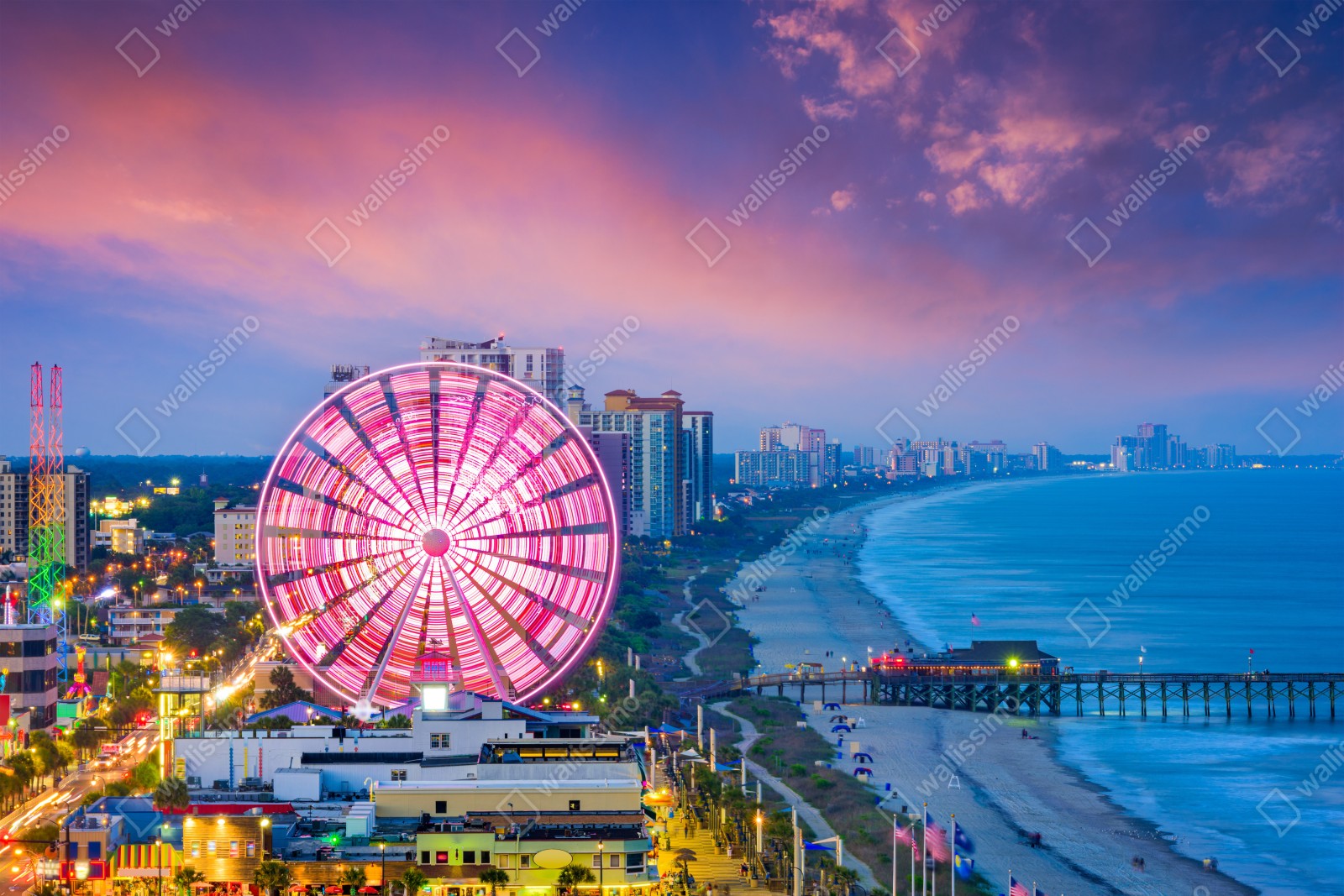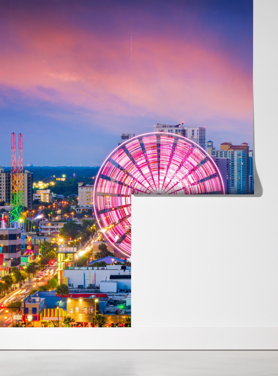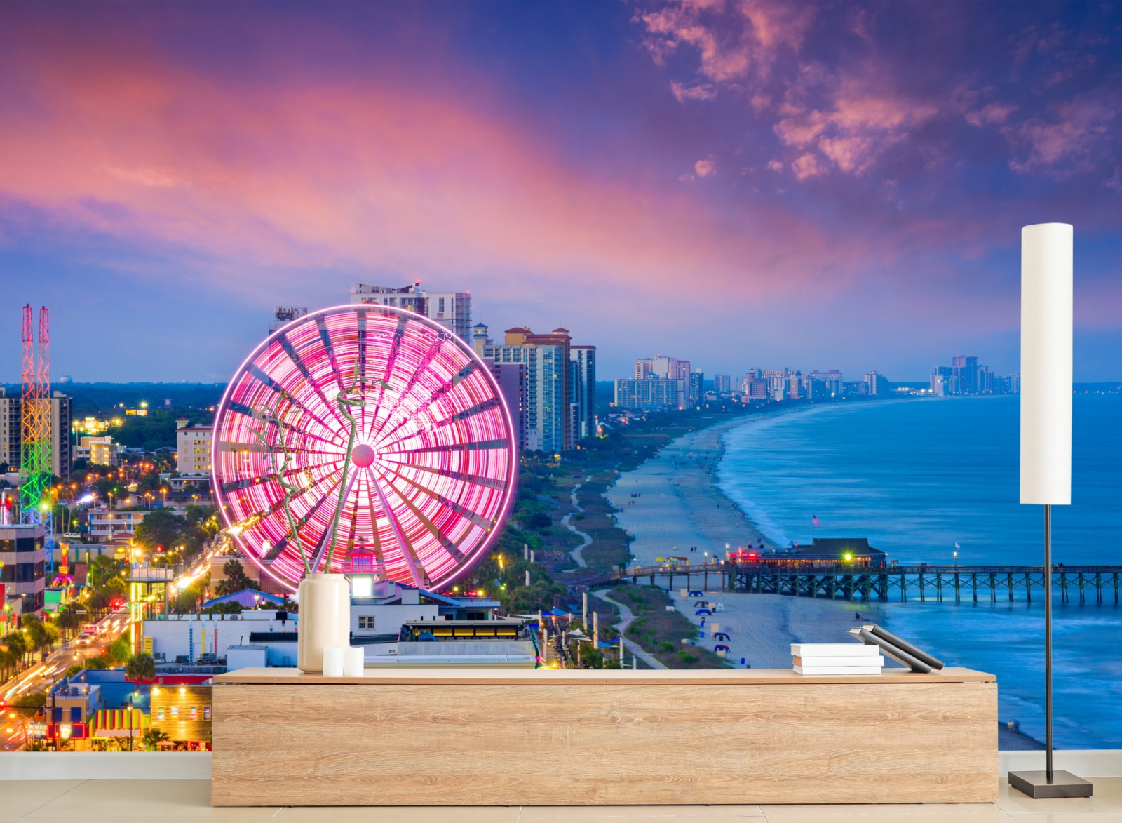 Przenieś nadmorski klimat do wnętrza dzięki żywej panoramie Myrtle Beach z rozświetlonym diabelskim młynem i spokojnym oceanem.