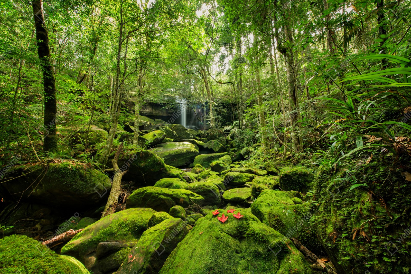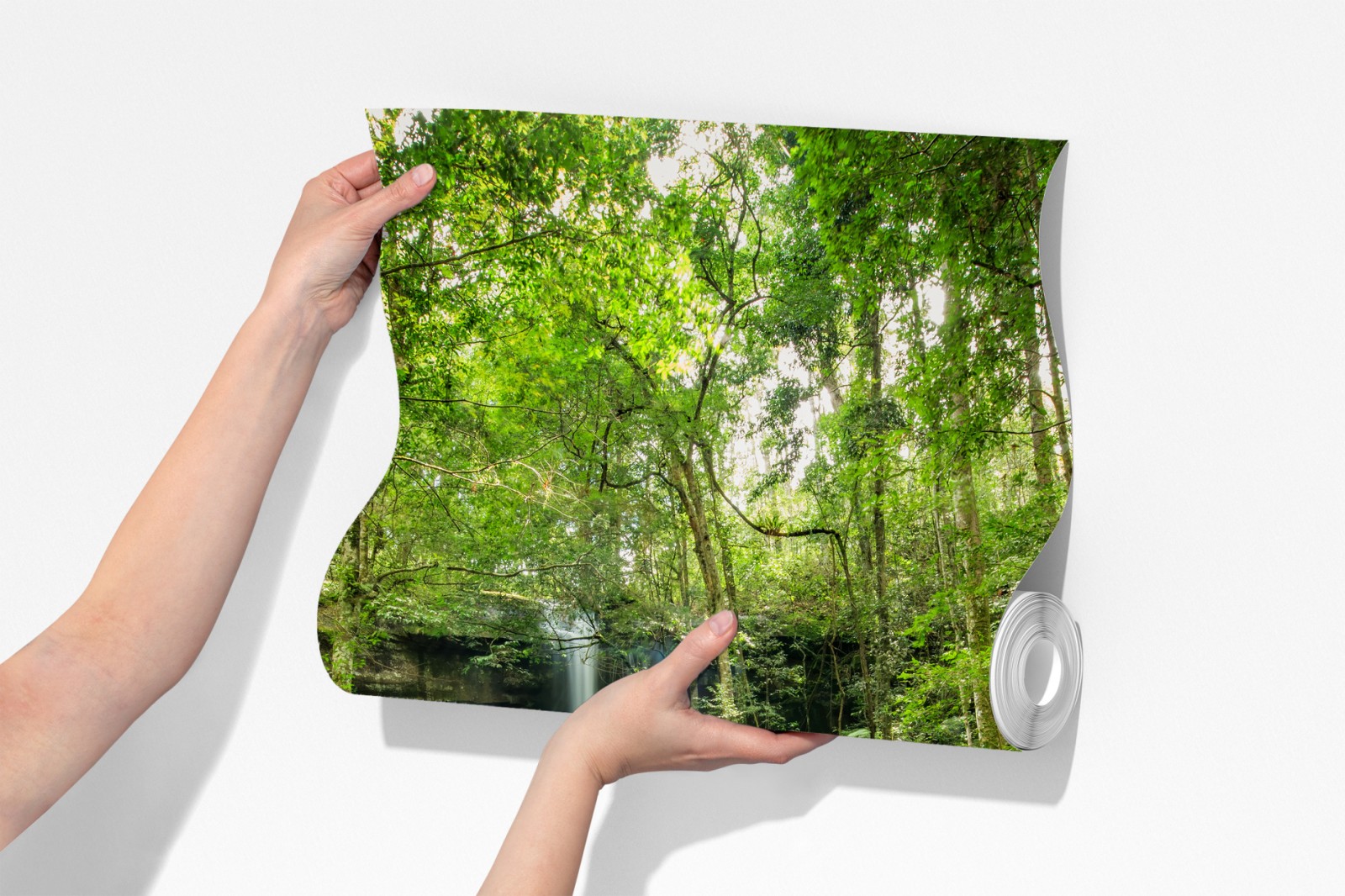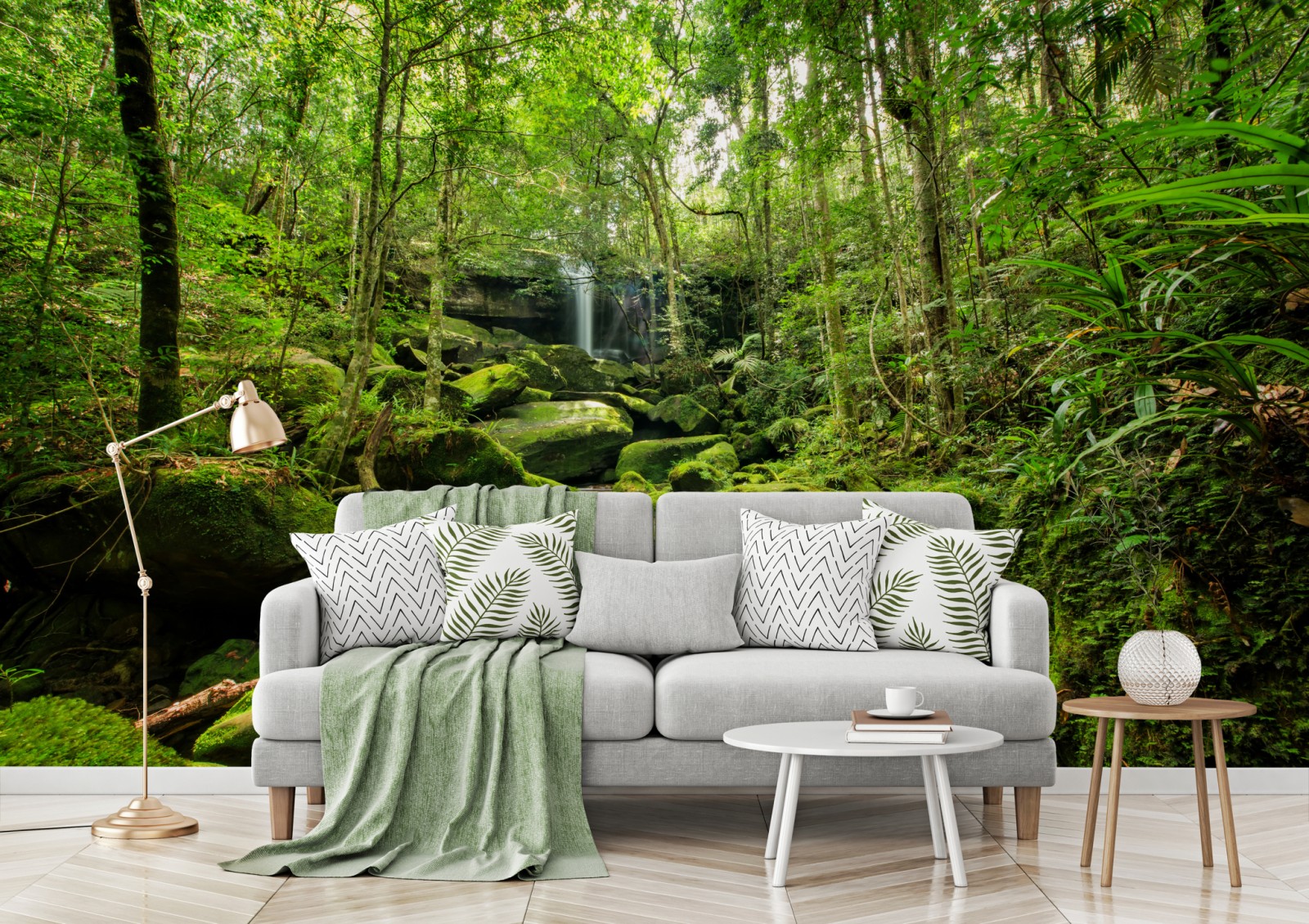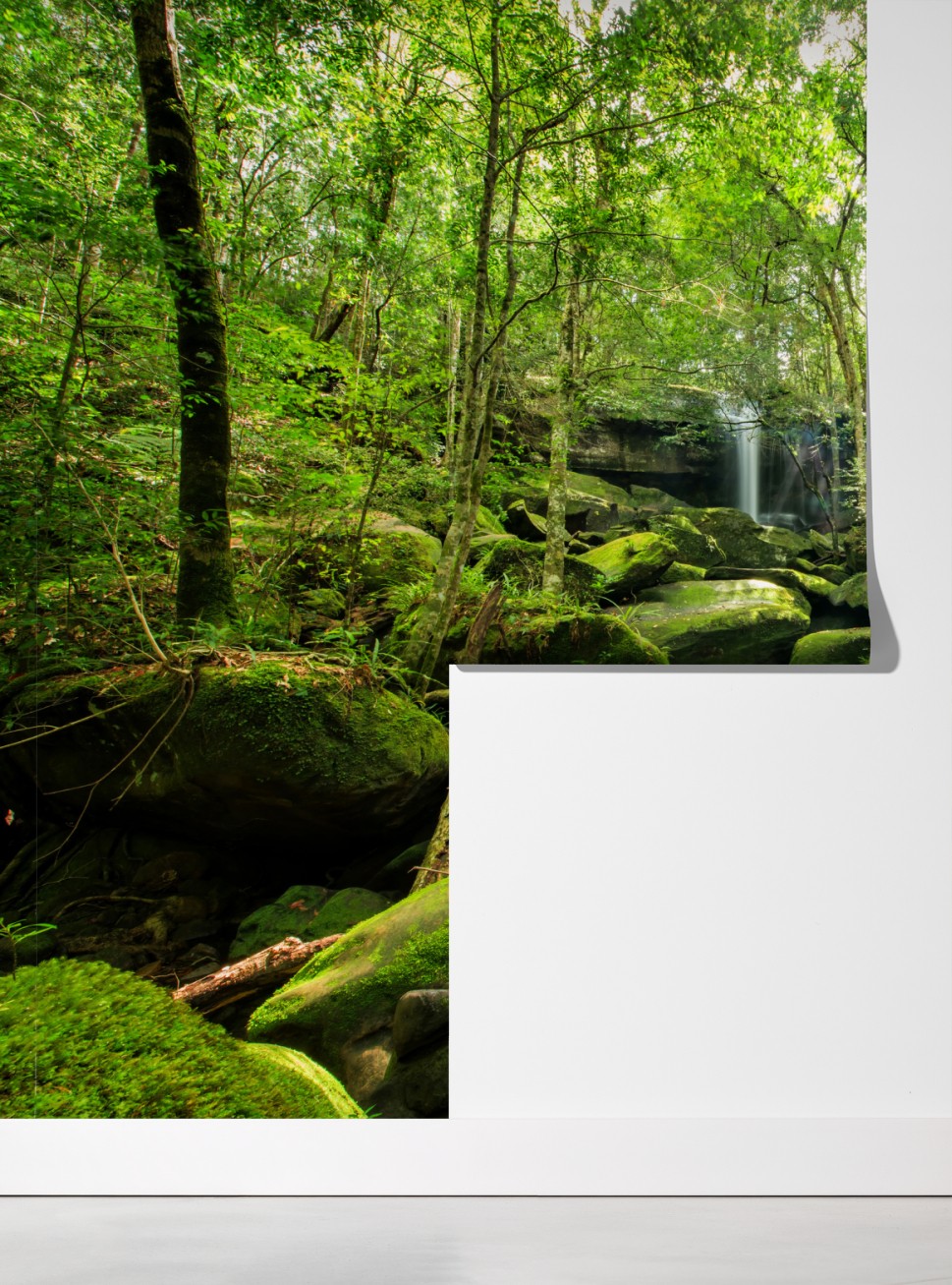 Wprowadź do wnętrza uspokajającą energię deszczowego lasu dzięki temu żywemu ujęciu wodospadu i pokrytych mchem kamieni.