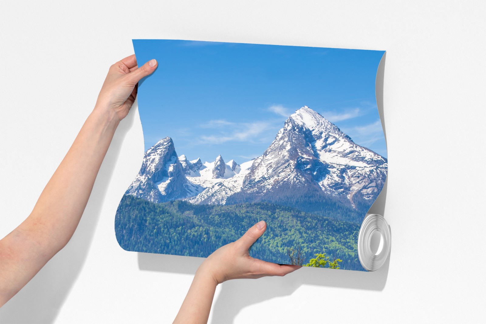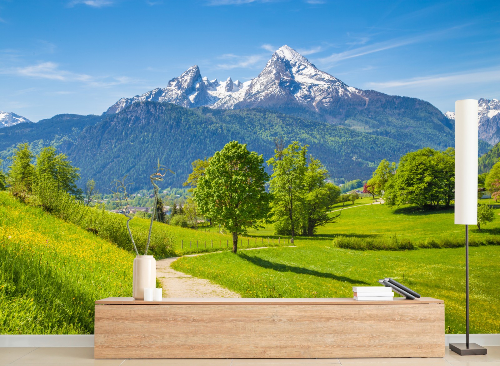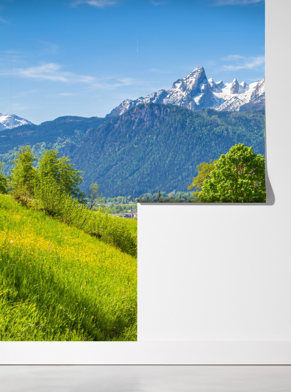 Wprowadź spokój alpejskich łąk do wnętrza dzięki temu żywemu krajobrazowi ze śnieżnymi szczytami, zielonymi polami i krętą ścieżką pod błękitnym niebem.