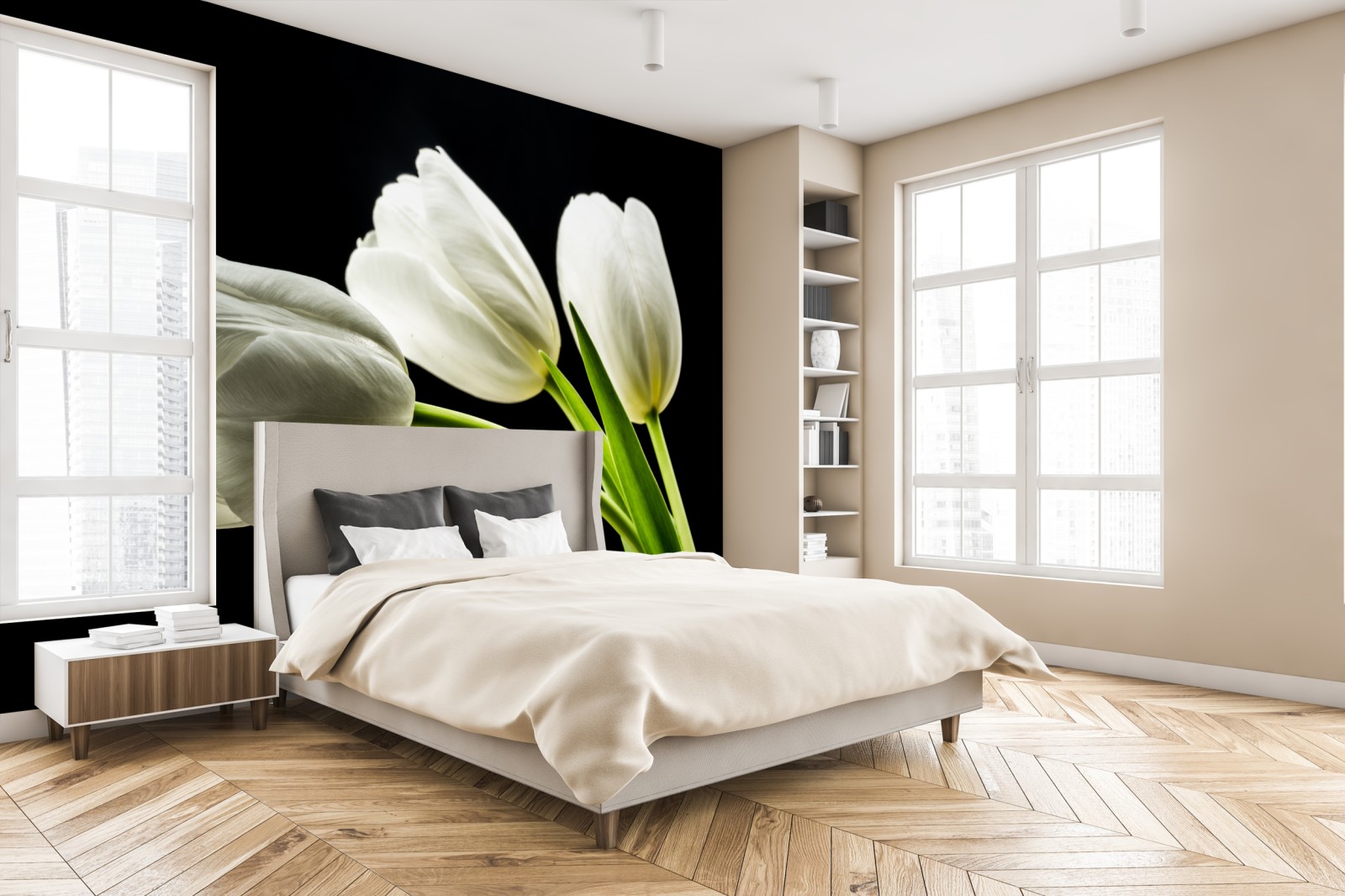 Wzbogać wnętrze o minimalistyczną elegancję dzięki białym tulipanom na głębokim czarnym tle, idealne do sypialni lub salonu.