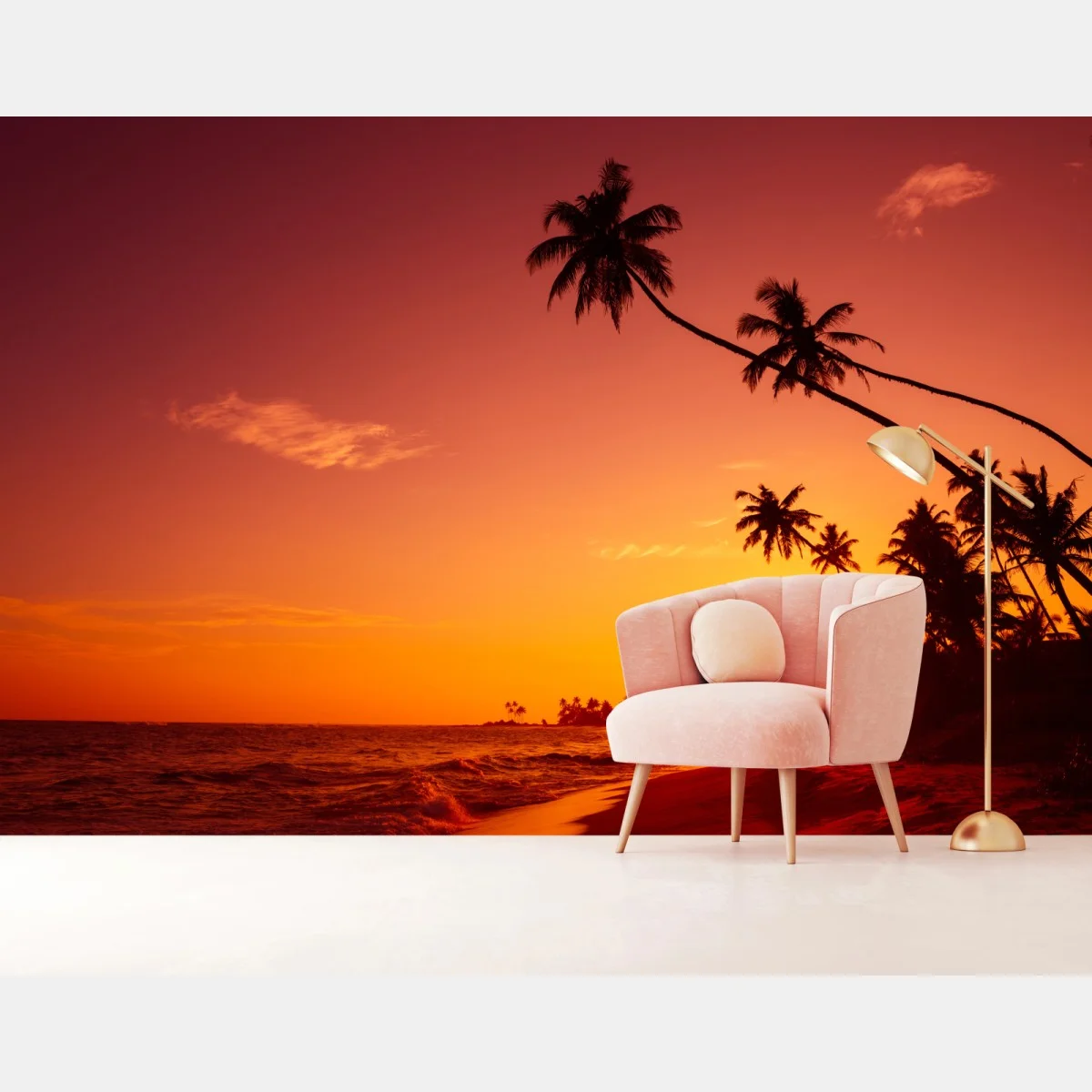 - krajobraz, sylwetka, tropikalny, egzotyczny, lato, zachód słońca, palmy, morze, plaża, relaks