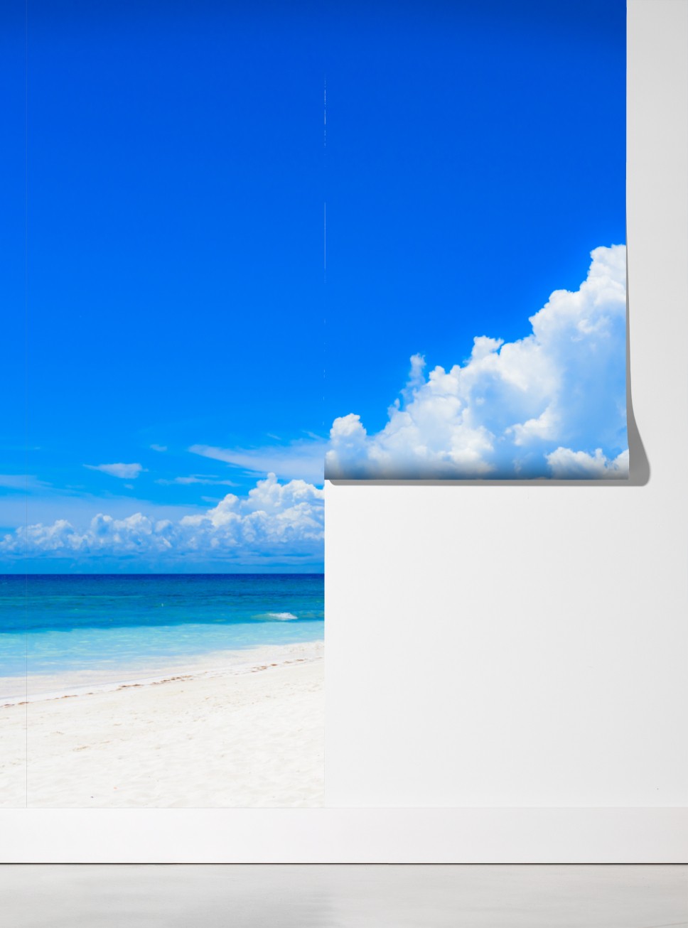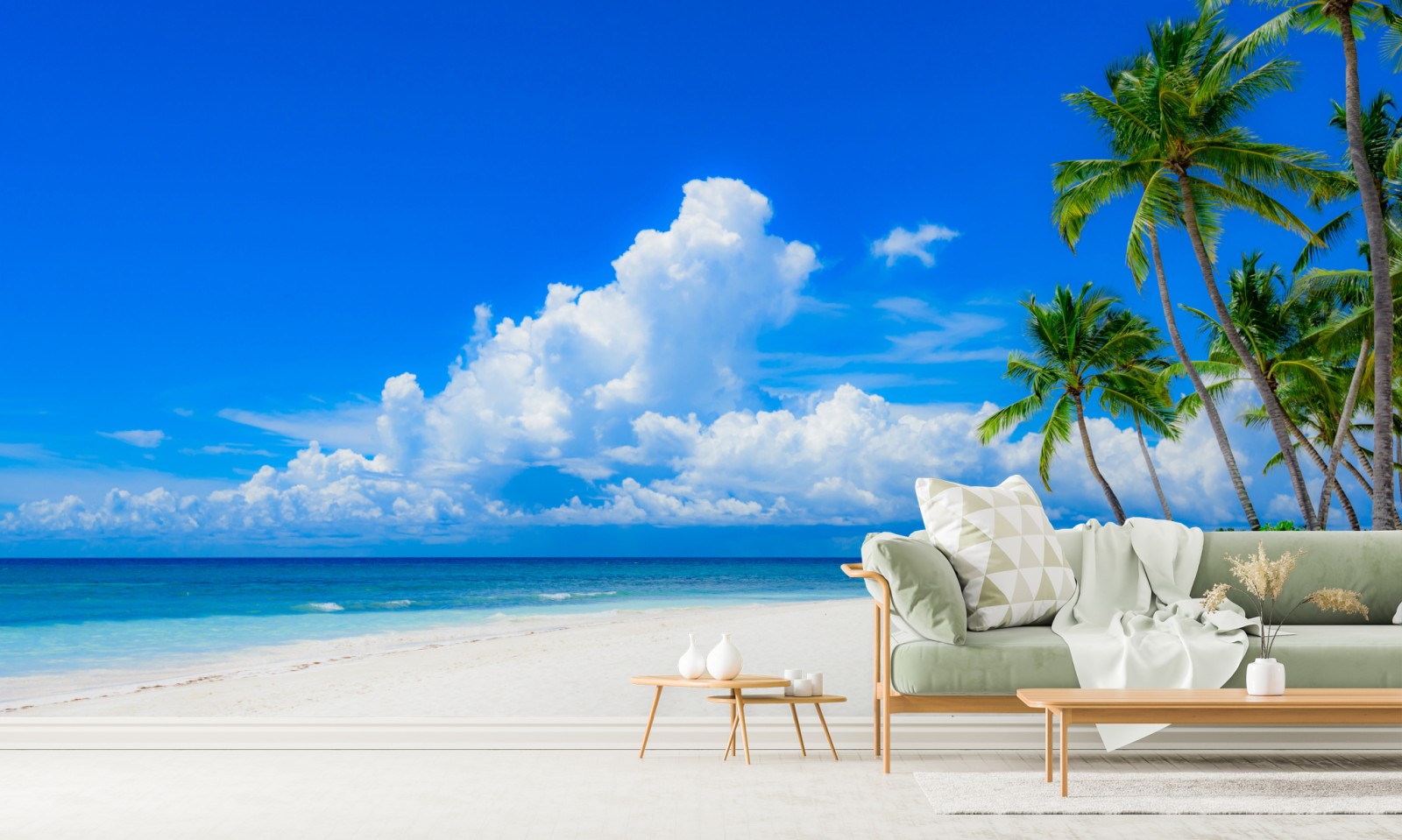 Wprowadź spokój tropikalnej plaży do swojego wnętrza dzięki temu jasnemu pejzażowi z palmami i krystalicznie czystą wodą.