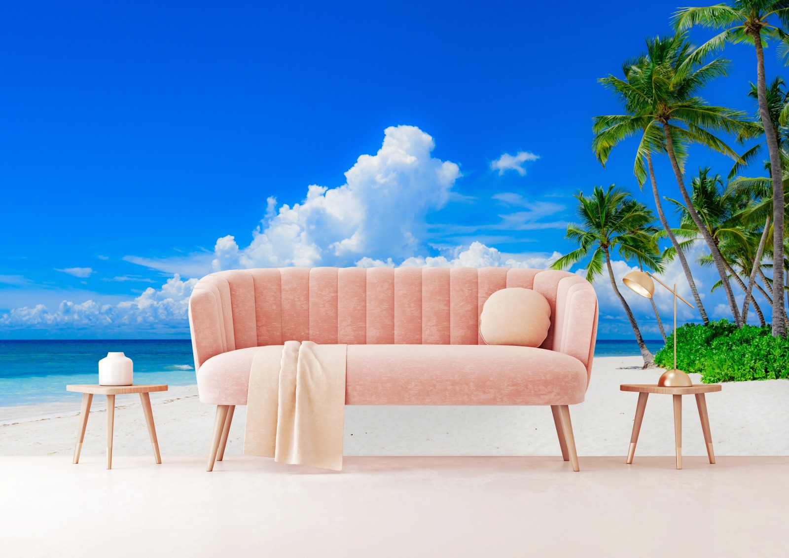 Fototapeta Tropikalna plaża z palmami pod błękitnym niebem