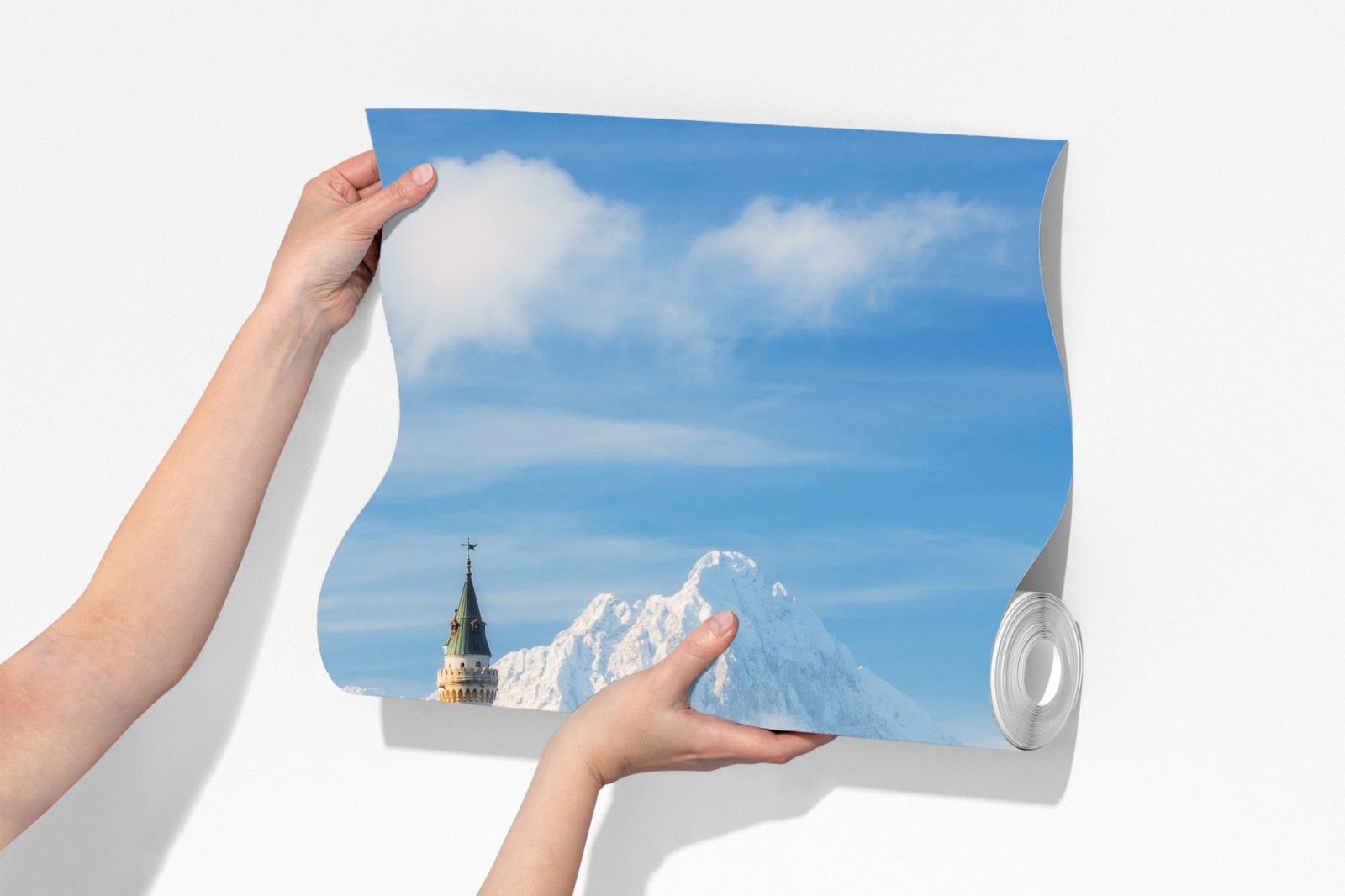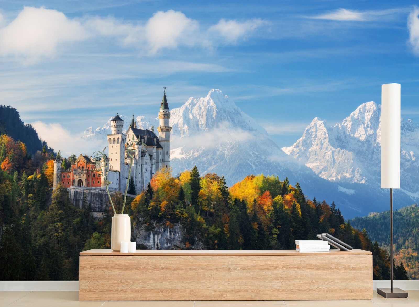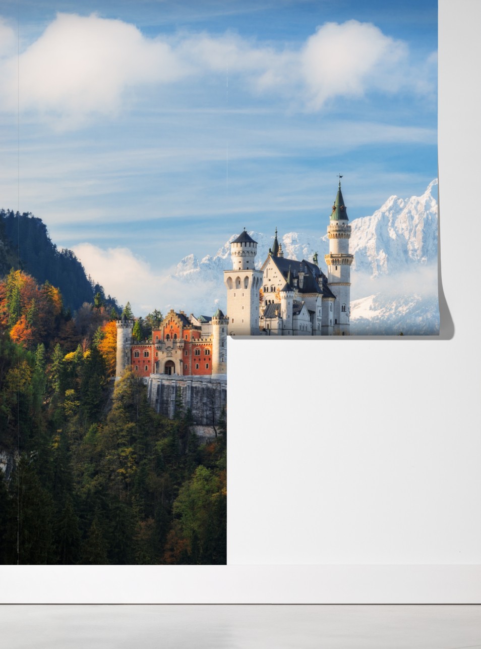 Dodaj ścianom bajkowego uroku dzięki temu widokowi zamku wśród jesiennych lasów i ośnieżonych szczytów.