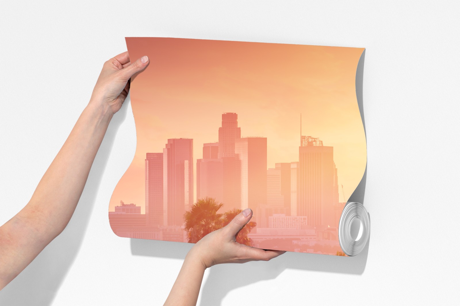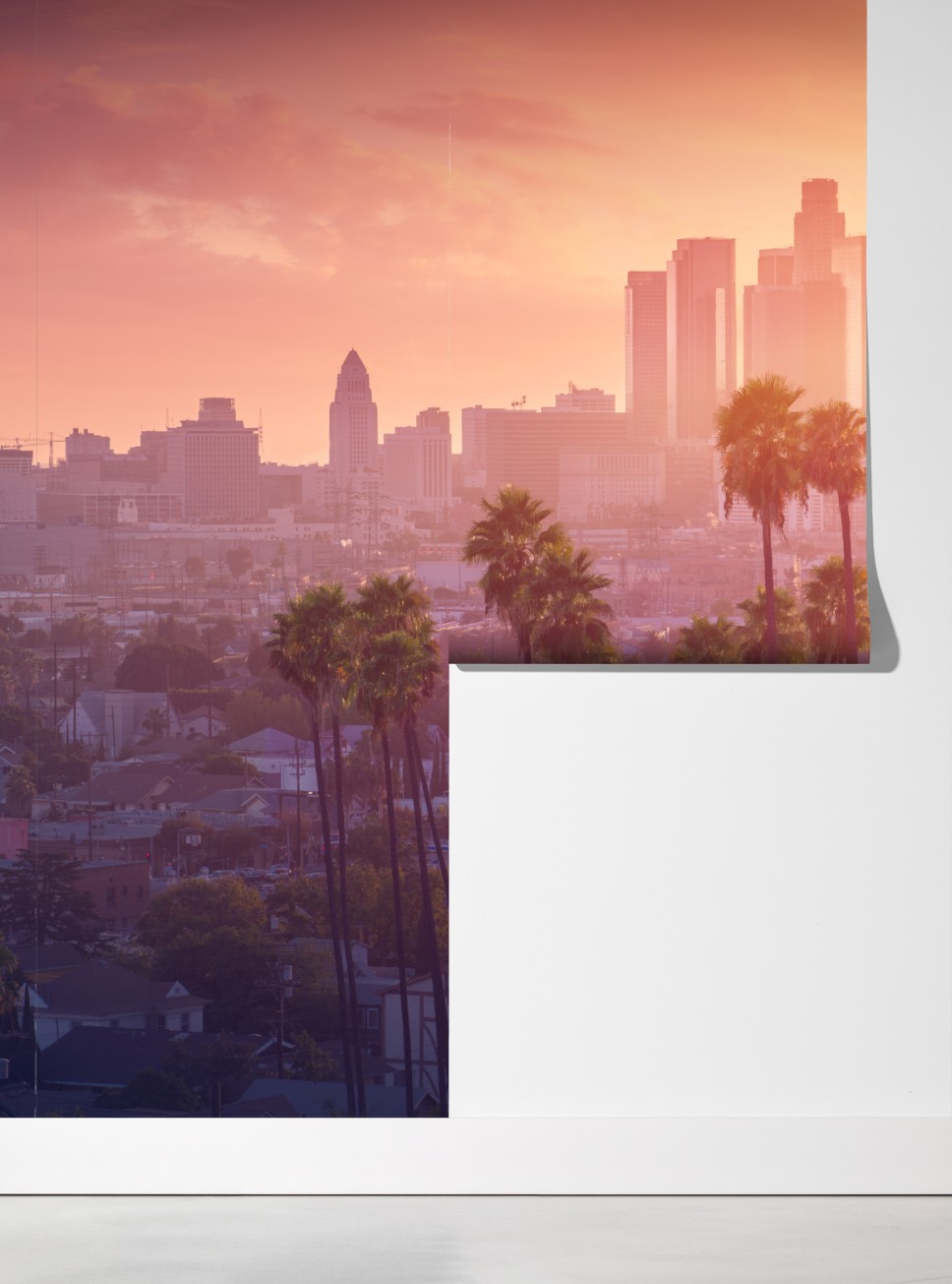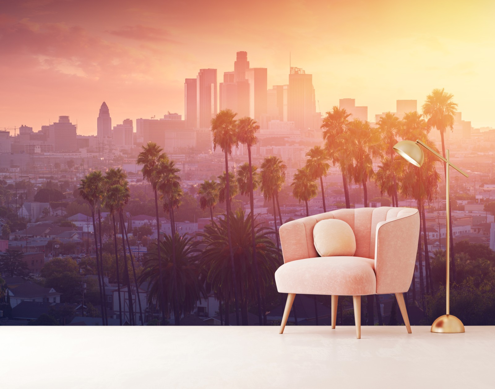 Wprowadź ciepły blask zachodu słońca z Los Angeles do swojego wnętrza dzięki tej żywej panoramie miasta z sylwetkami palm.