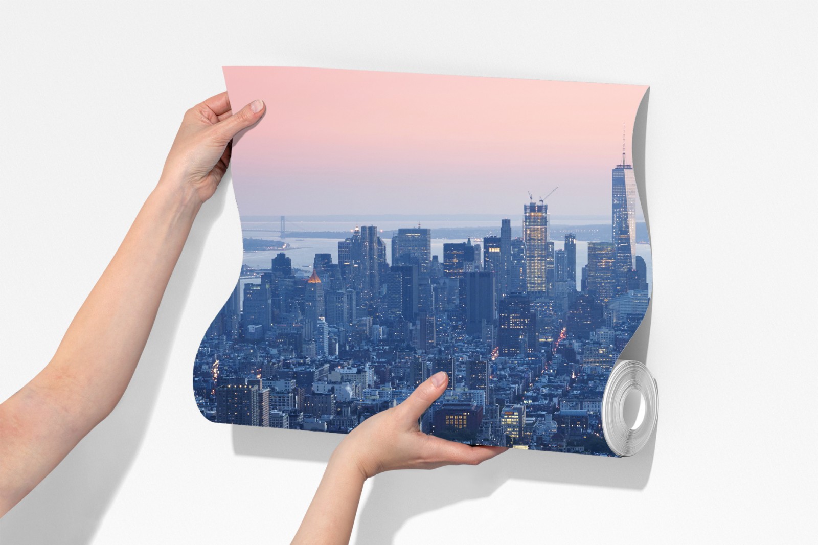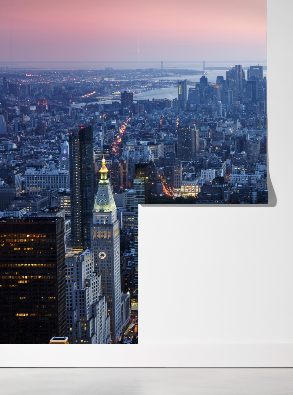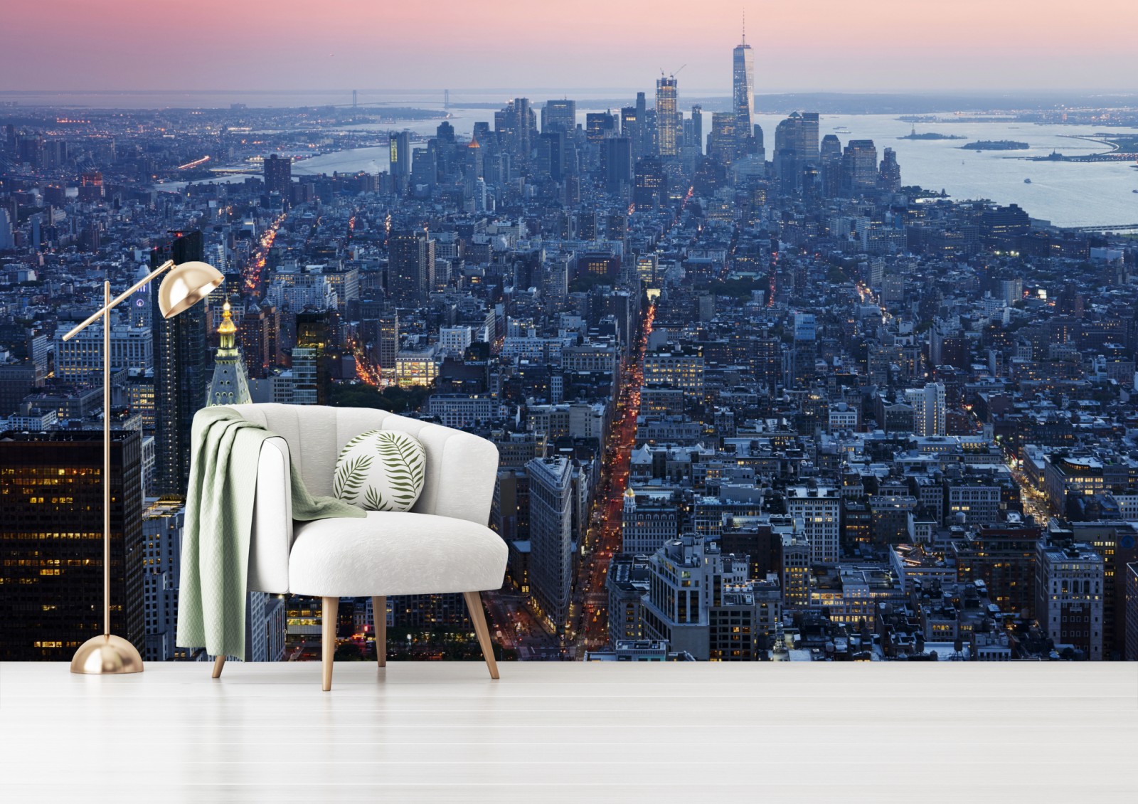 Wprowadź do wnętrza zachwycający widok lotniczy Manhattanu o zachodzie słońca, który doda miejskiego charakteru i ciepłych tonów.