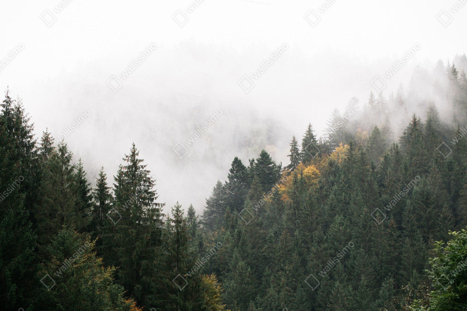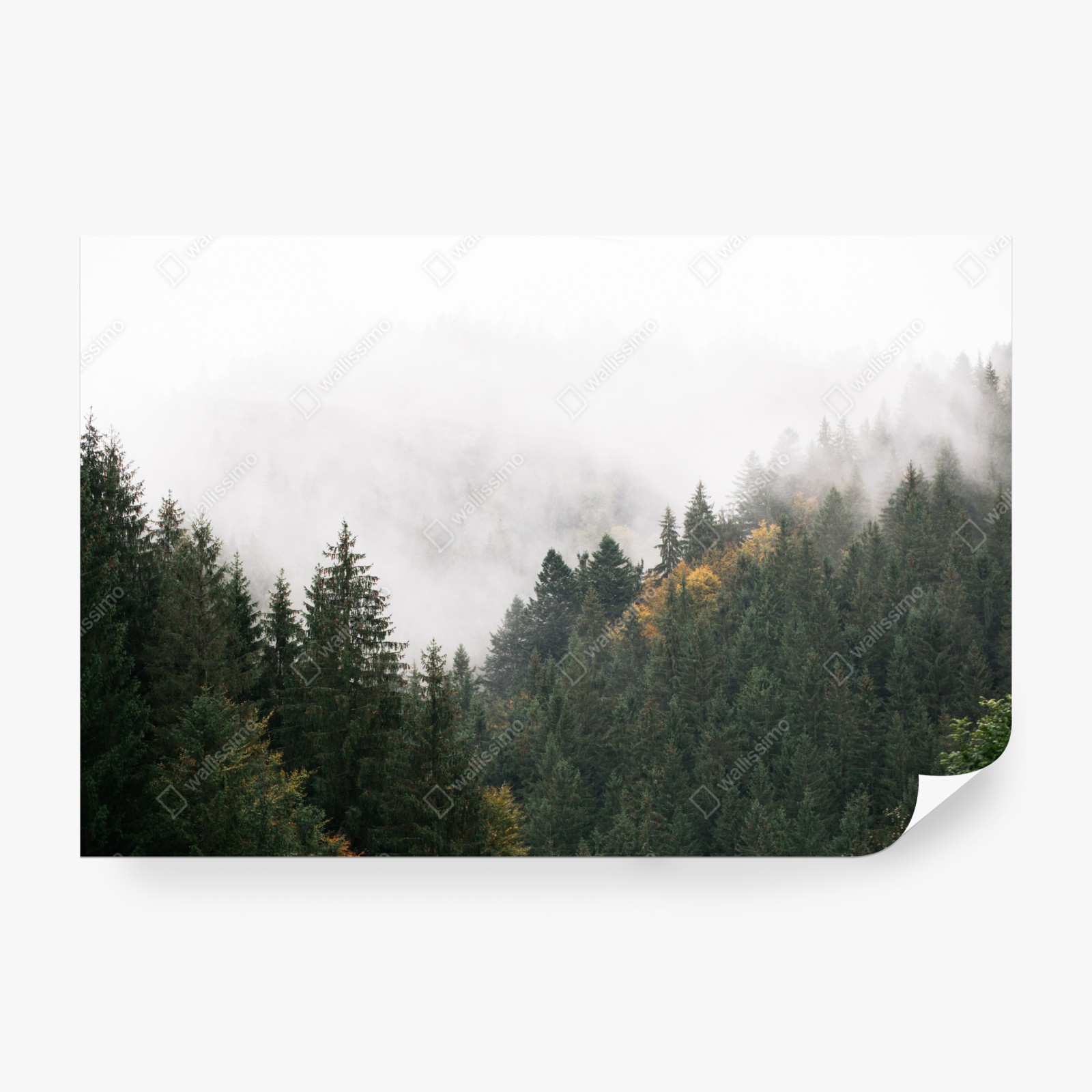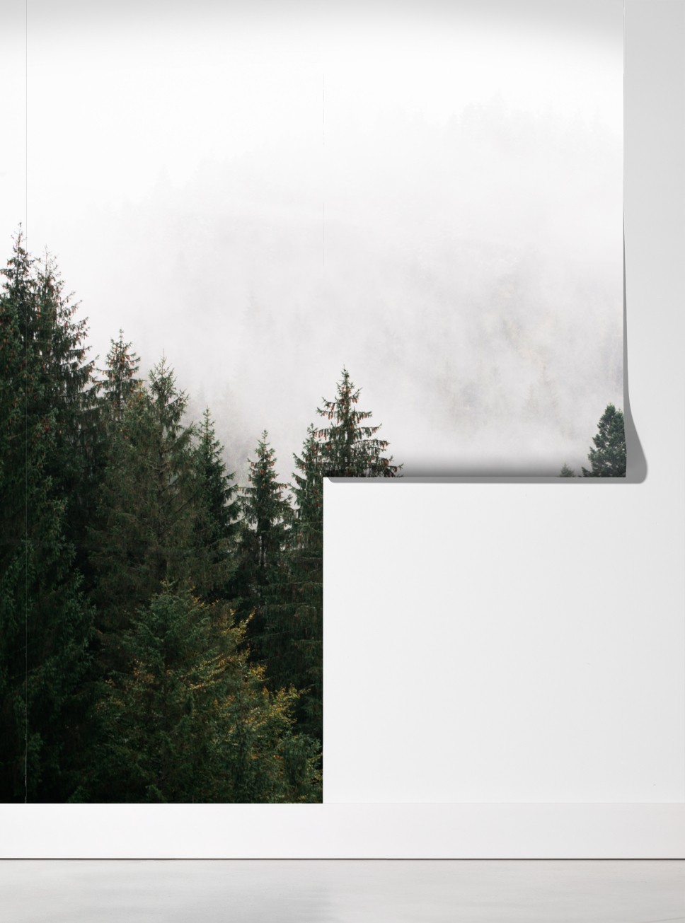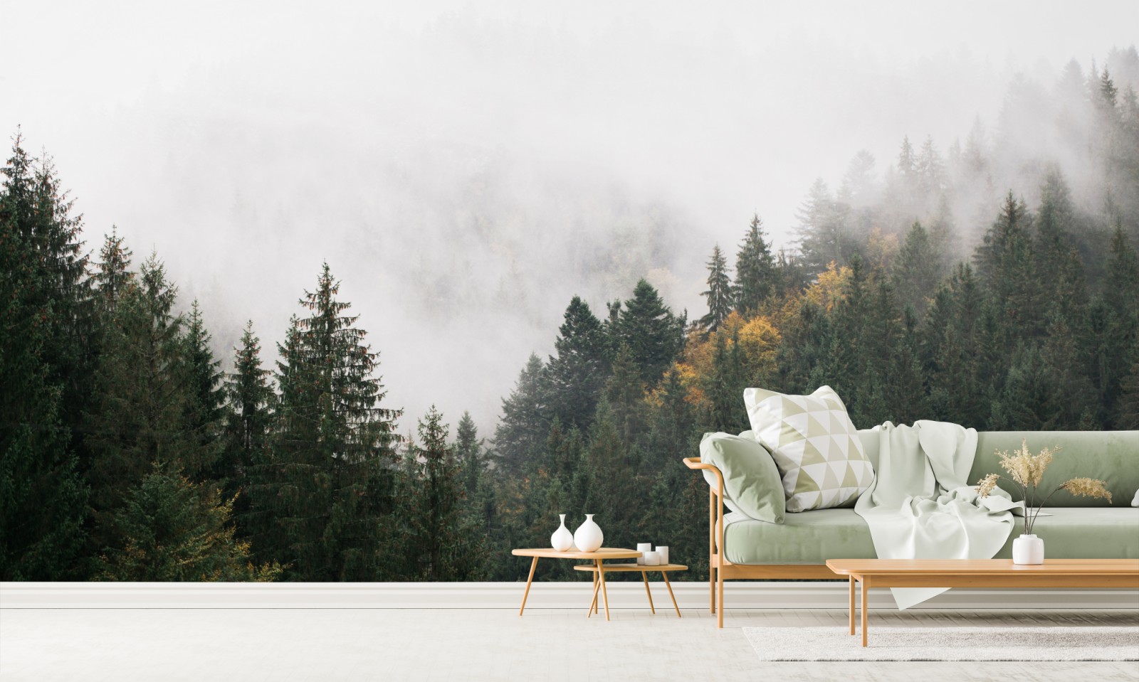 Wprowadź uspokajający klimat natury do swojego wnętrza dzięki temu motywowi z górskim lasem pokrytym miękką mgłą.