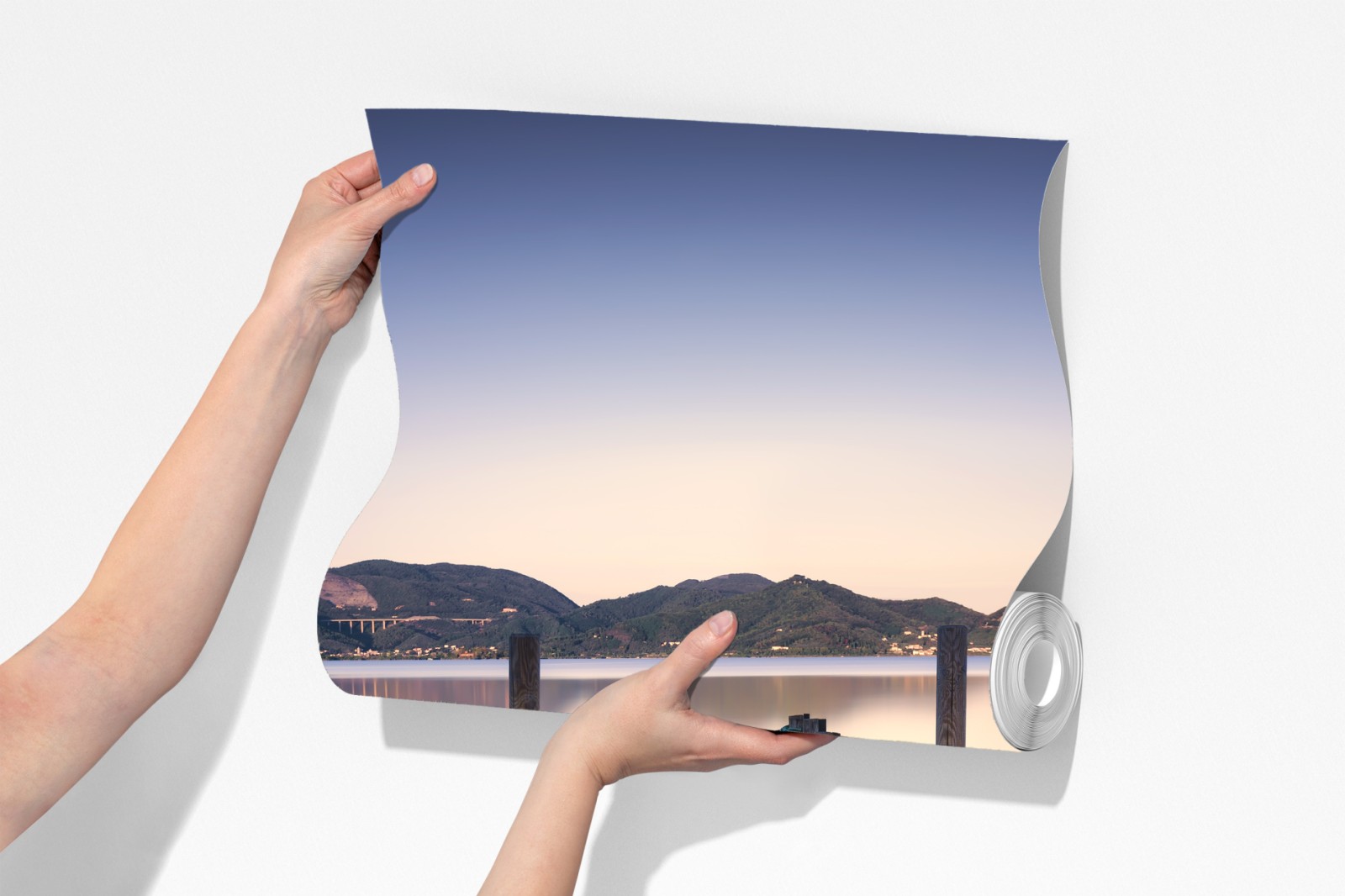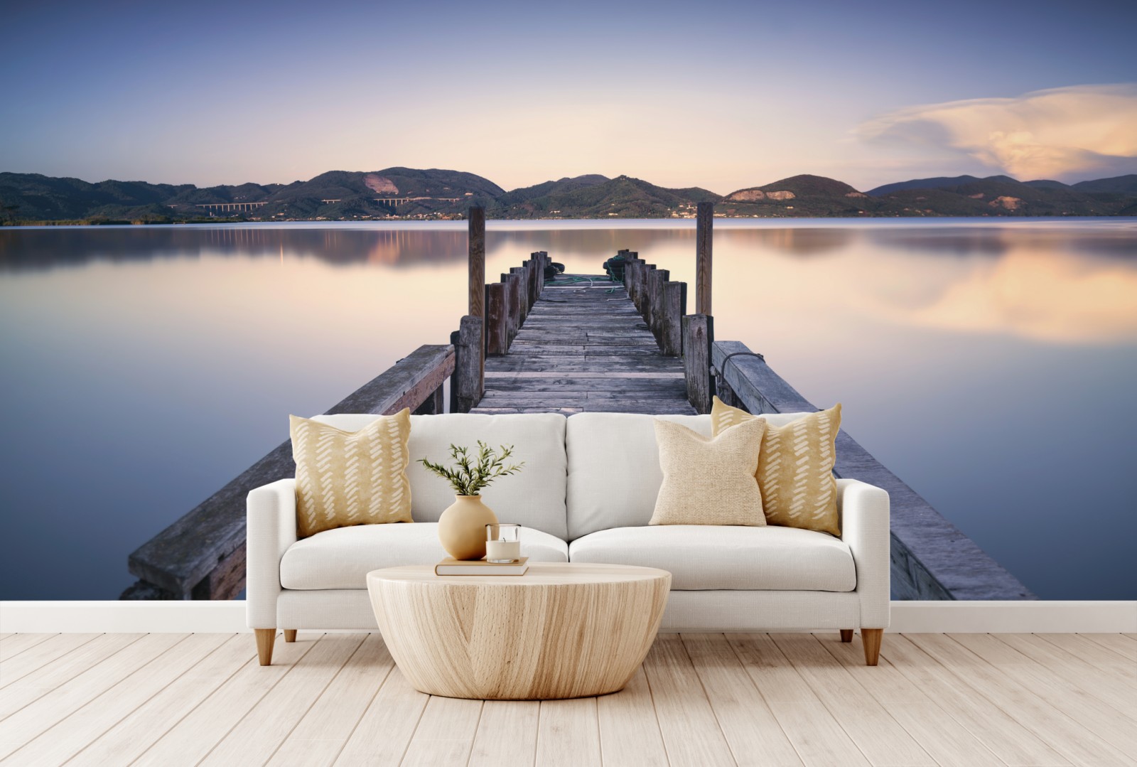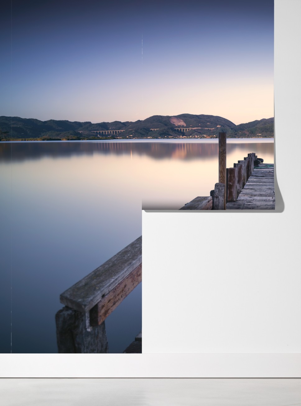 Wprowadź do wnętrza spokój dzięki zdjęciu drewnianego pomostu nad jeziorem Versilia Massaciuccoli z pastelowym niebem i lustrzanymi odbiciami.