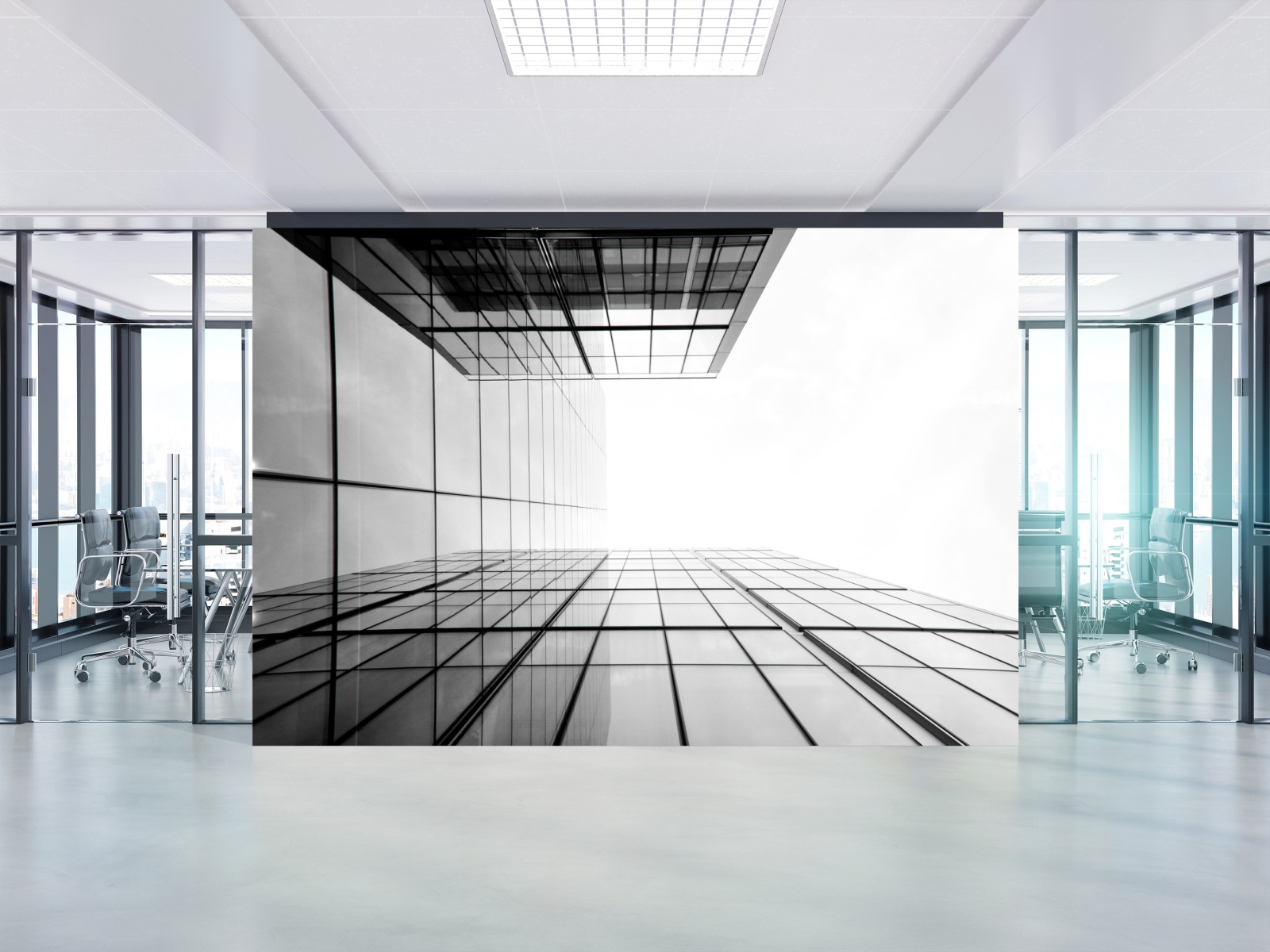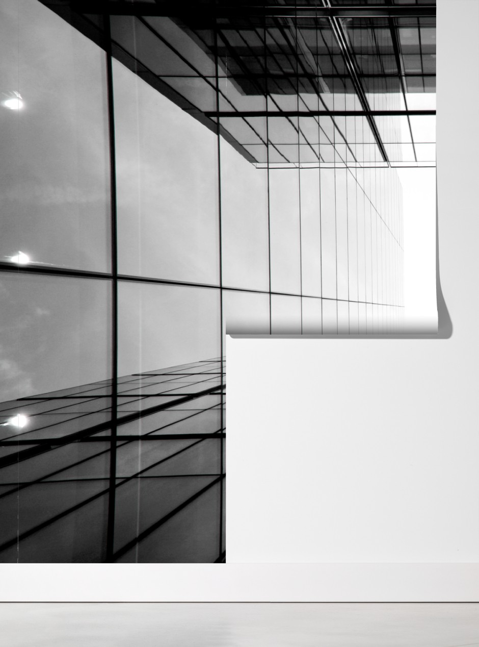 Dodaj elegancji wnętrzu dzięki minimalistycznemu czarno-białemu zdjęciu nowoczesnego wieżowca z wyraźnymi liniami architektonicznymi.