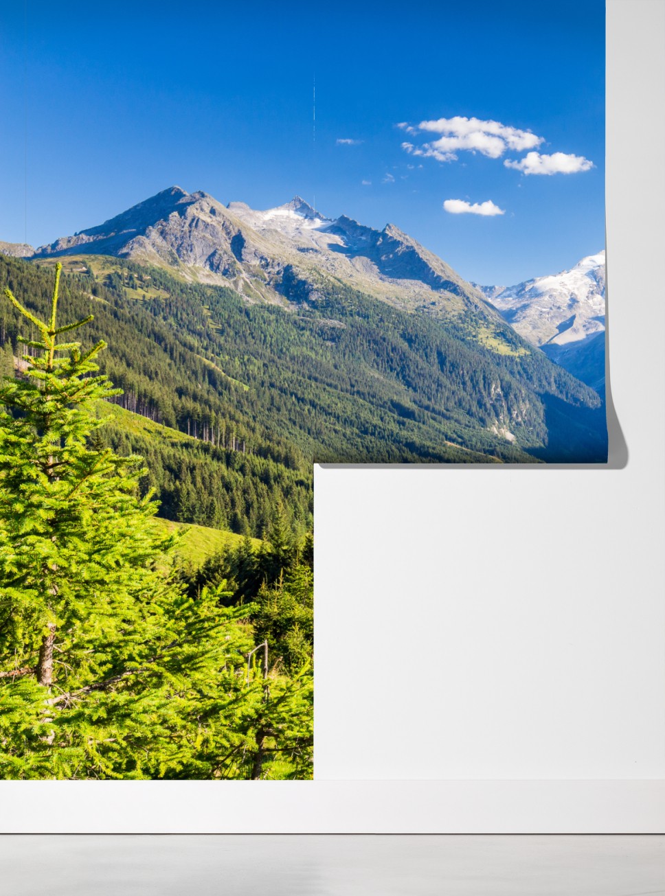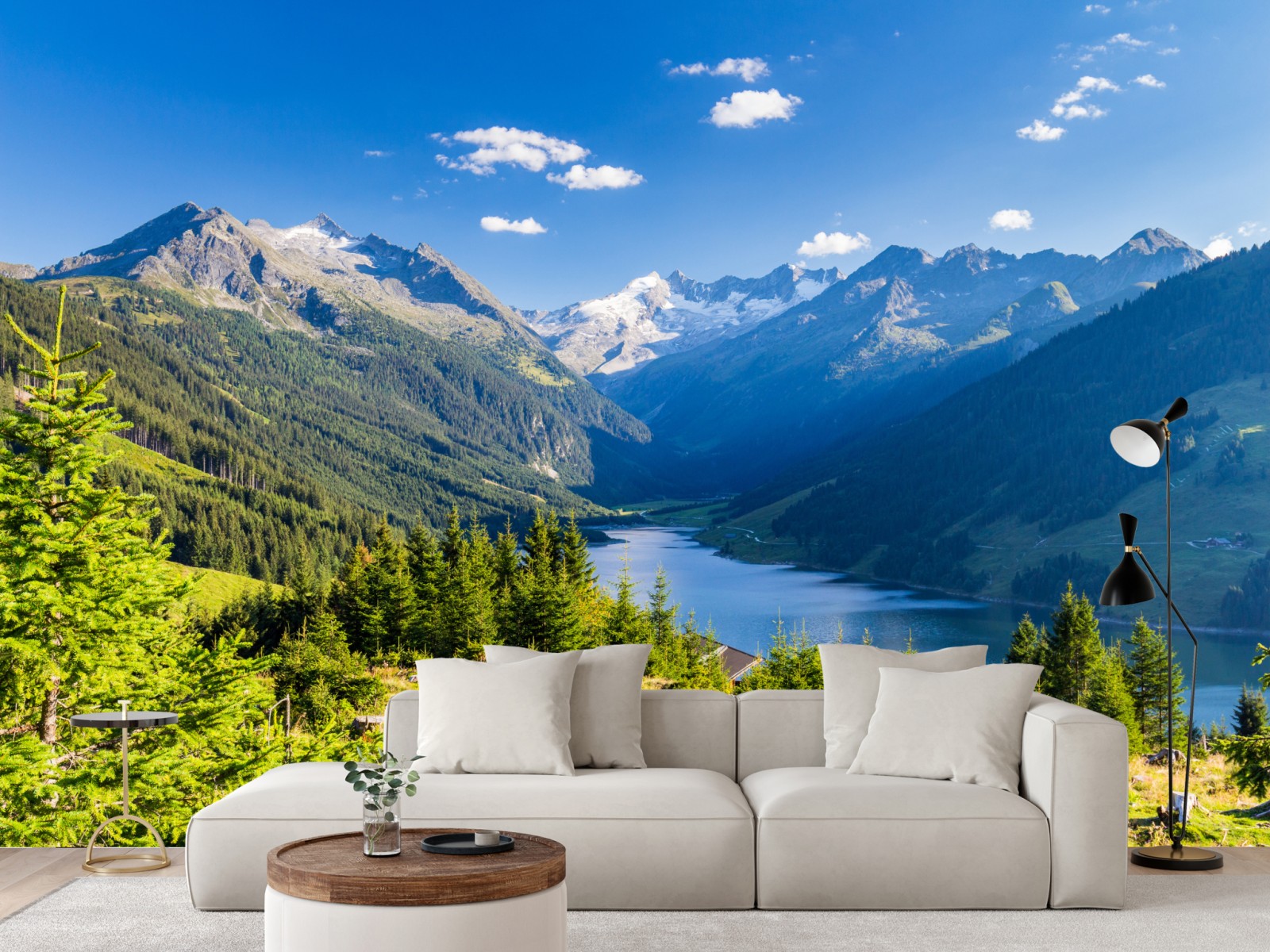 Wprowadź do wnętrza spokój alpejskiego krajobrazu z górami, krystalicznym jeziorem i bujnymi lasami.