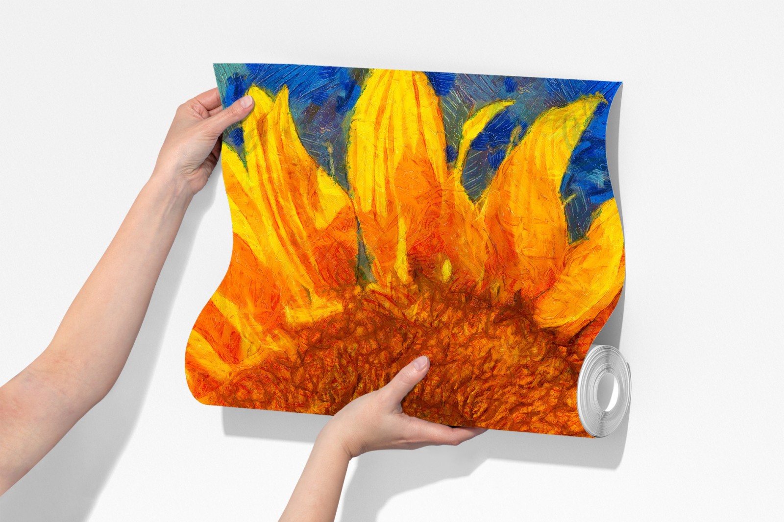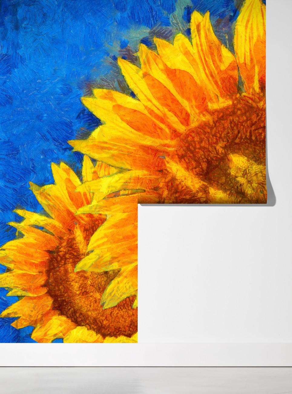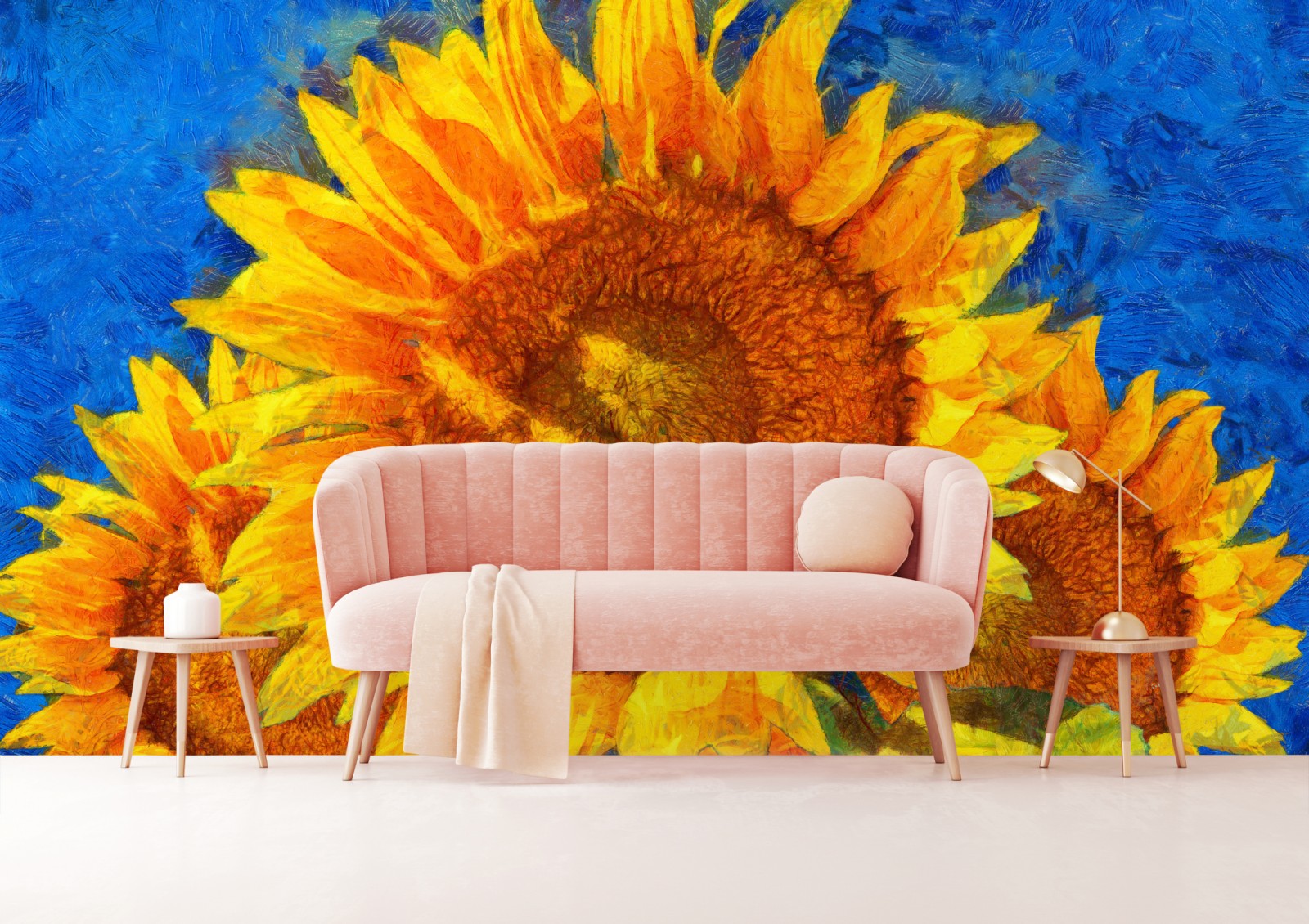 Wprowadź ciepło i energię do wnętrza dzięki żywemu obrazowi słoneczników w stylu Van Gogha z intensywnymi żółciami na kontrastowym niebieskim tle.