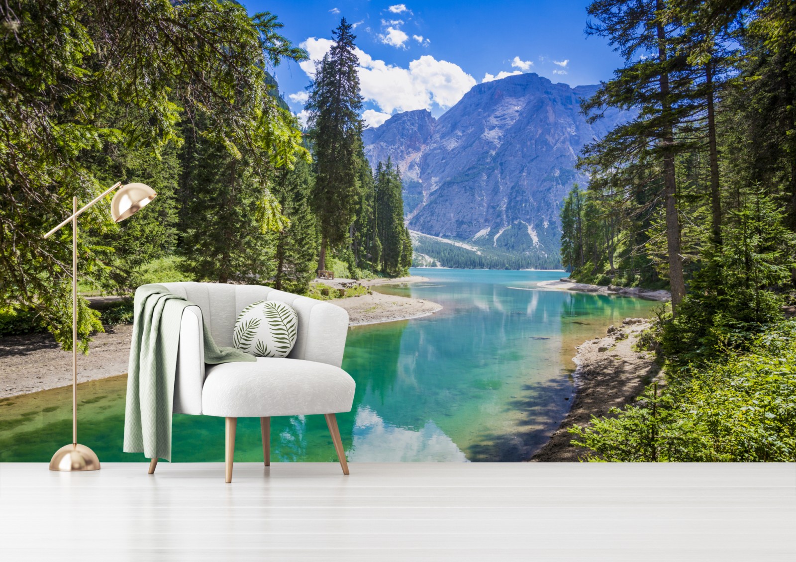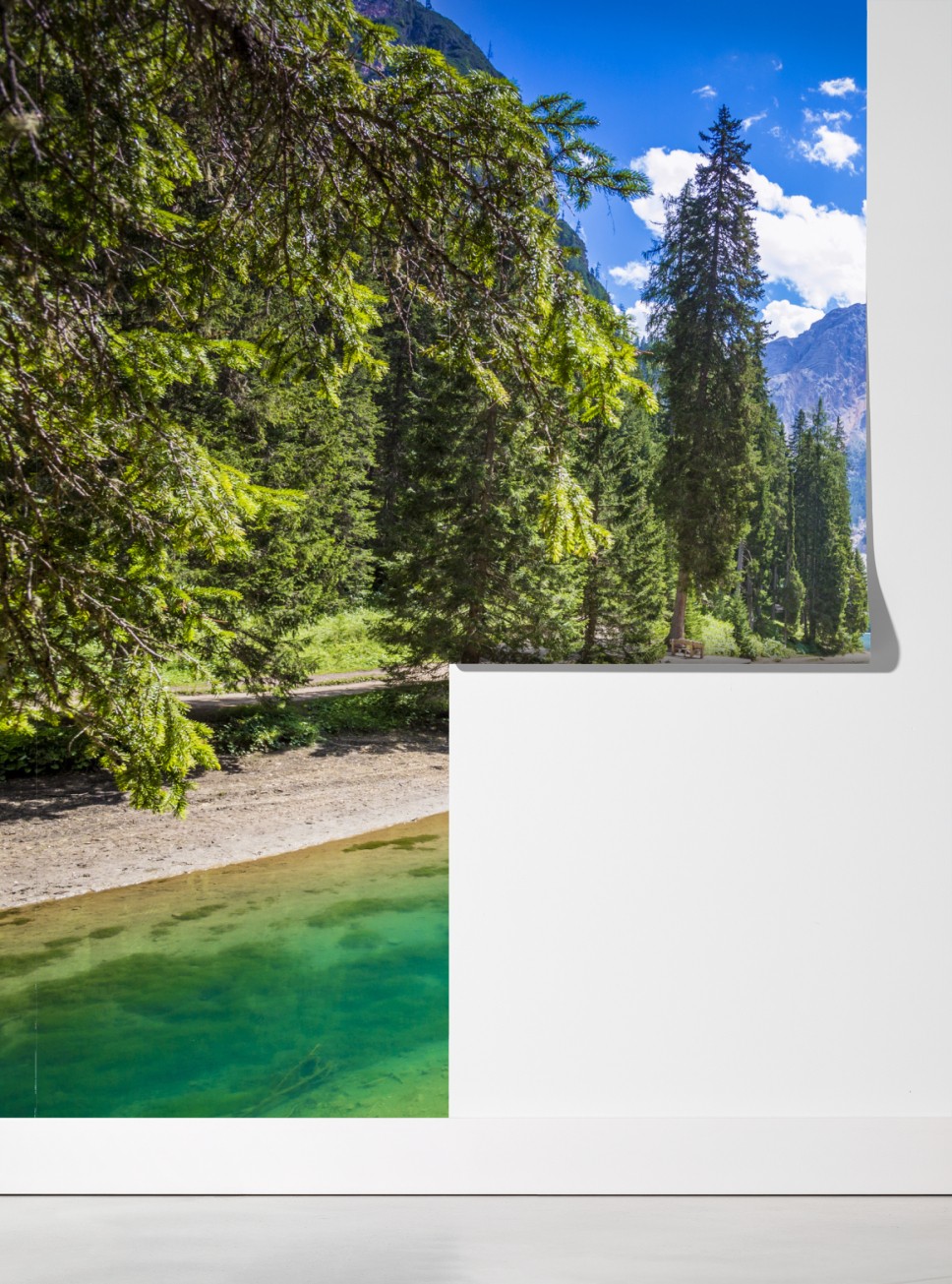 Wprowadź spokój alpejskiego jeziora do swojego wnętrza dzięki widokowi turkusowej wody, strzelistych sosen i imponujących gór.