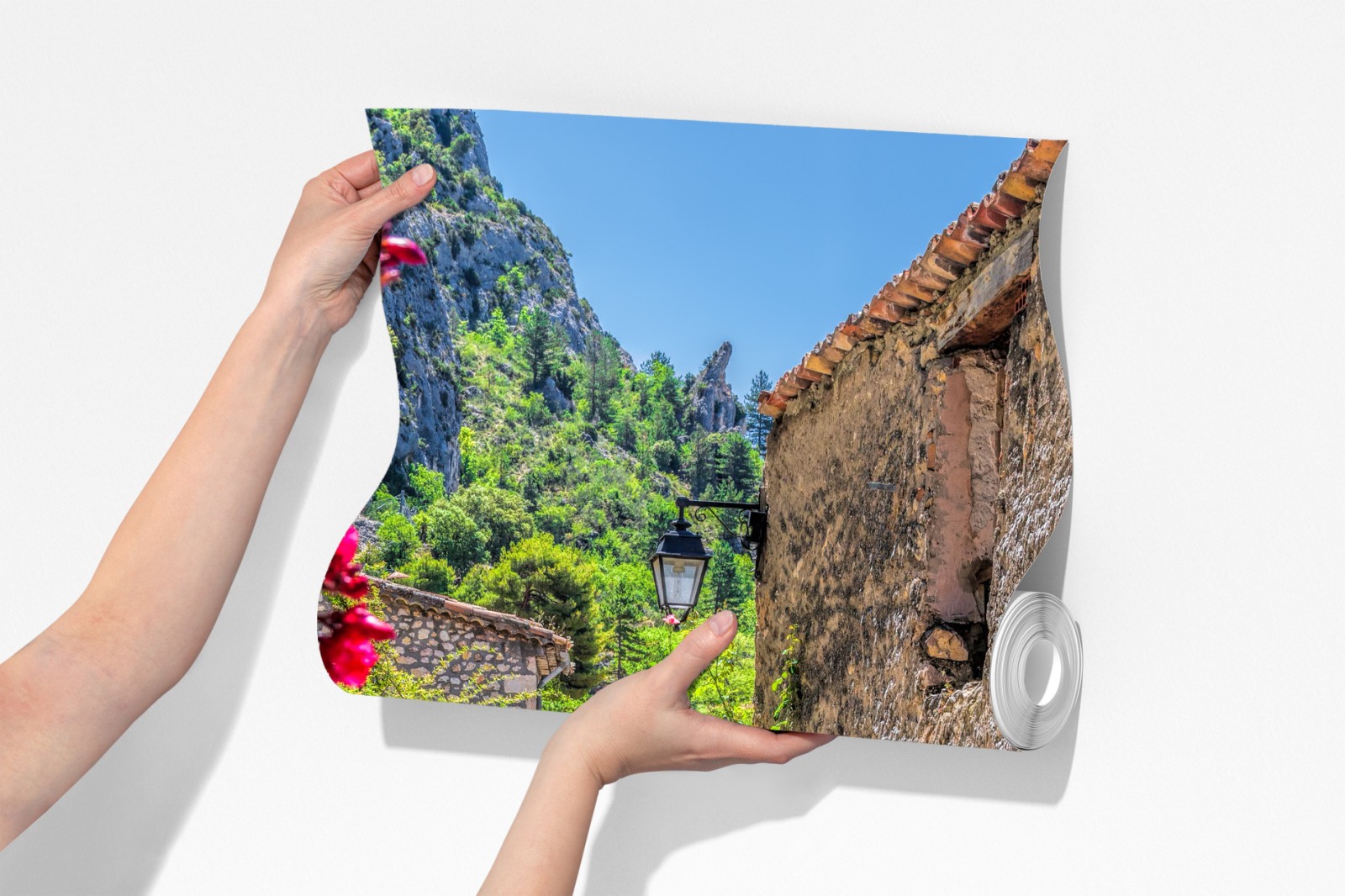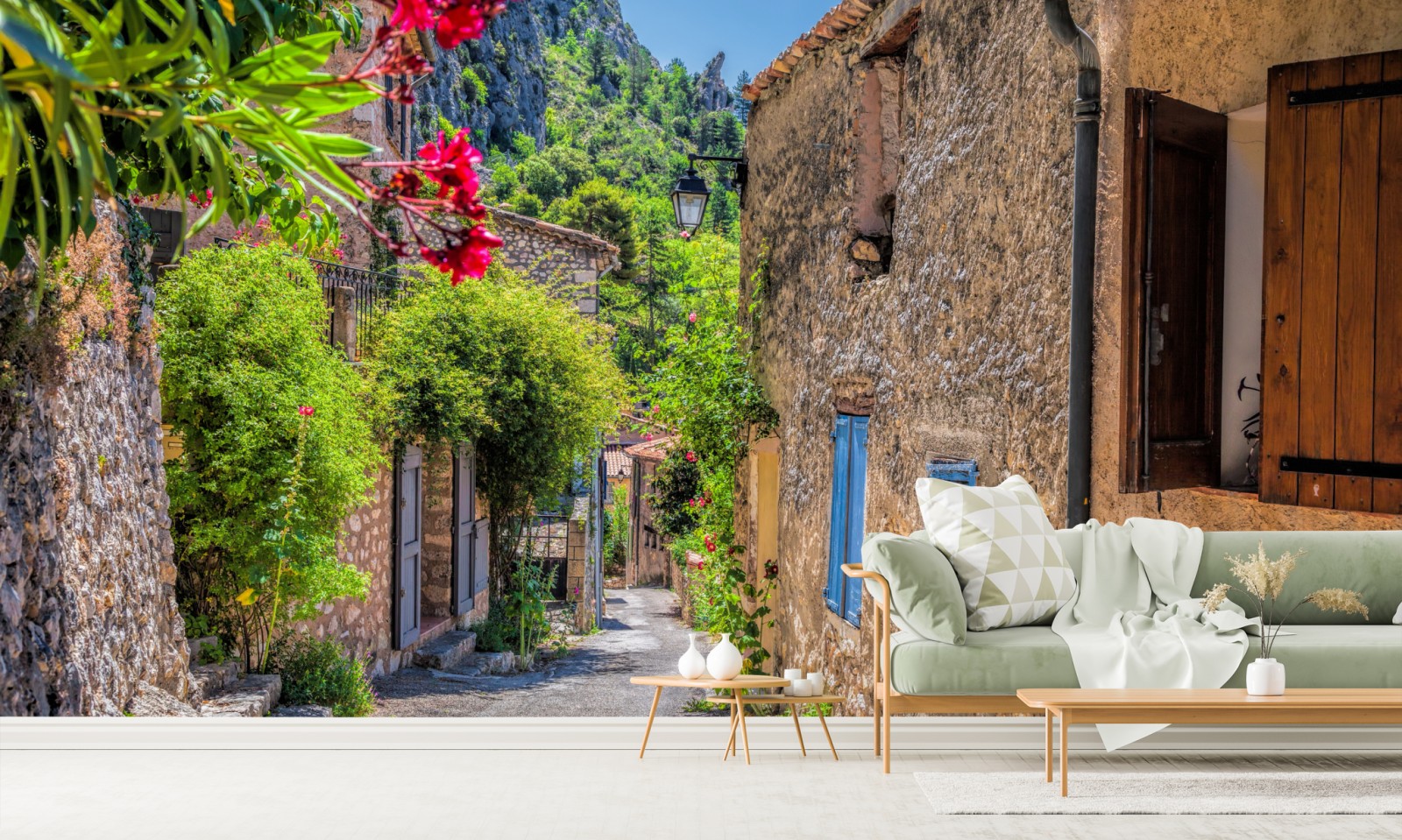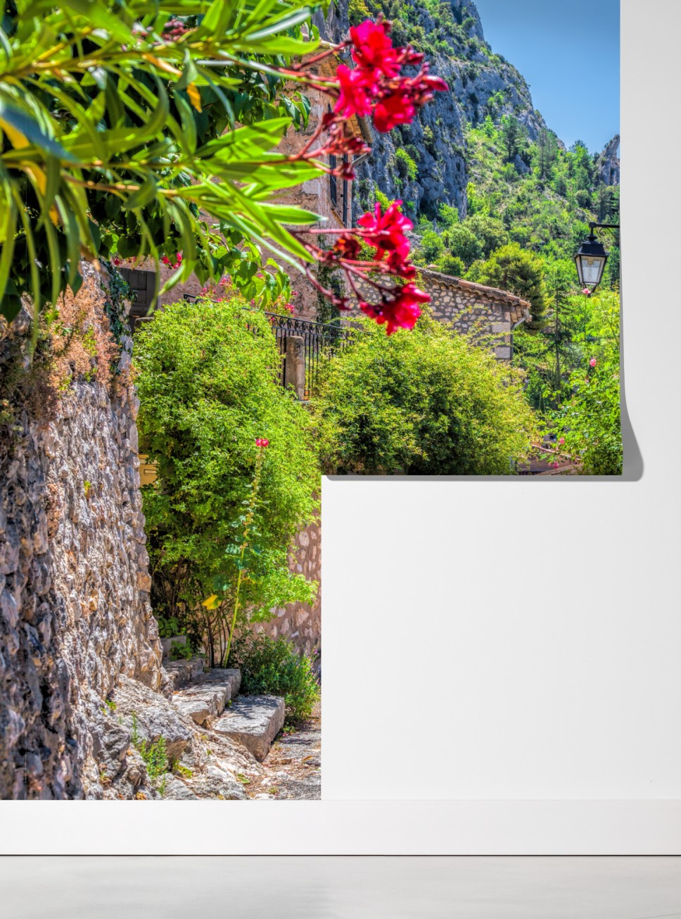 Wprowadź słoneczny urok Moustiers Sainte Marie do wnętrza dzięki barwnej scenie kamiennych domów, niebieskich okiennic i kwiatów.