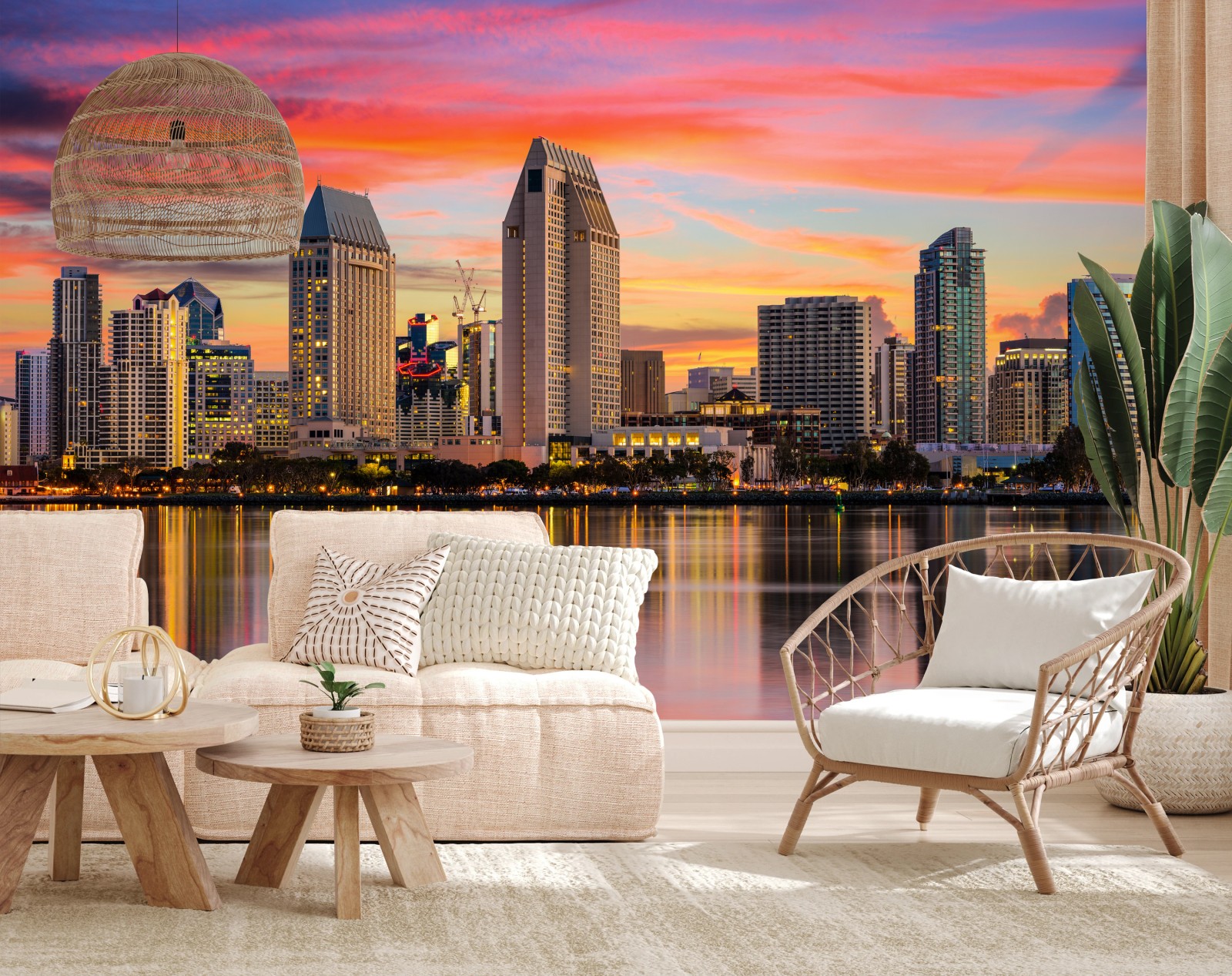 - panorama miasta, krajobraz miejski, zachód słońca, wieżowce, linia horyzontu, odbicia w wodzie, kolorowe niebo, san diego, nadmorski widok, fotografia miasta