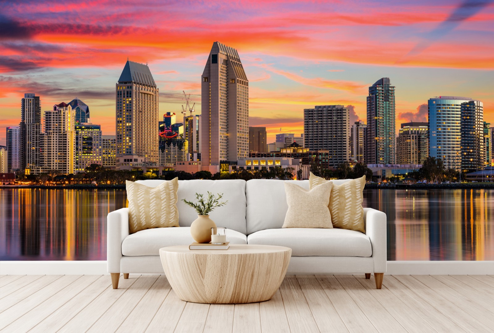 Dodaj energii wnętrzu dzięki barwnej panoramie San Diego o zachodzie słońca z odbiciami w wodzie i dramatycznym niebem.