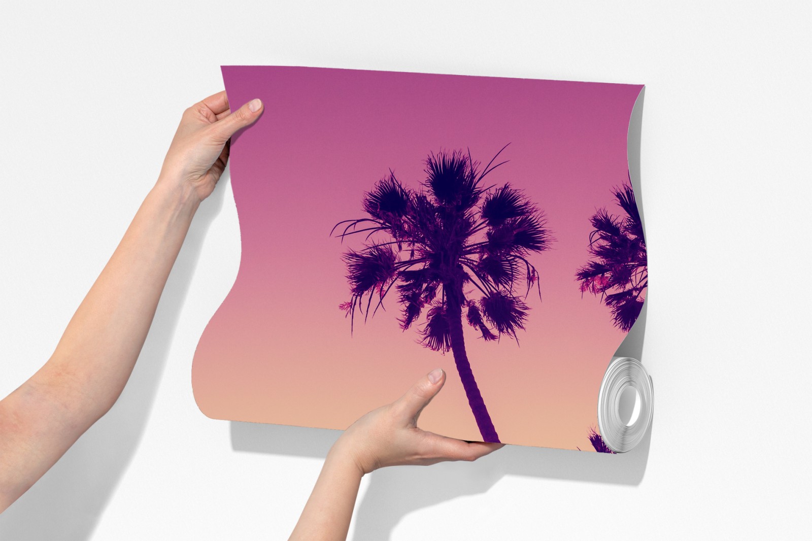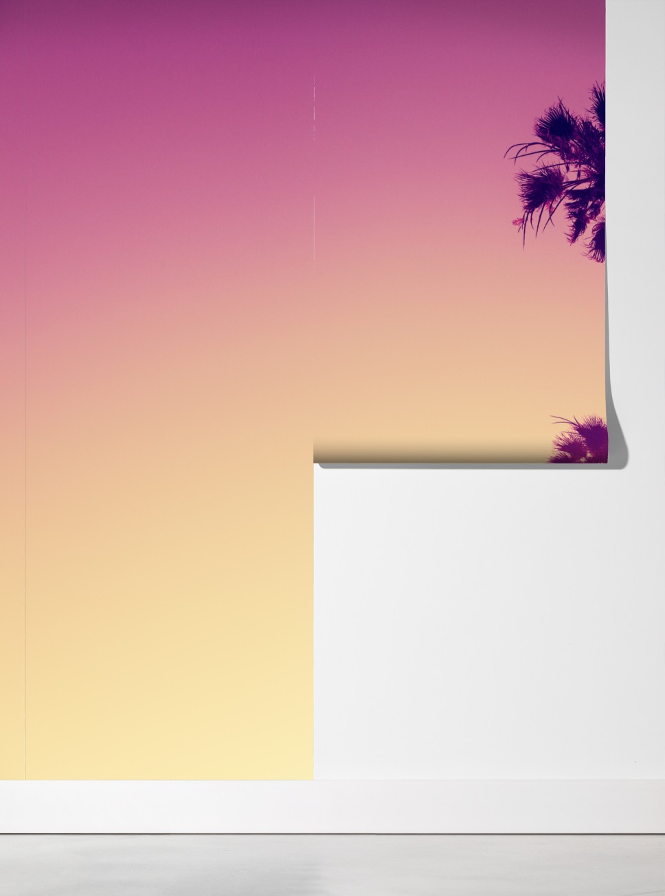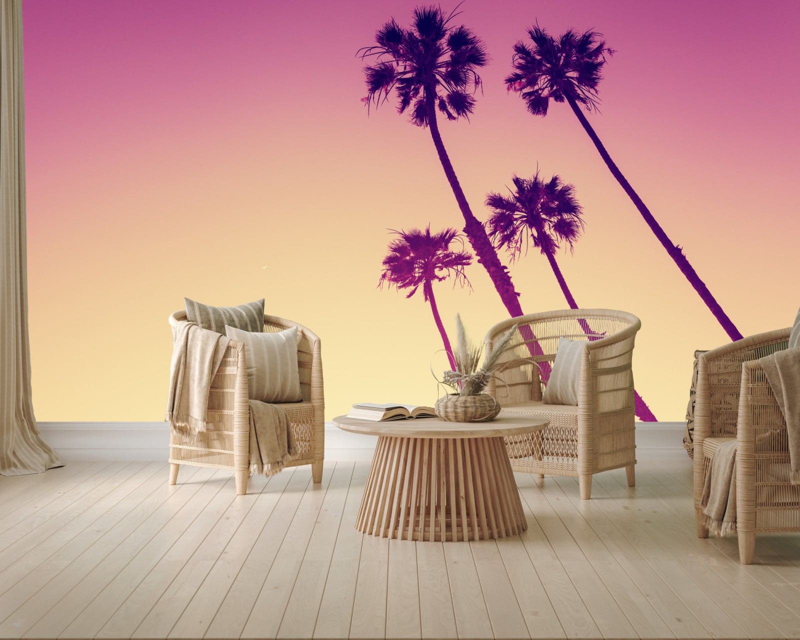 Wprowadź do wnętrza atmosferę letniego zachodu słońca z pasmowym niebem i sylwetkami palm.