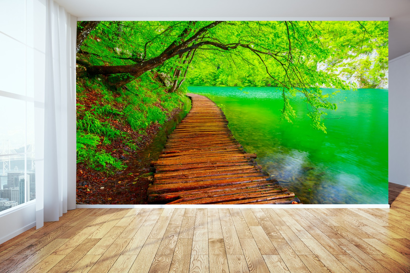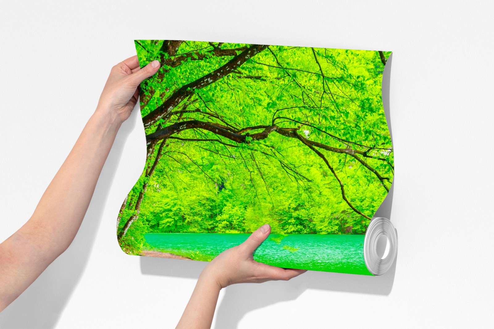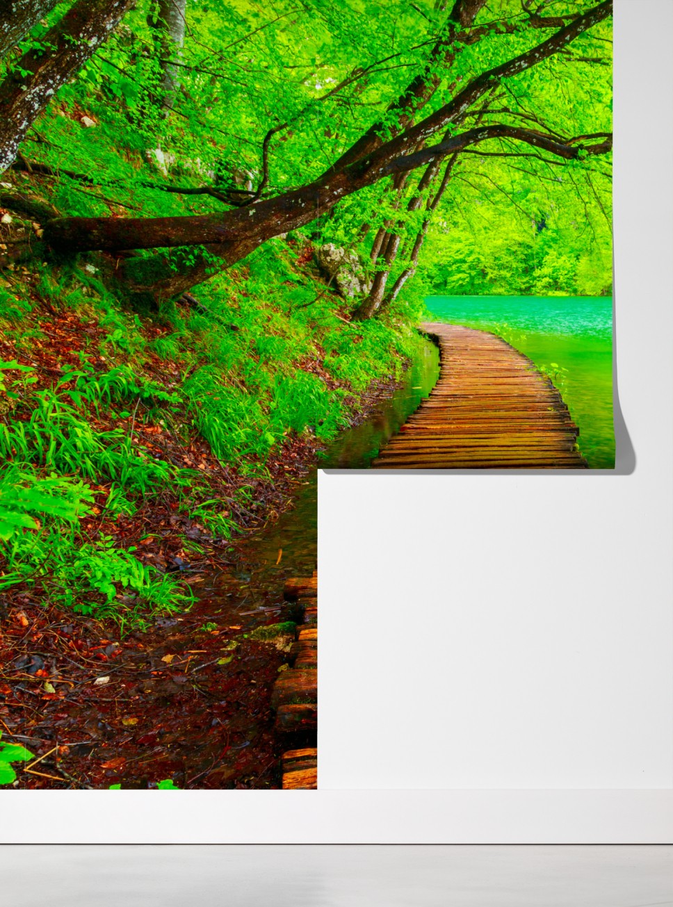 Odkryj spokojną ścieżkę nad jeziorem uchwyconą w intensywnych zielonych i turkusowych barwach, idealna do wnętrz, które potrzebują kontaktu z naturą.